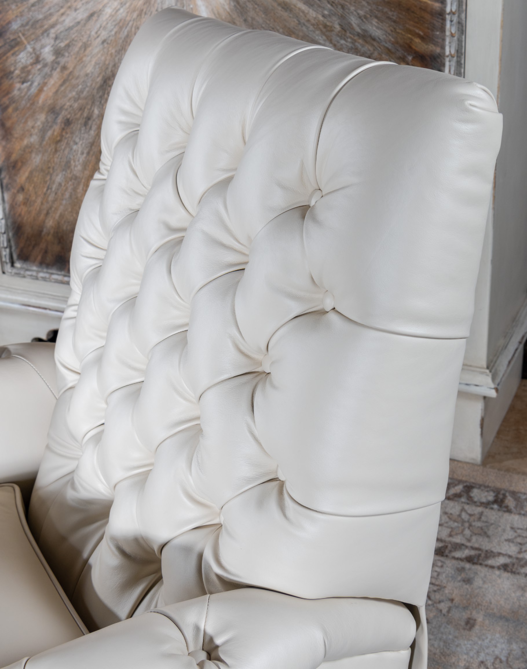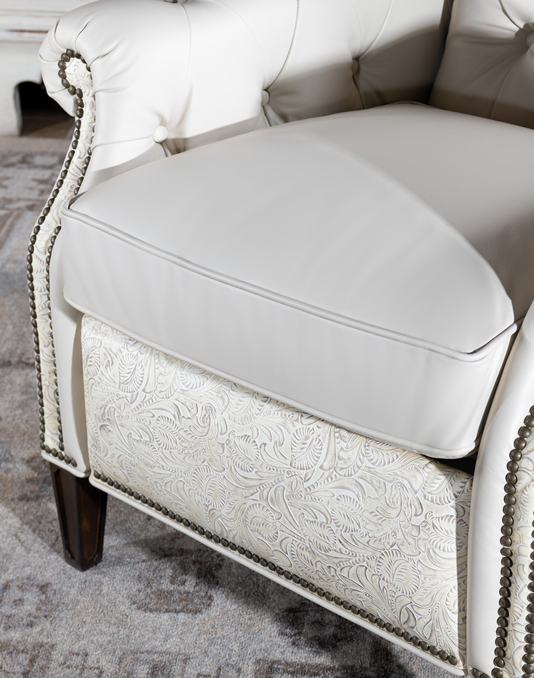 Brighten up your living space with our Starlight Leather Recliner. Featuring a supple protected, off-white leather with a decorative stamped leather accent in the arm panels and kick plate, this recliner adds a touch of elegance and style to any room. Designed with deep button tufting on the back, the Starlight Recliner provides firm back support and a stylish look. Its protected off-white leather is resistant to stains and spills and can easily be cleaned with most leather cleaners, making it a great addition for families with kids. Crafted with exceptional quality and expert craftsmanship, the Starlight Leather Recliner is 100 percent American-made and built to last. It's the perfect contrast to darker furniture and will brighten up any living space. Order now and experience the ultimate in comfort and style with our Starlight Leather Recliner.