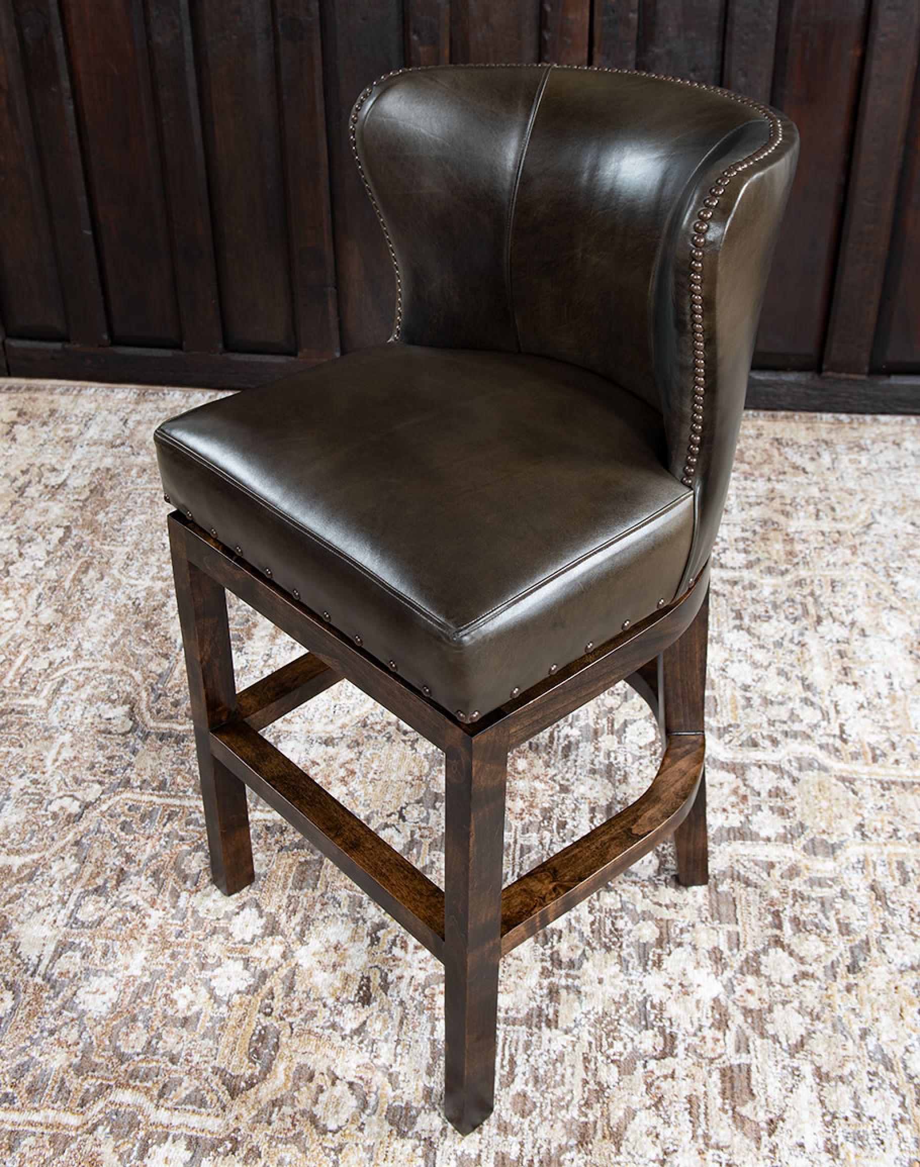 Designed with a functional ball bearing swivel mechanism, the stool includes a soft return for easy movement. The gently curved backrest offers comfort and support, while antique brass nailhead trim adds a refined detail along the edges. The base is finished in a dark walnut tone to complement the leather’s earthy color.