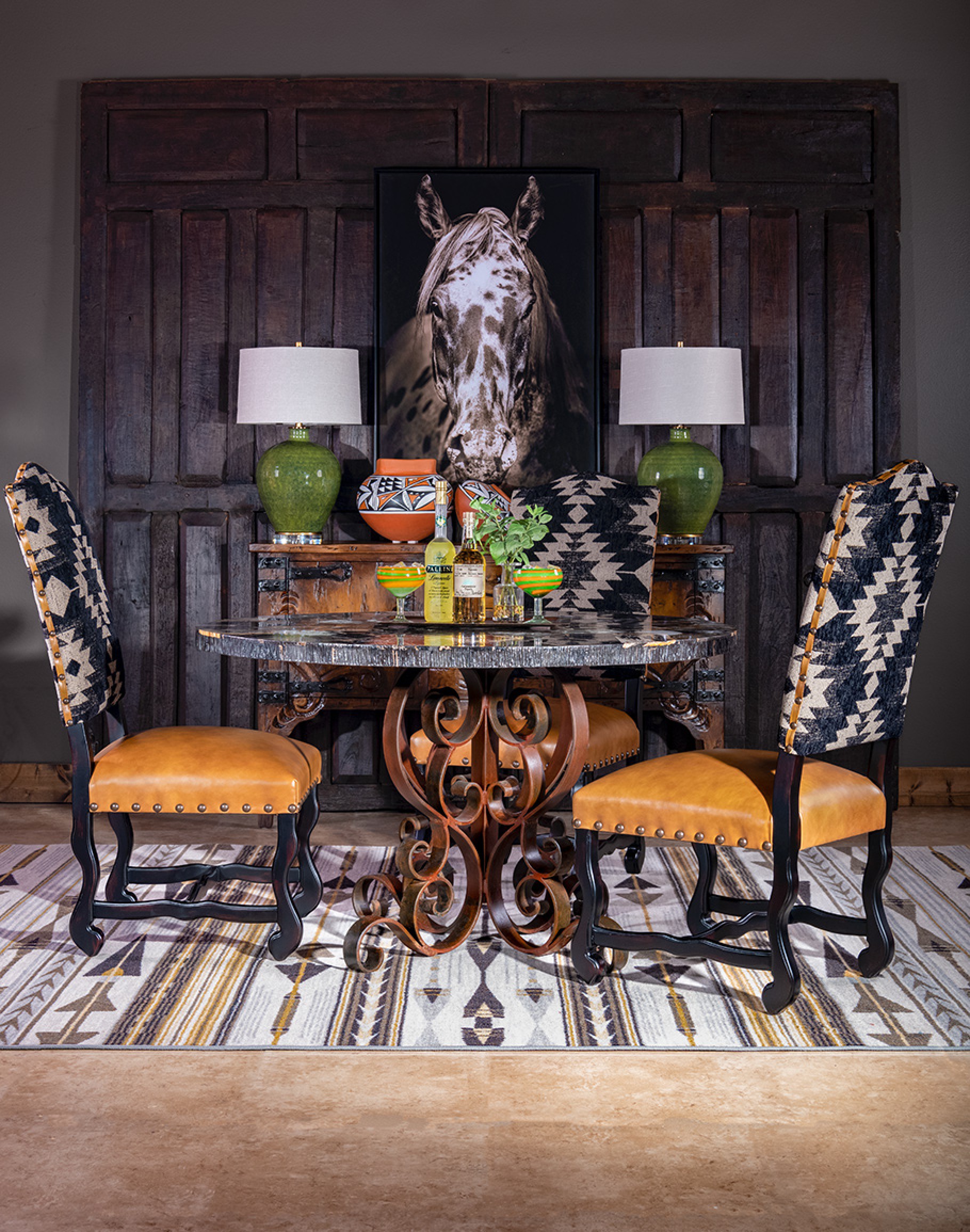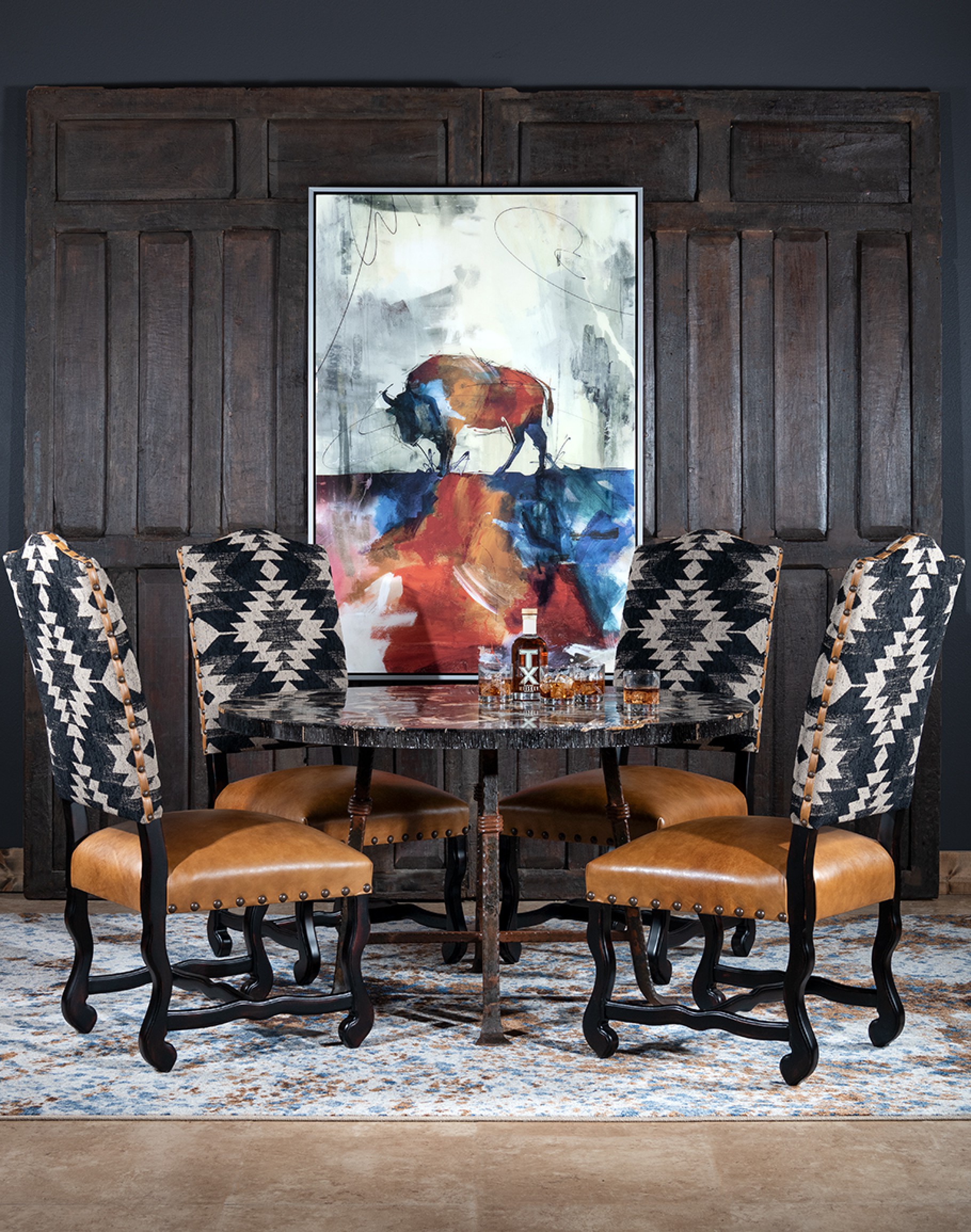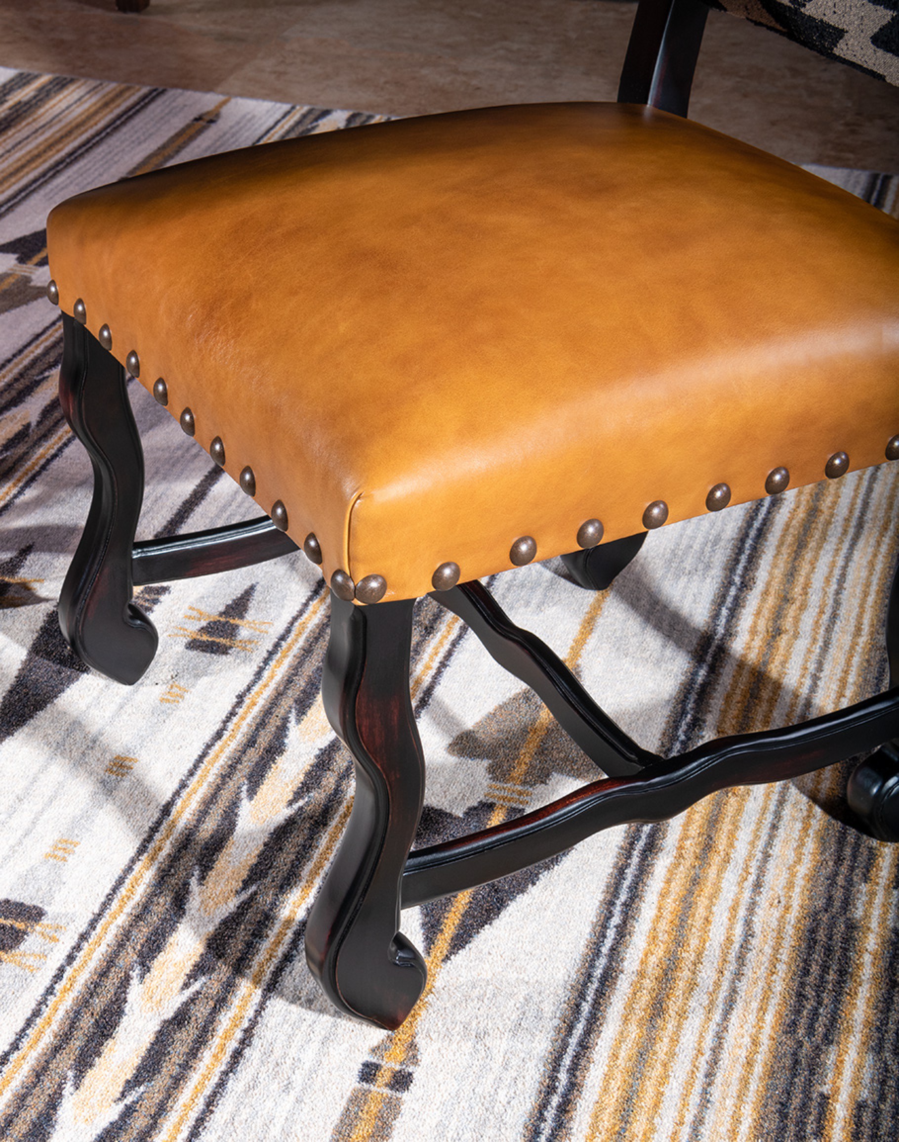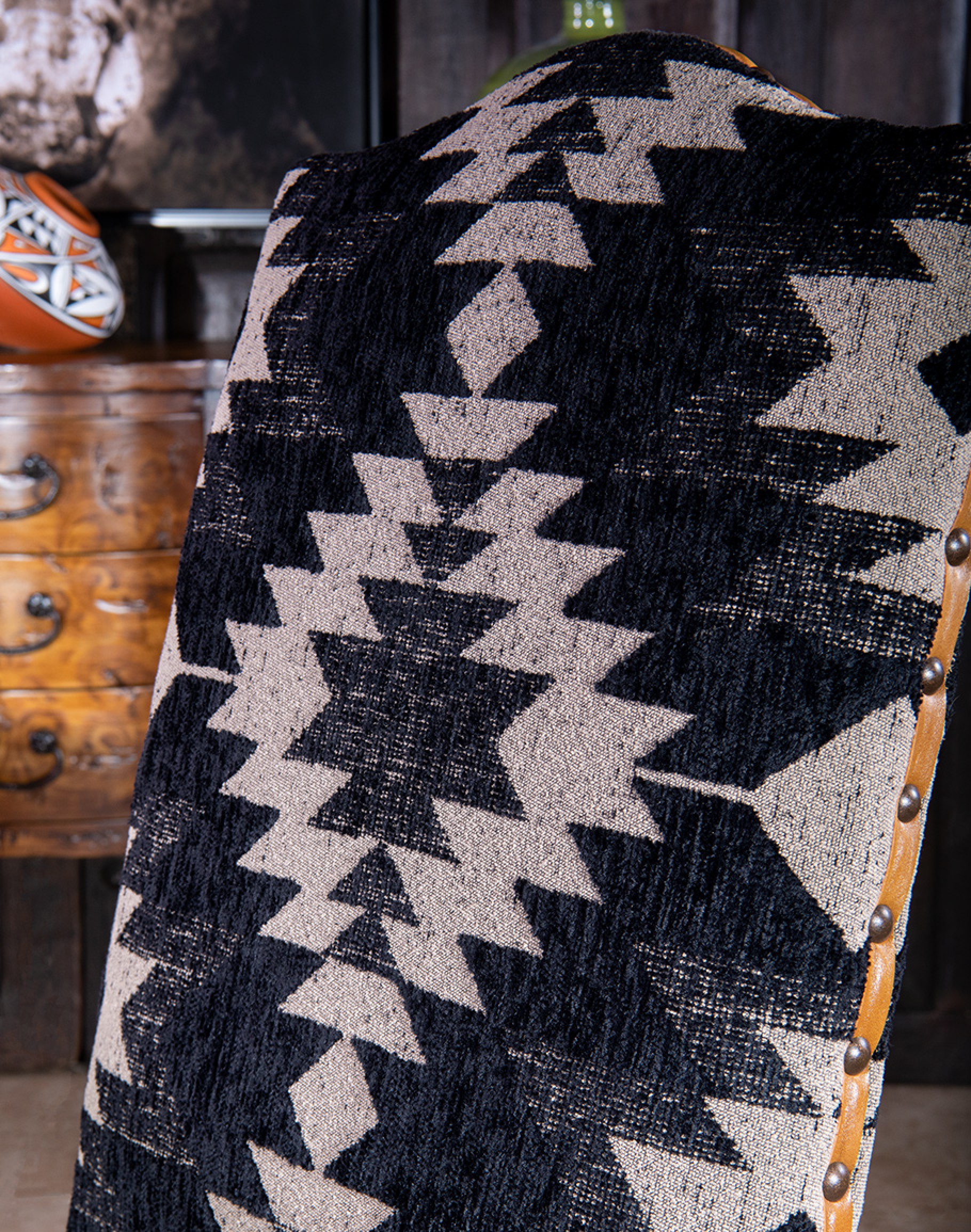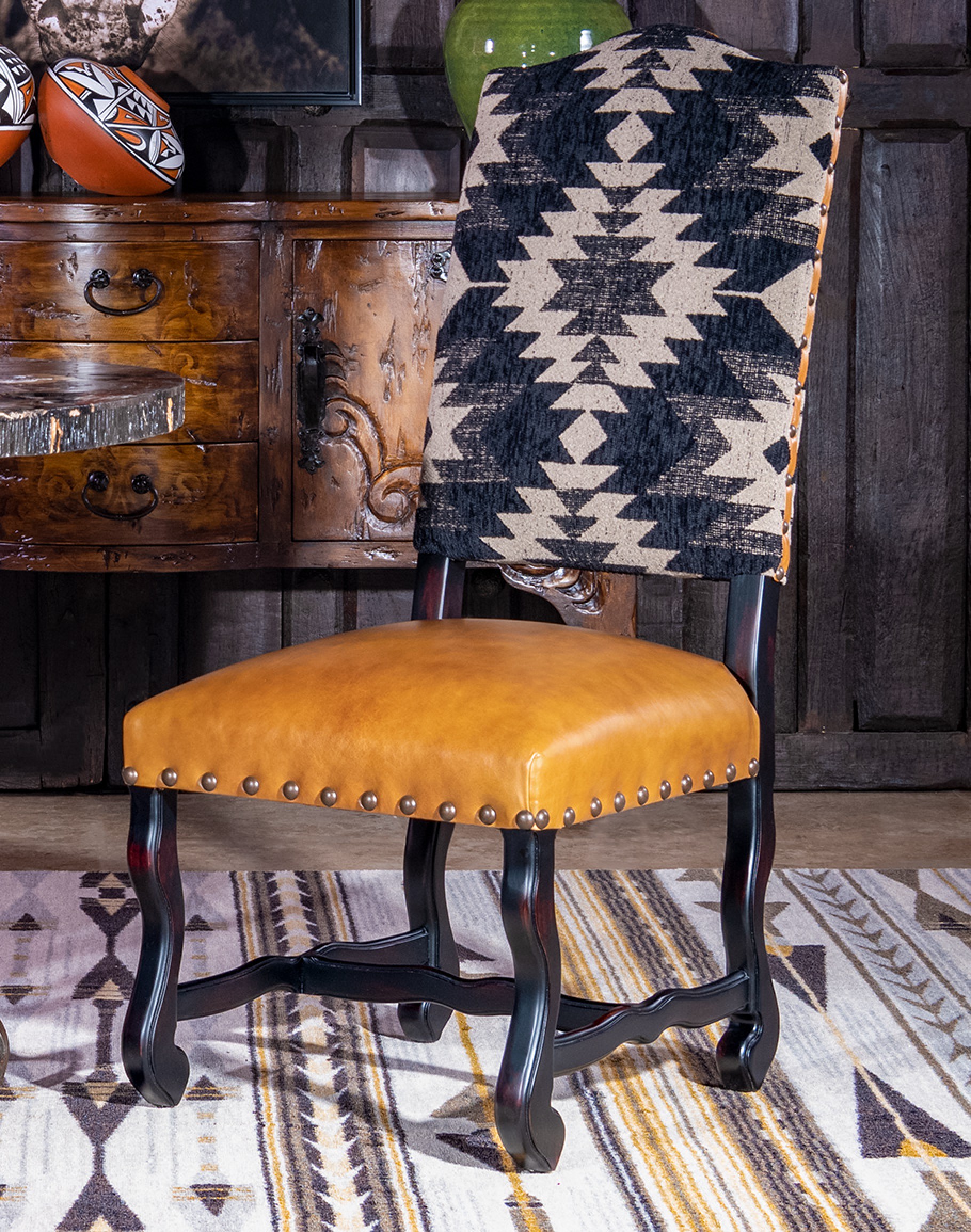 The Sulu Dining Chair is an American-made masterpiece of furniture design, combining elegance, comfort, and eco-friendliness. The chair features a dynamic southwestern pattern in black and cream fabric, adding a touch of sophistication to any dining room. The top grain leather seat cushion with tan leather elevates the chair's overall look and feel. This high quality dining chair is crafted using only eco-friendly materials, including a kiln-dried hardwood frame sourced from sustainably managed domestic forests and soy-based foam cores, ensuring the chair's eco-friendliness. Each chair is handcrafted by experienced carpenters and upholsterers in the USA, ensuring top quality and attention to detail in every aspect of the manufacturing process. The Poplar frames are built in-house and corner-blocked with double-dowel pin joinery, ensuring lasting durability for years to come. Whether it's for hosting dinner parties or daily family meals, the Sulu Dining Chair will be a perfect addition to any home, offering both comfort and style.