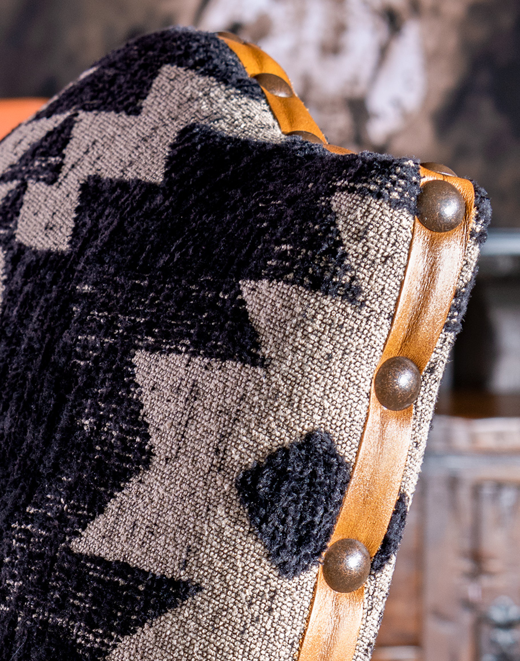 Leather Description: This leather is robust and rustic with an aged appearance emulating leather found on a well used saddle or a favorite pair of boots. The hides are carefully selected, cut thicker, tanned and dyed using state-of-the-art methods. The process also includes vacuum drying that helps boost the intensity of the color. While the natural grain is subtle, the distressed appearance comes from an infusion of oil that gives a pull up effect when upholstered. Tried and true western.