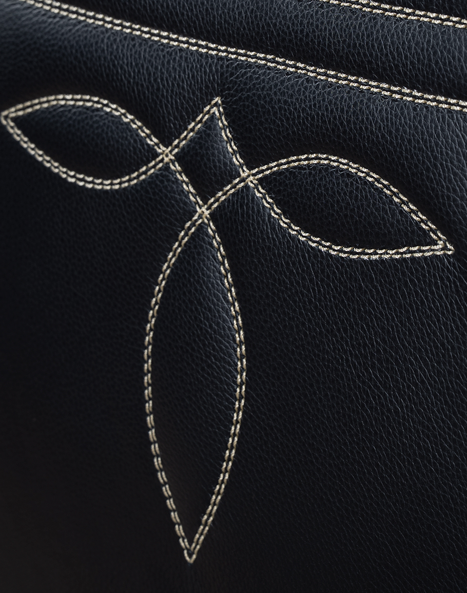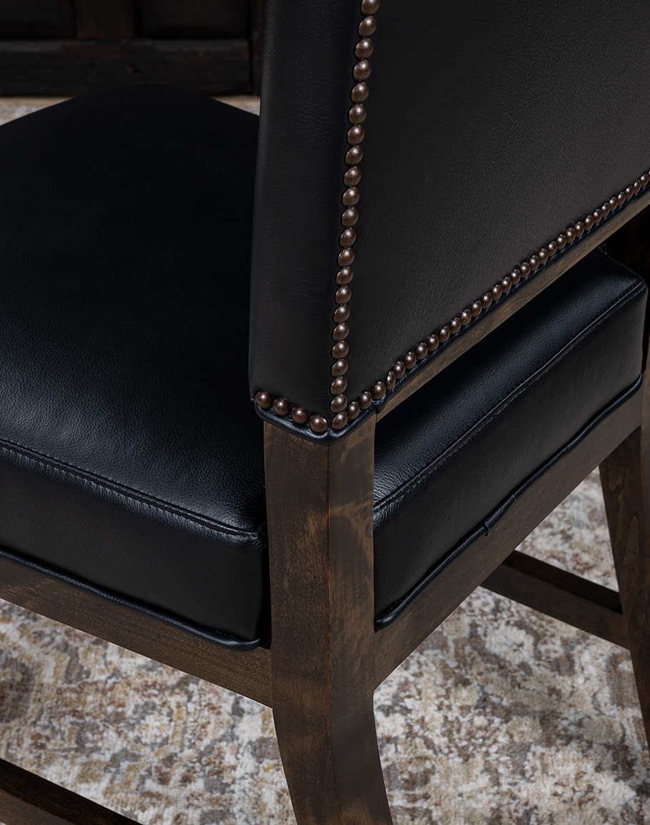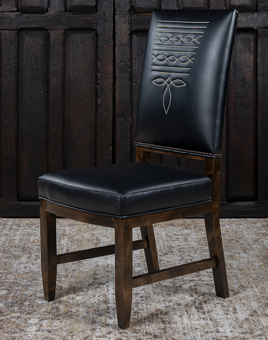 The Sundance Dining Chair is upholstered in luxurious top grain black leather, presented in a dark hue that enhances its rustic charm. The chair back is adorned with Adobe's signature boot stitch emblem, a nod to timeless Western aesthetics. Brass nail tacks elegantly outline the chair's back border, while a leather welt accentuates the base of the seat cushion, adding a refined touch.