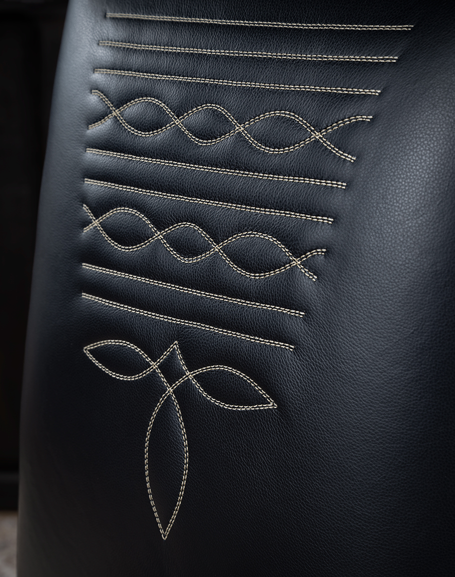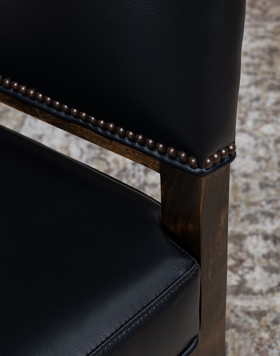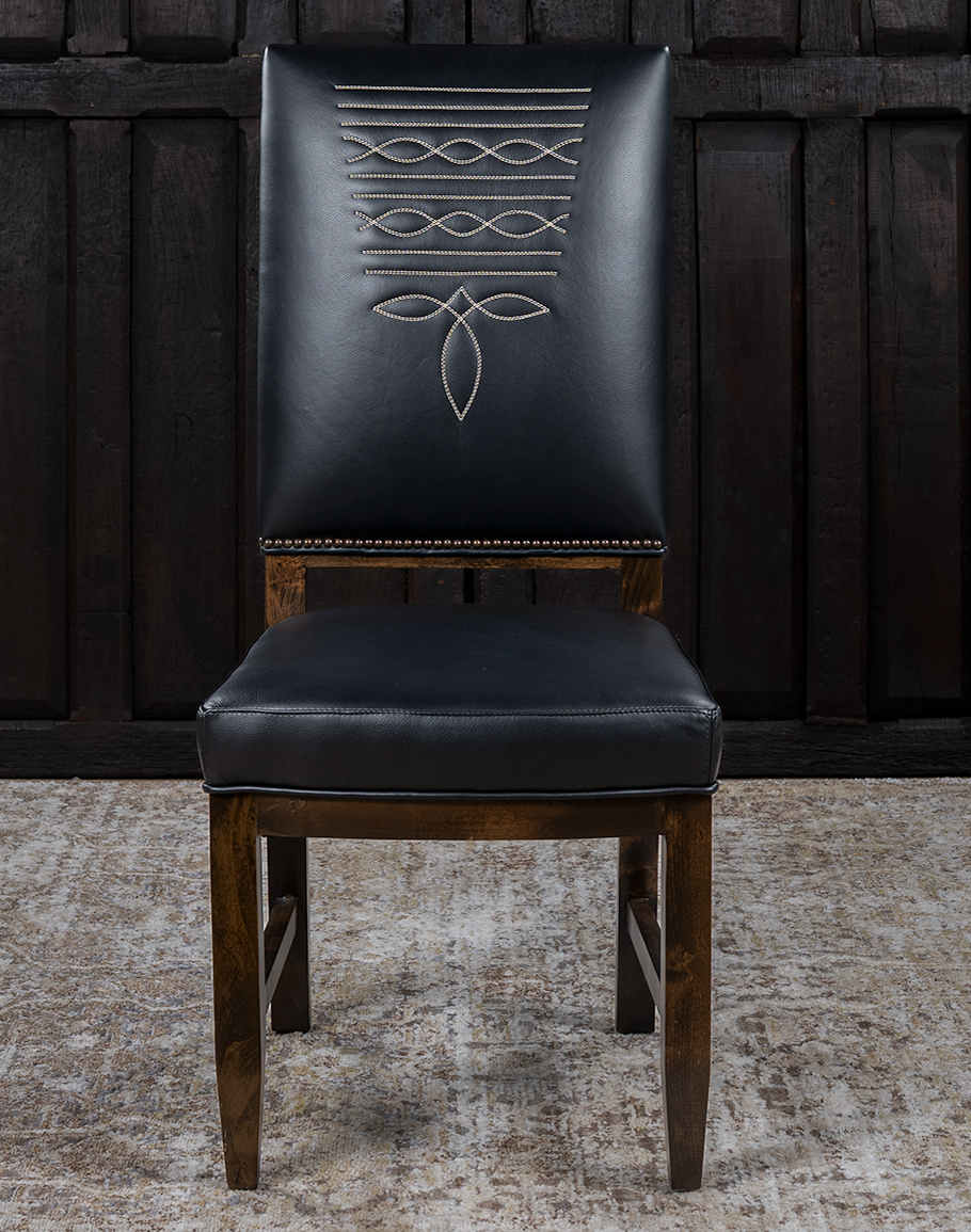 The Sundance Dining Chair is upholstered in luxurious top grain black leather, presented in a dark hue that enhances its rustic charm. The chair back is adorned with Adobe's signature boot stitch emblem, a nod to timeless Western aesthetics. Brass nail tacks elegantly outline the chair's back border, while a leather welt accentuates the base of the seat cushion, adding a refined touch.