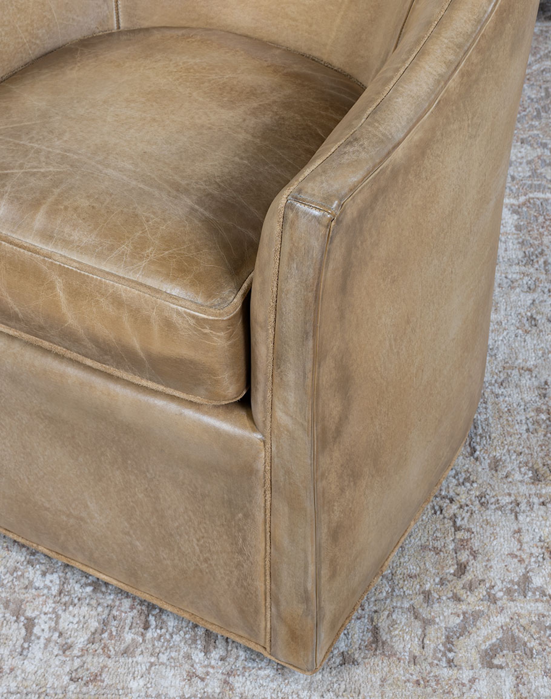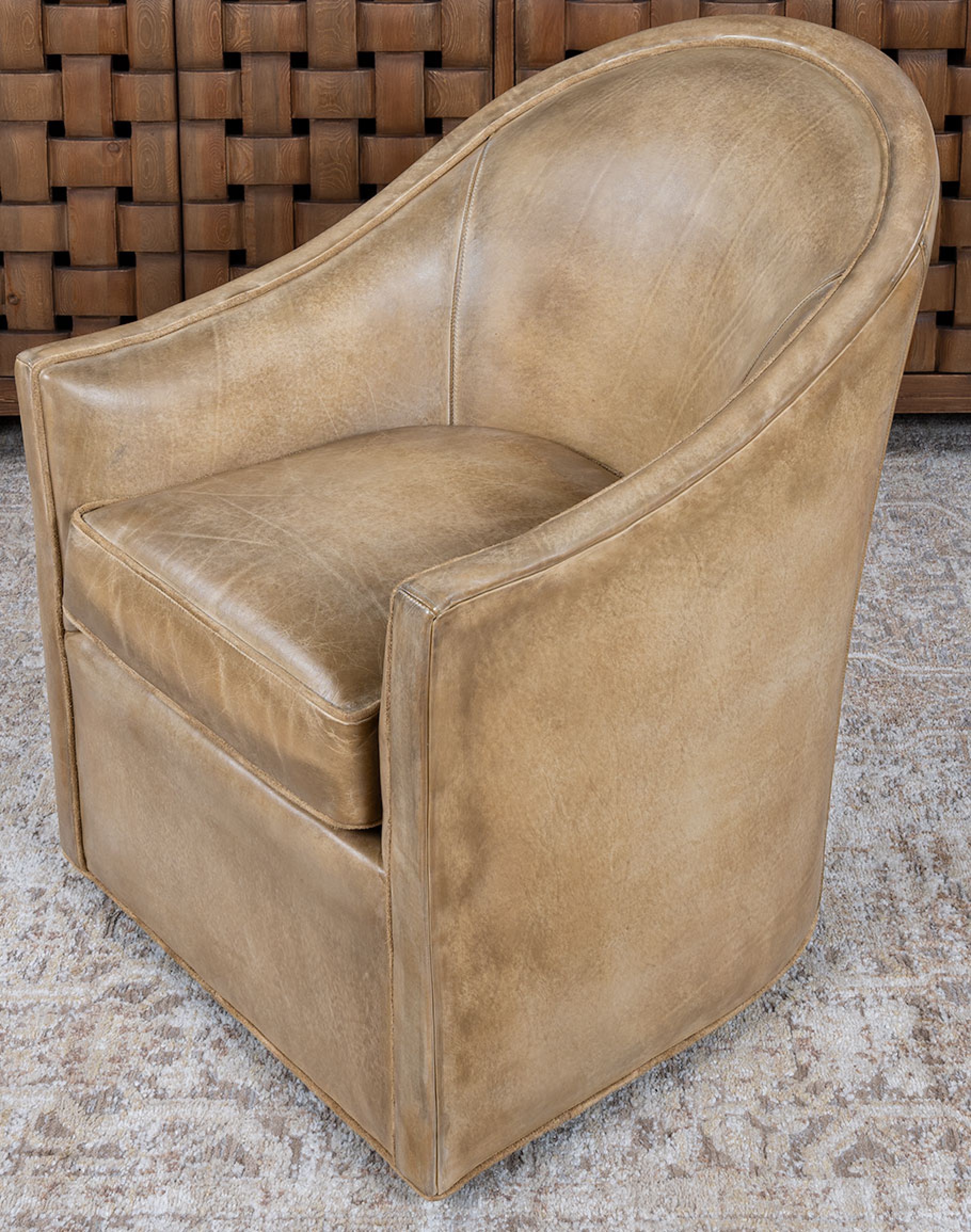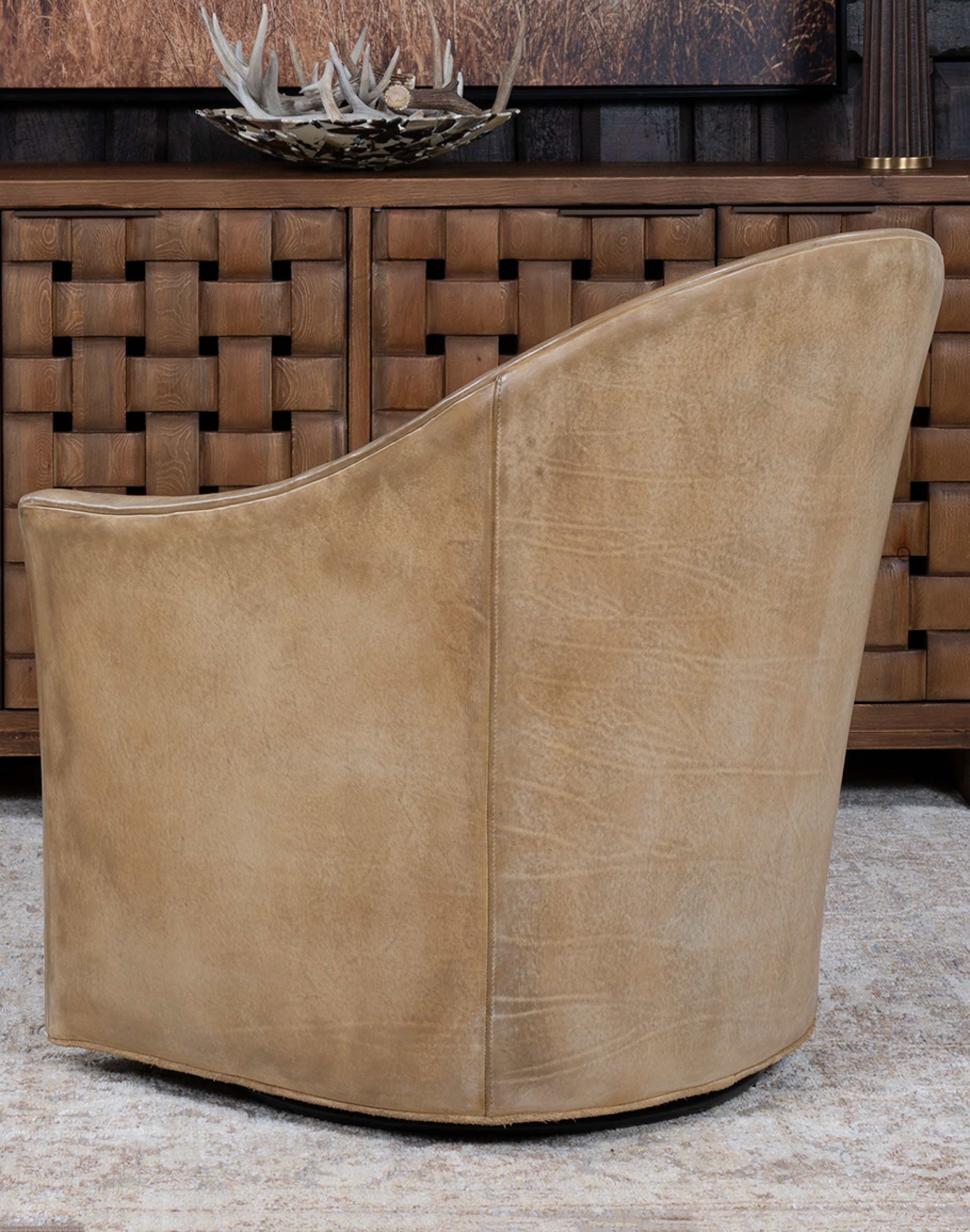 The Sydney Chaps Leather Swivel Chair is a refined blend of elevated Western design and enduring craftsmanship. 100% American made, this heirloom-quality piece is built on a kiln-dried hardwood frame and features 8-way hand-tied construction—a benchmark of true luxury upholstery that ensures lasting comfort and superior seat integrity. Upholstered in rich full-grain leather, each hide is hand-burnished to bring out a dynamic range of tones, reminiscent of well-worn cowboy chaps. The leather’s natural markings and character deepen over time, making every chair truly one of a kind. Sueded leather piping adds soft contrast along the edges and seat cushion, echoing the tailored details of handcrafted Western boots. The chair’s barrel-back silhouette and 360-degree swivel base offer both sculptural presence and everyday functionality, ideal for living rooms, reading nooks, or sophisticated lounge settings. The Sydney Chaps Chair is a signature example of Adobe Interiors’ dedication to timeless Western luxury, expert craftsmanship, and distinctive design.