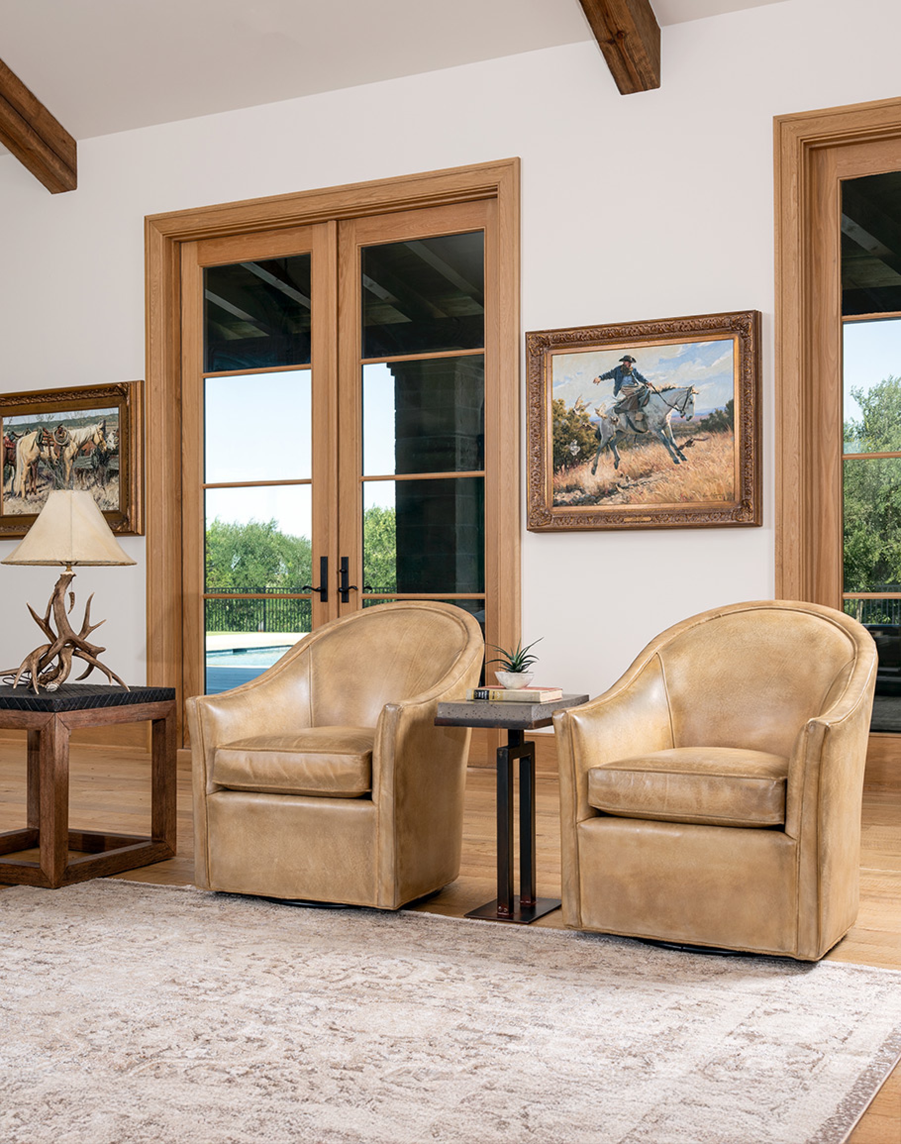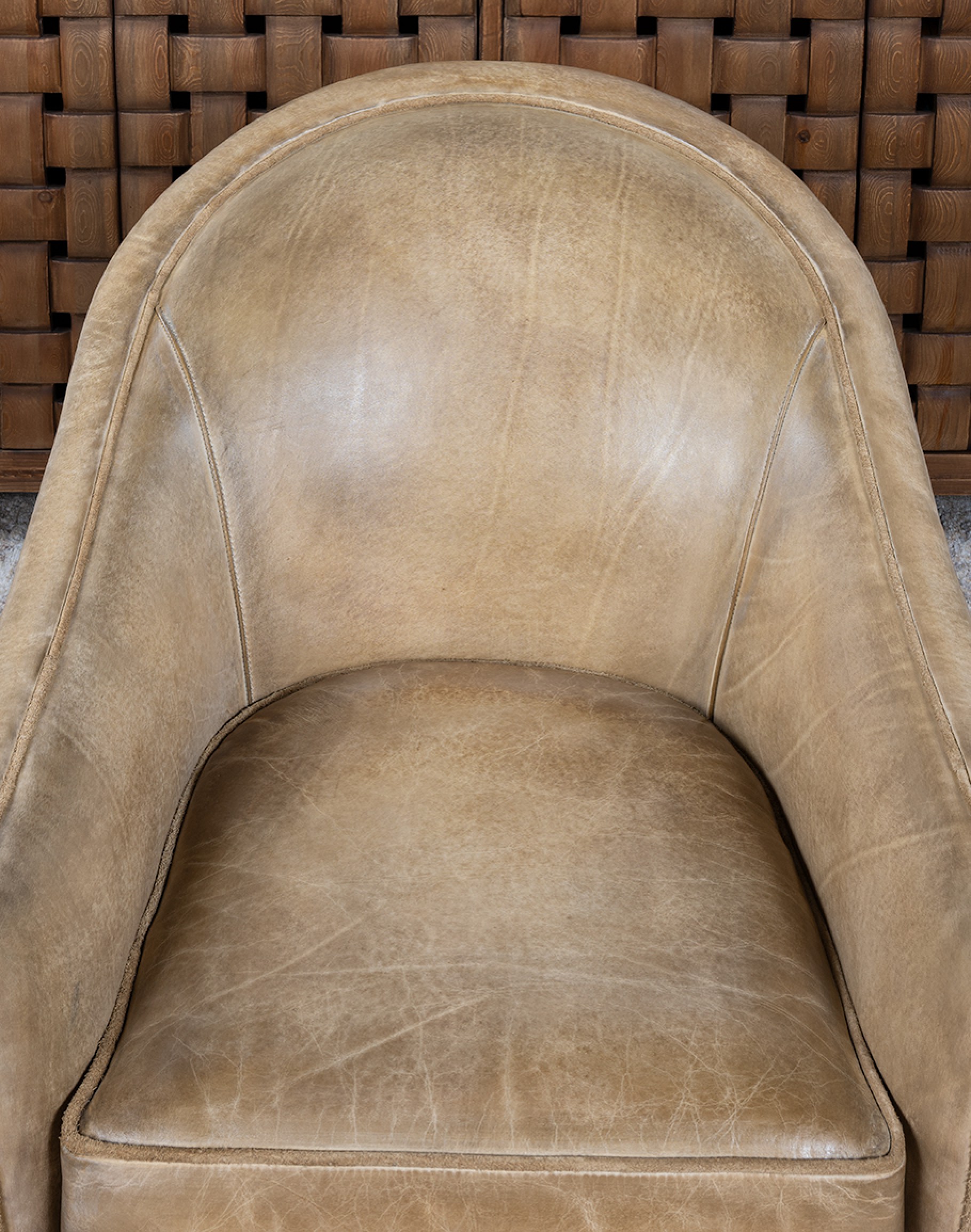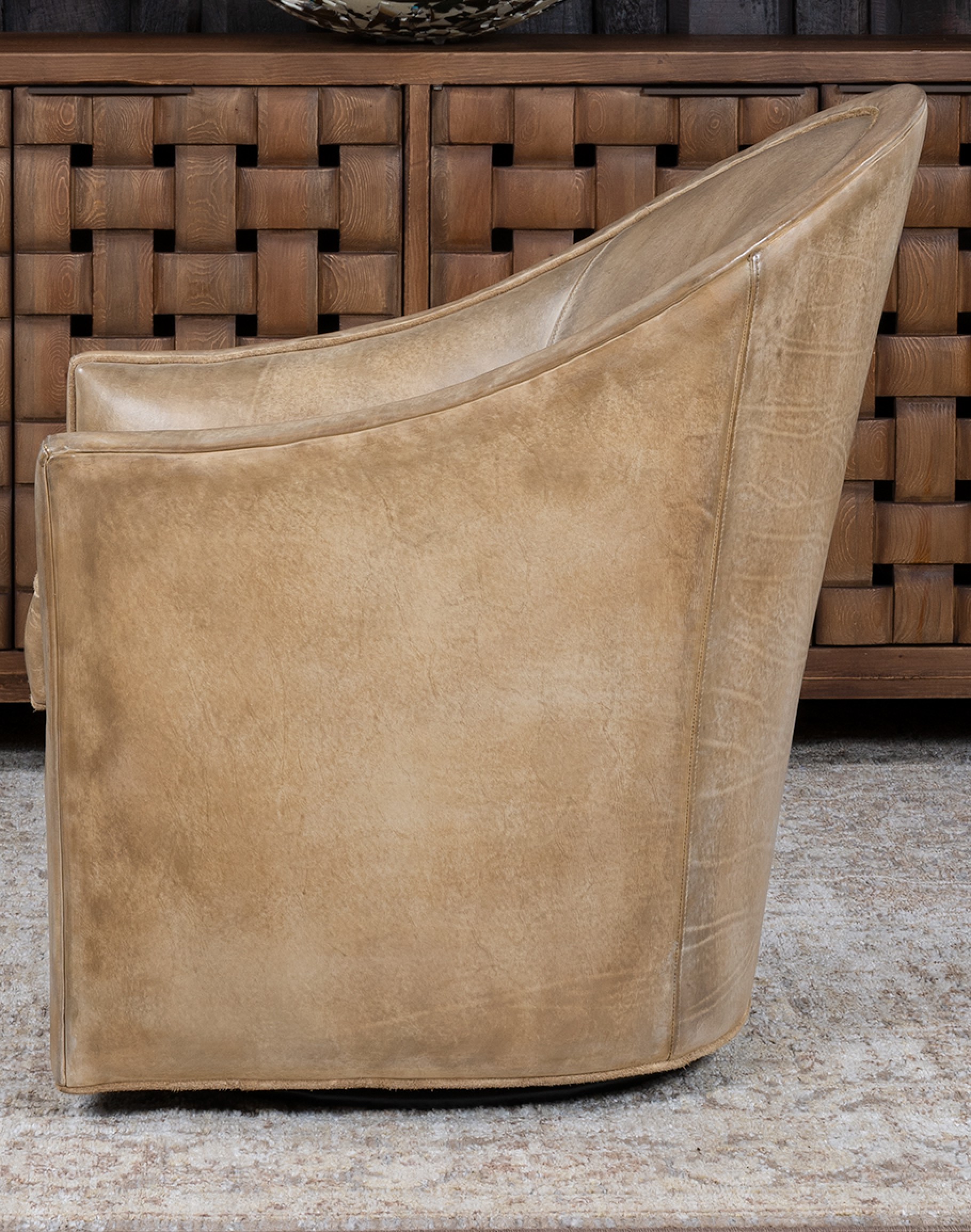 The Sydney Chaps Leather Swivel Chair is a refined blend of elevated Western design and enduring craftsmanship. 100% American made, this heirloom-quality piece is built on a kiln-dried hardwood frame and features 8-way hand-tied construction—a benchmark of true luxury upholstery that ensures lasting comfort and superior seat integrity. Upholstered in rich full-grain leather, each hide is hand-burnished to bring out a dynamic range of tones, reminiscent of well-worn cowboy chaps. The leather’s natural markings and character deepen over time, making every chair truly one of a kind. Sueded leather piping adds soft contrast along the edges and seat cushion, echoing the tailored details of handcrafted Western boots. The chair’s barrel-back silhouette and 360-degree swivel base offer both sculptural presence and everyday functionality, ideal for living rooms, reading nooks, or sophisticated lounge settings. The Sydney Chaps Chair is a signature example of Adobe Interiors’ dedication to timeless Western luxury, expert craftsmanship, and distinctive design.