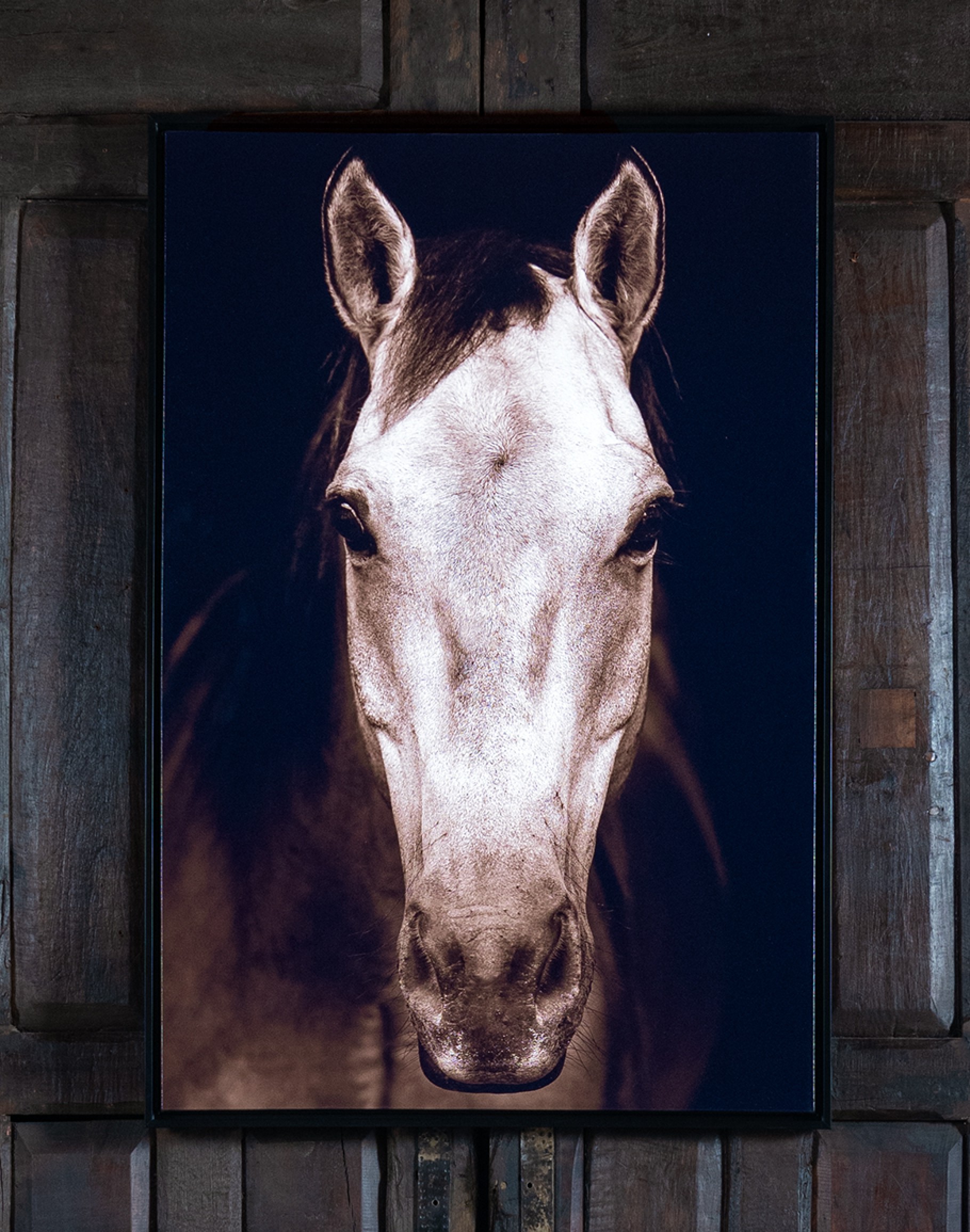 The Tan Horse is encased in a stylish matte black frame, giving it a modern and chic appeal. This contrast of color, combined with the art's measurements of 24x36 inches, offers a powerful visual impact, ensuring it will become the focal point in any room or space.