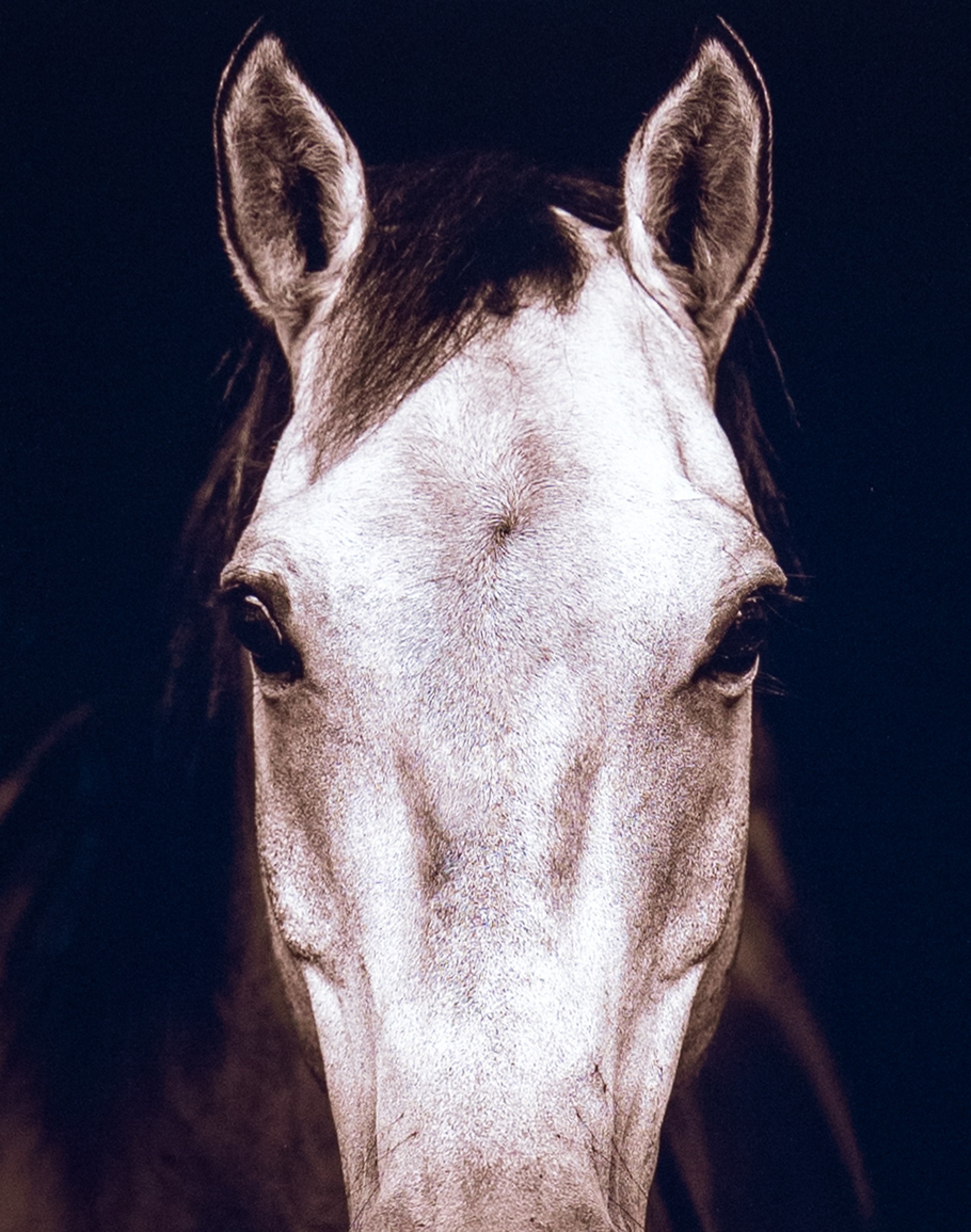 Our artwork captivates the viewer with an extraordinarily detailed image of a Tan Horse, elegantly set against a sleek black backdrop. This visually arresting composition, featured in a vertical format, captures the depth and complexity of the horse's expressive gaze, its vibrant coat, and its strong, poised stature.