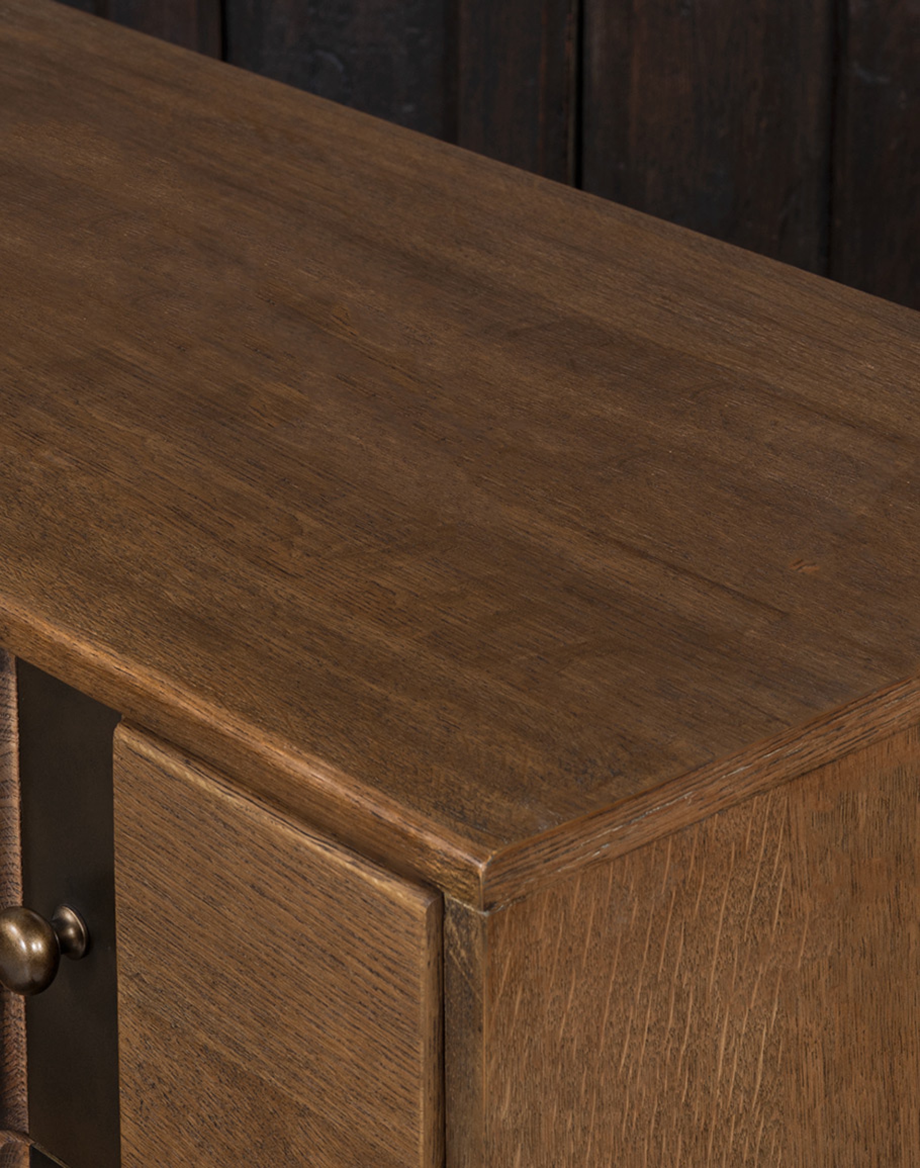 The Taylor Oak Wood Chest is a showcase of American-made excellence, combining clean architectural lines with the richness of premium materials. Handcrafted from solid oak, this chest features a warm medium brown finish that accentuates the wood’s natural grain patterns. Vertical antiqued bronze metal accents frame the drawers, complemented by matching round metal pulls that add a refined industrial touch.
