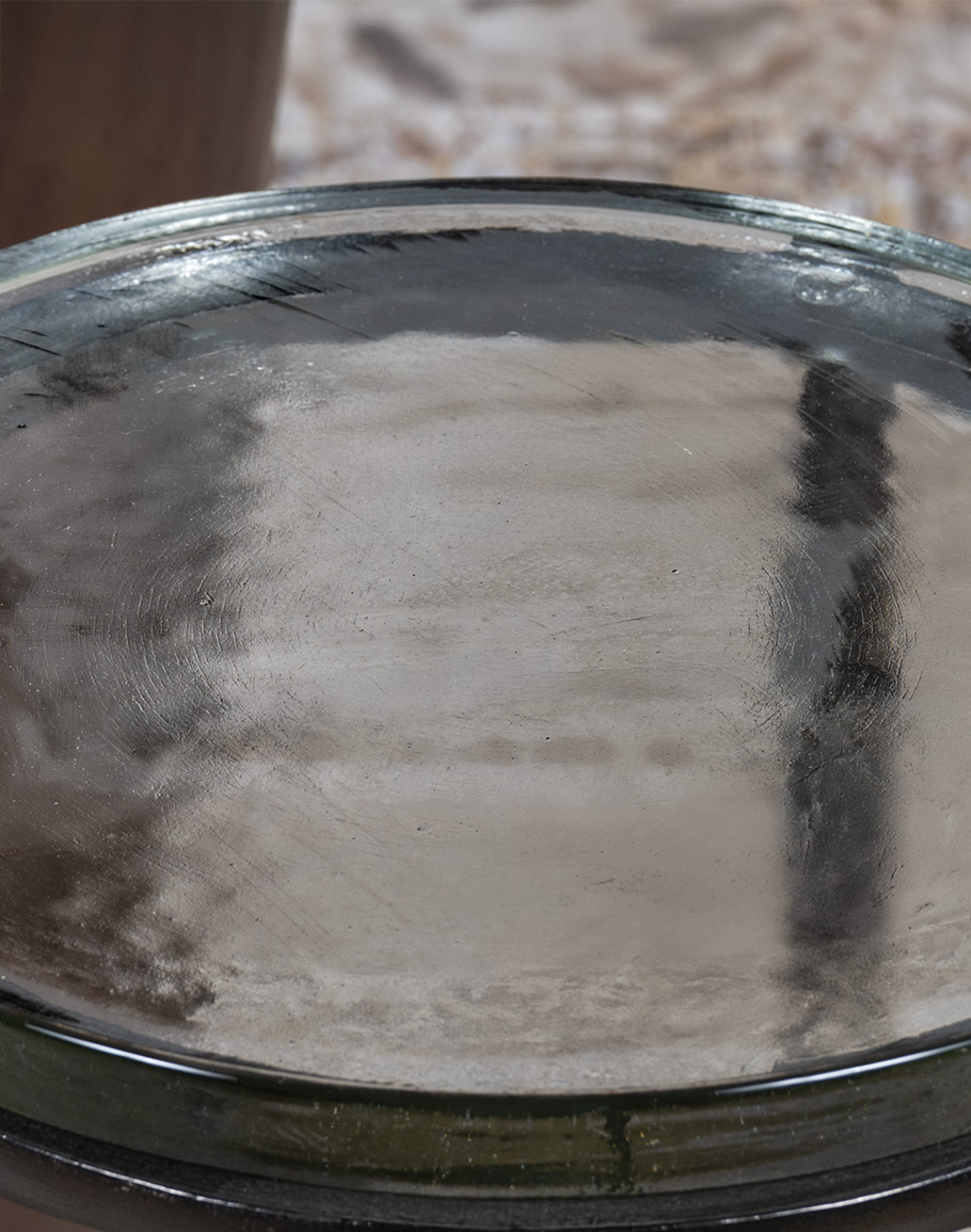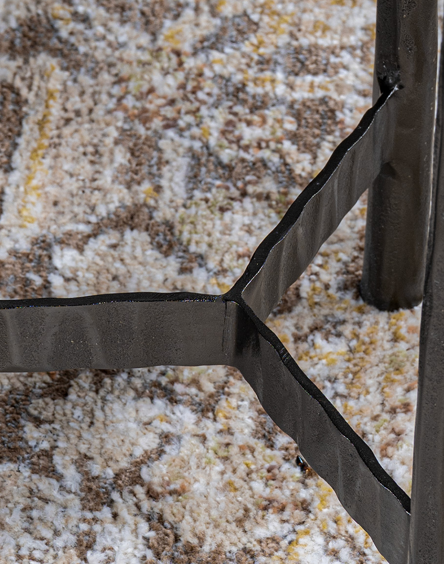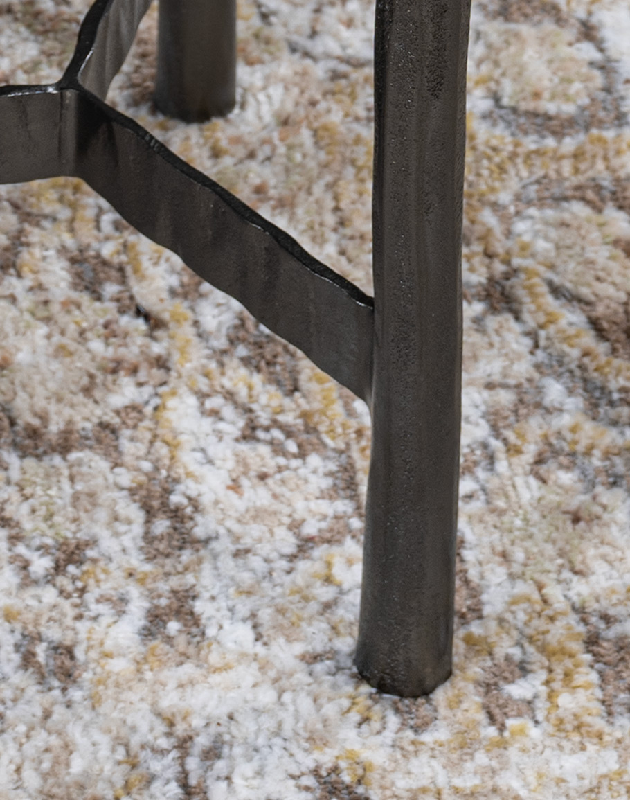 The Telluride Martini Table is a refined gunmetal accent table that brings modern rustic edge to any space in a compact, elevated silhouette. It features a think, textured recycled glass top with a smoky gray tone and a subtle olive-green tint. Slender chiseled cast aluminum base finished in a deep gunmetal keep the profile airy and architectural, while the forged-style stretcher at the base adds stability and an artisan-made designer detail. Perfect beside a leather lounge chair, sofa, or bedside, this martini table is ideal for holding a cocktail, small lamp, or favorite book in a living room, study, bedroom sitting area, or lodge-inspired suite. Bold yet versatile, the Telluride layers texture, craftsmanship, and moody color for a polished, elevated accent.