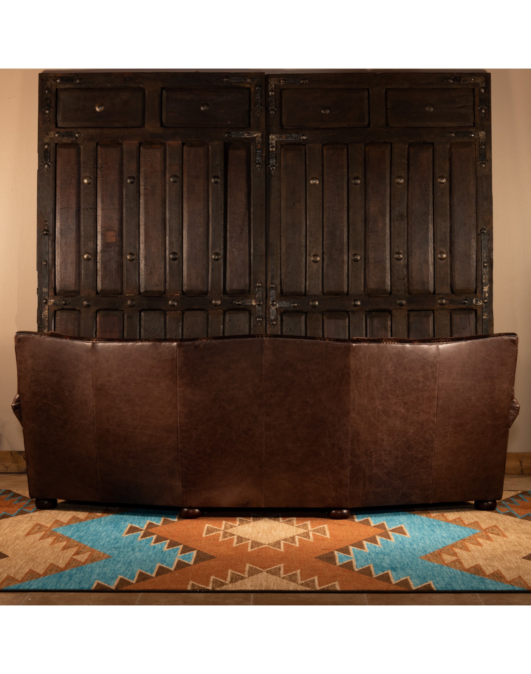 The Texas Curved Sofa is a top grain pull up leather sofa with an embossed leather croc accents along the bottom deck and arm panels. The Texas Curved Leather Sofa is perfect to outfit a rustic ranch or a southwestern themed home. The plush seat and back cushions are perfect to help you relax in after a long day. This sofa is both exceedingly elegant and extremely comfortable—a statement piece that accentuates your fine tastes and dedication to the rustic elegant aesthetic. 100% American Made to the highest standards of quality and craftsmanship!