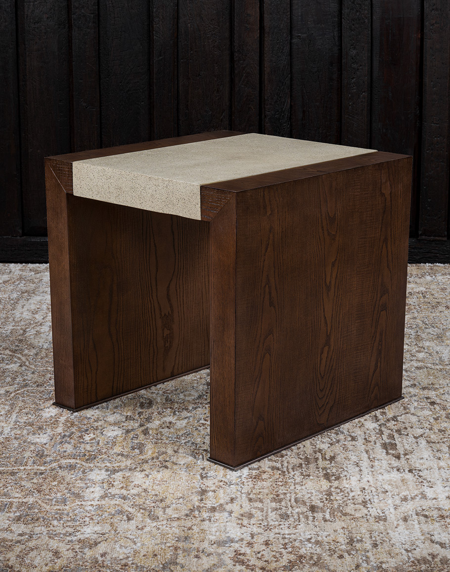 The Thea End Table is a refined architectural accent that blends bold structure with warm, organic materials. Framed in rich dark walnut ash veneer with dramatic cathedral grain, its thick waterfall legs create a grounded, sculptural silhouette. A recessed warm ivory composite top adds contrast with subtle terrazzo-inspired speckling, delivering texture and durability in equal measure. Compact yet substantial, this 100% American-made end table brings depth, balance, and elevated design to any sophisticated living space.