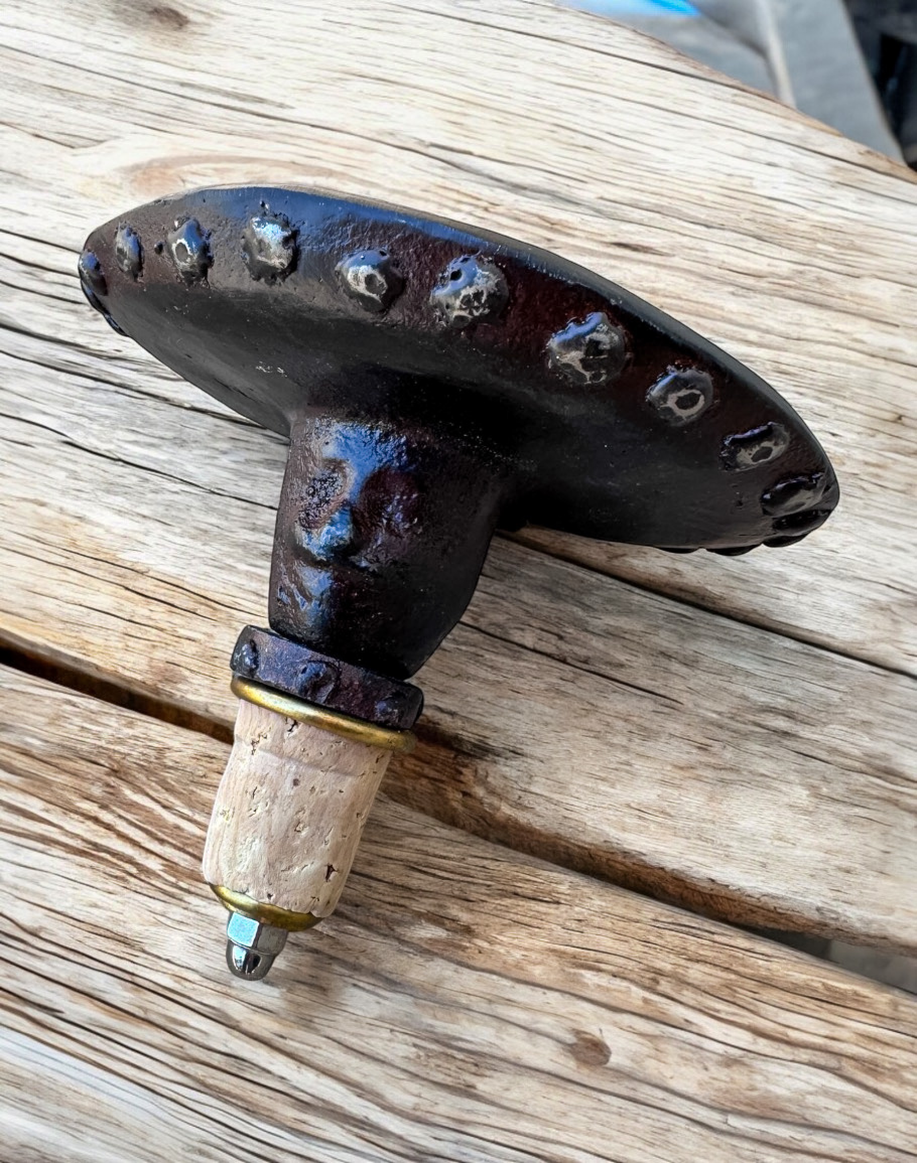 Cowboy wax cast iron decanter topper with vintage style glass bottle and iron coaster by Jan Barboglio Dimensions: 4" x 4" x 11" Care instructio..