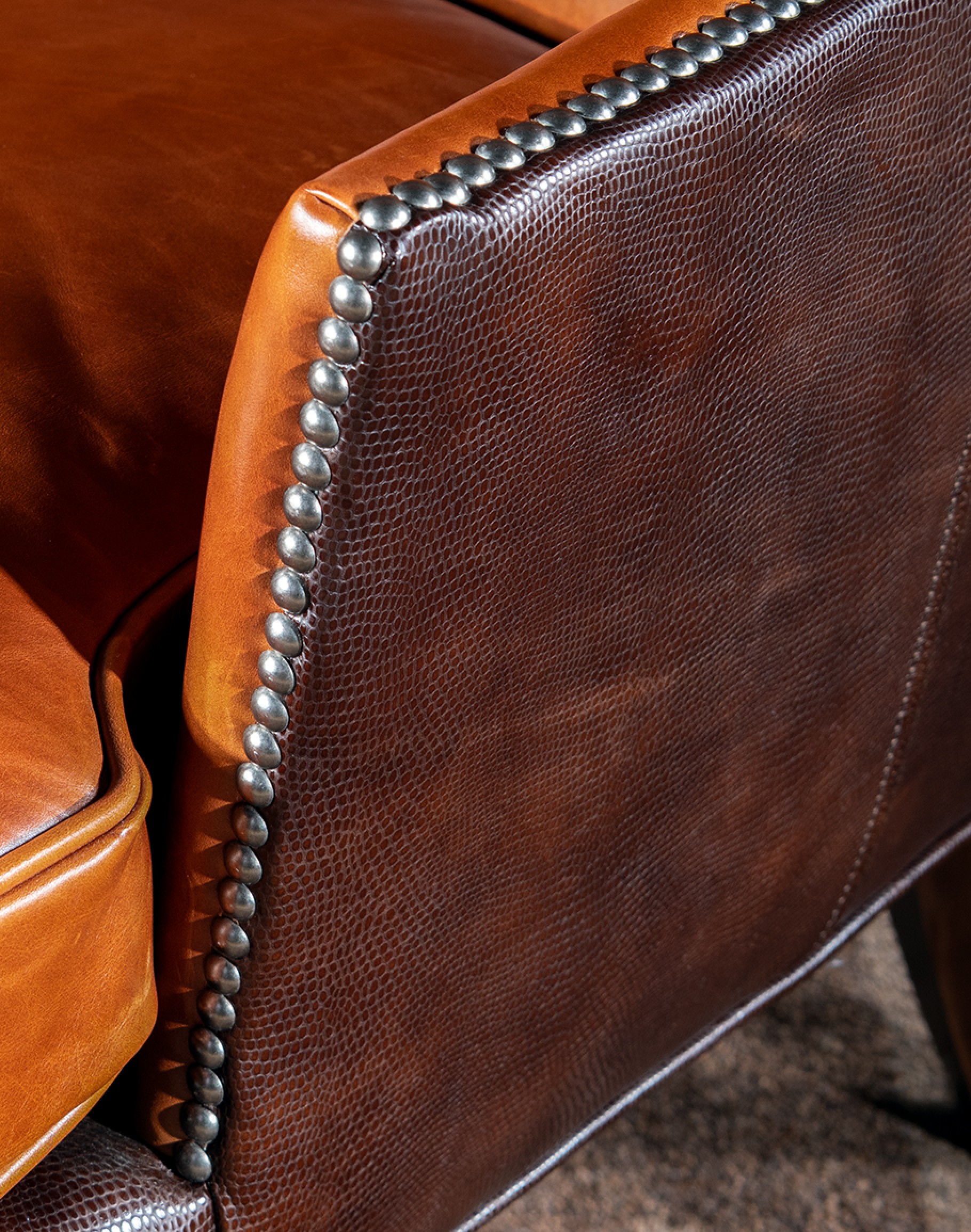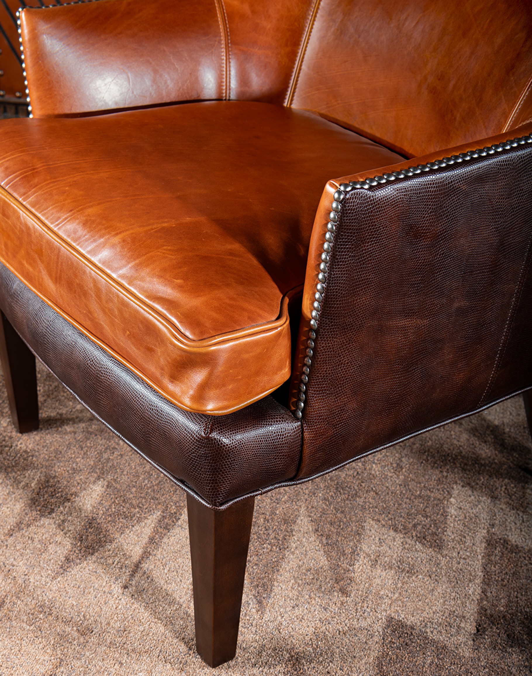 Experience the elegance and craftsmanship of the American-made Tomahawk Leather Chair, a timeless addition to your home. Crafted with the highest quality materials, this chair features luxurious, wax pull-up leather in a rich cognac tone, providing both comfort and durability. The unique design is further enhanced by the exquisite stamped lizard pattern leather on the outer back, adding a touch of sophistication. Detailed with true nickel nail heads along the arms and wings, this chair is not just a piece of furniture, but a statement of style. Perfect for any living space, the Tomahawk Leather Chair combines classic charm with modern flair. Order now to transform your home with this stunning, handcrafted chair.