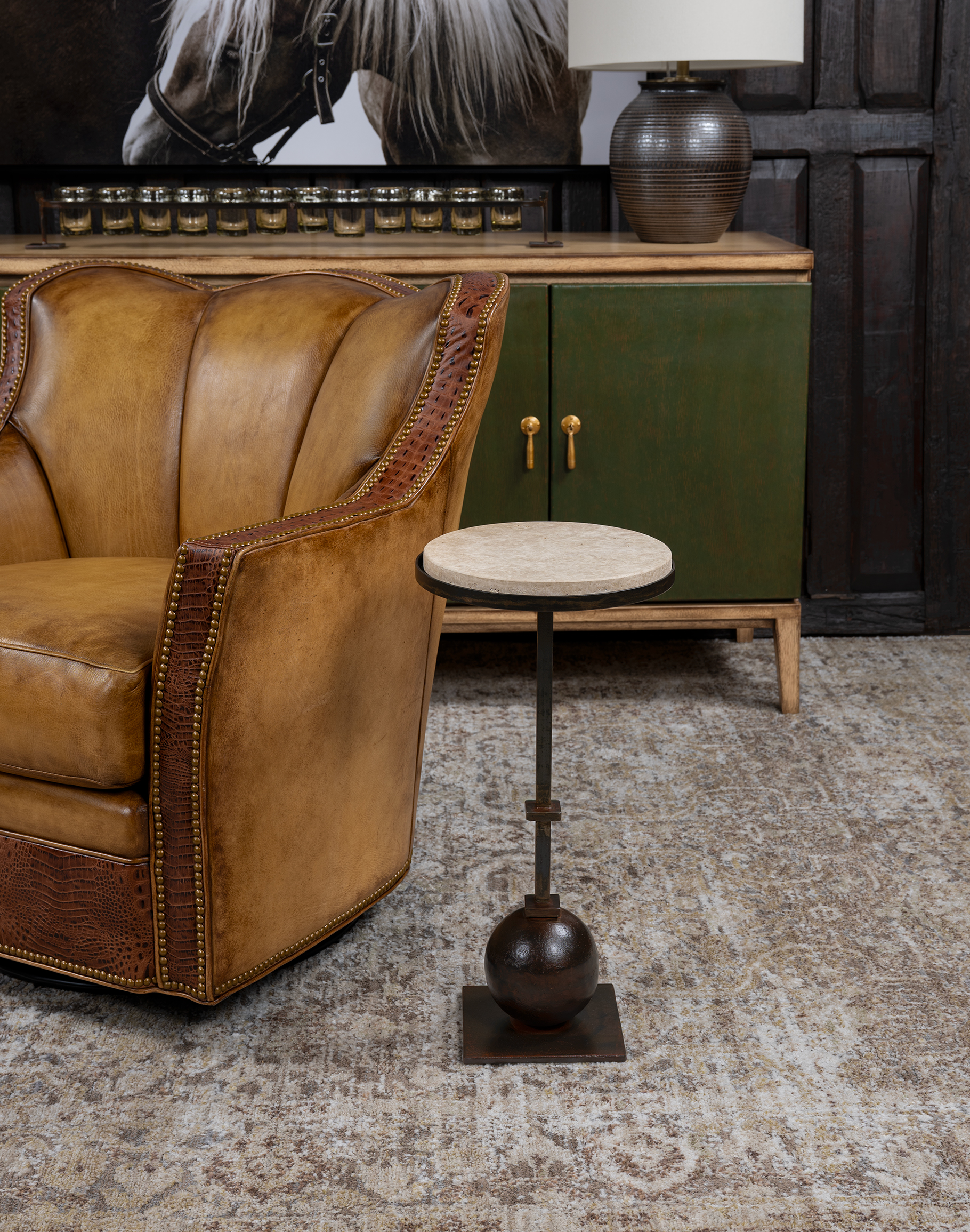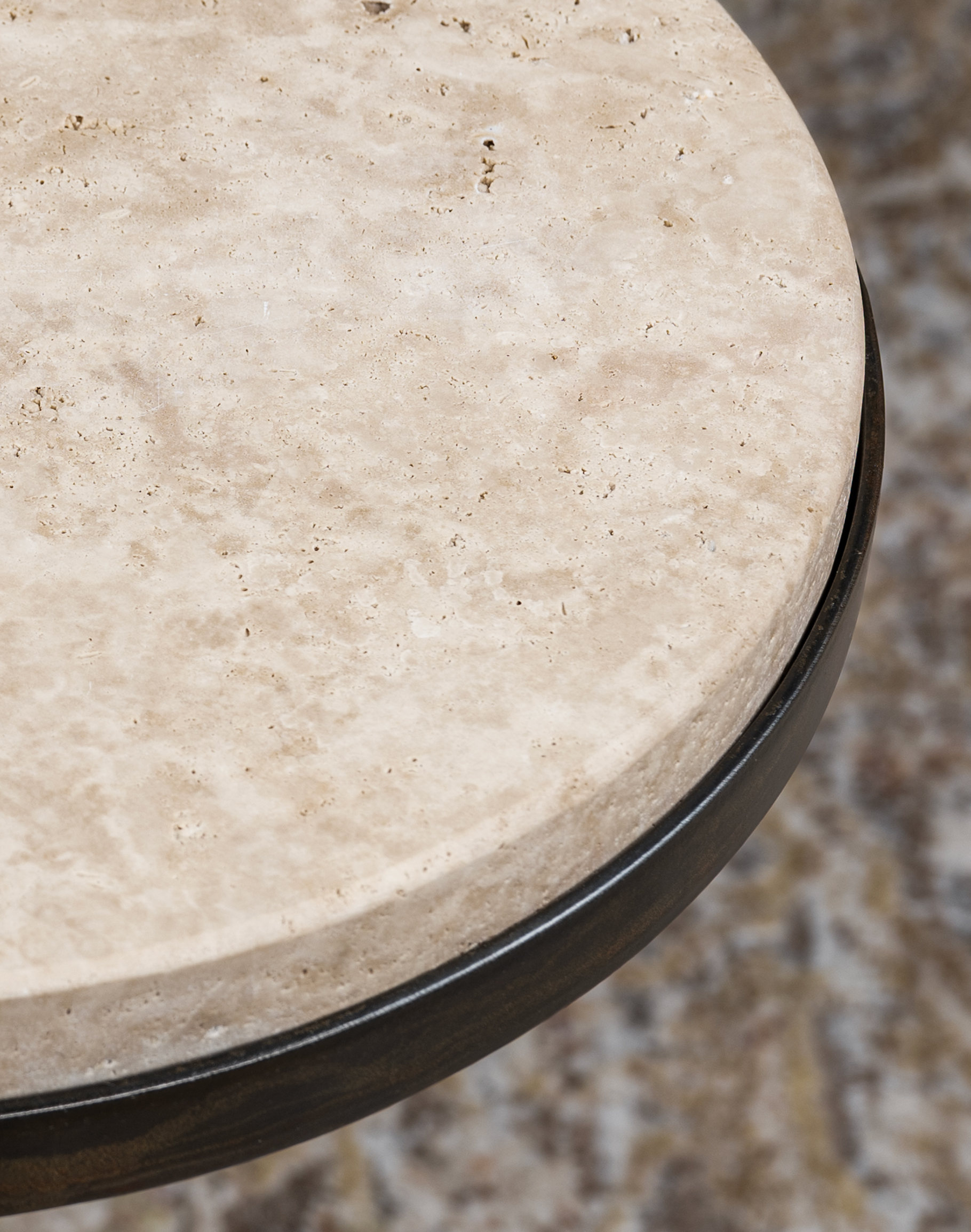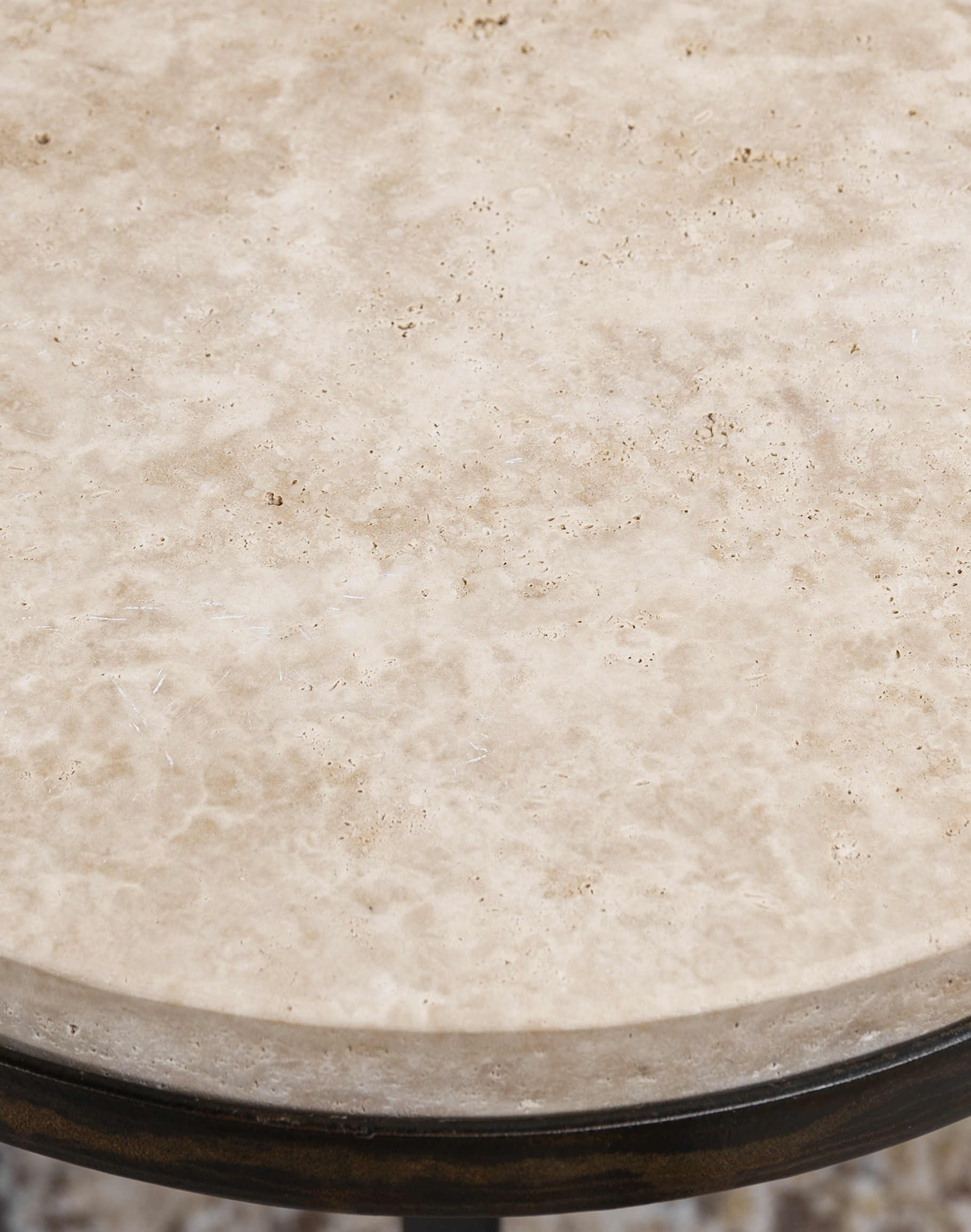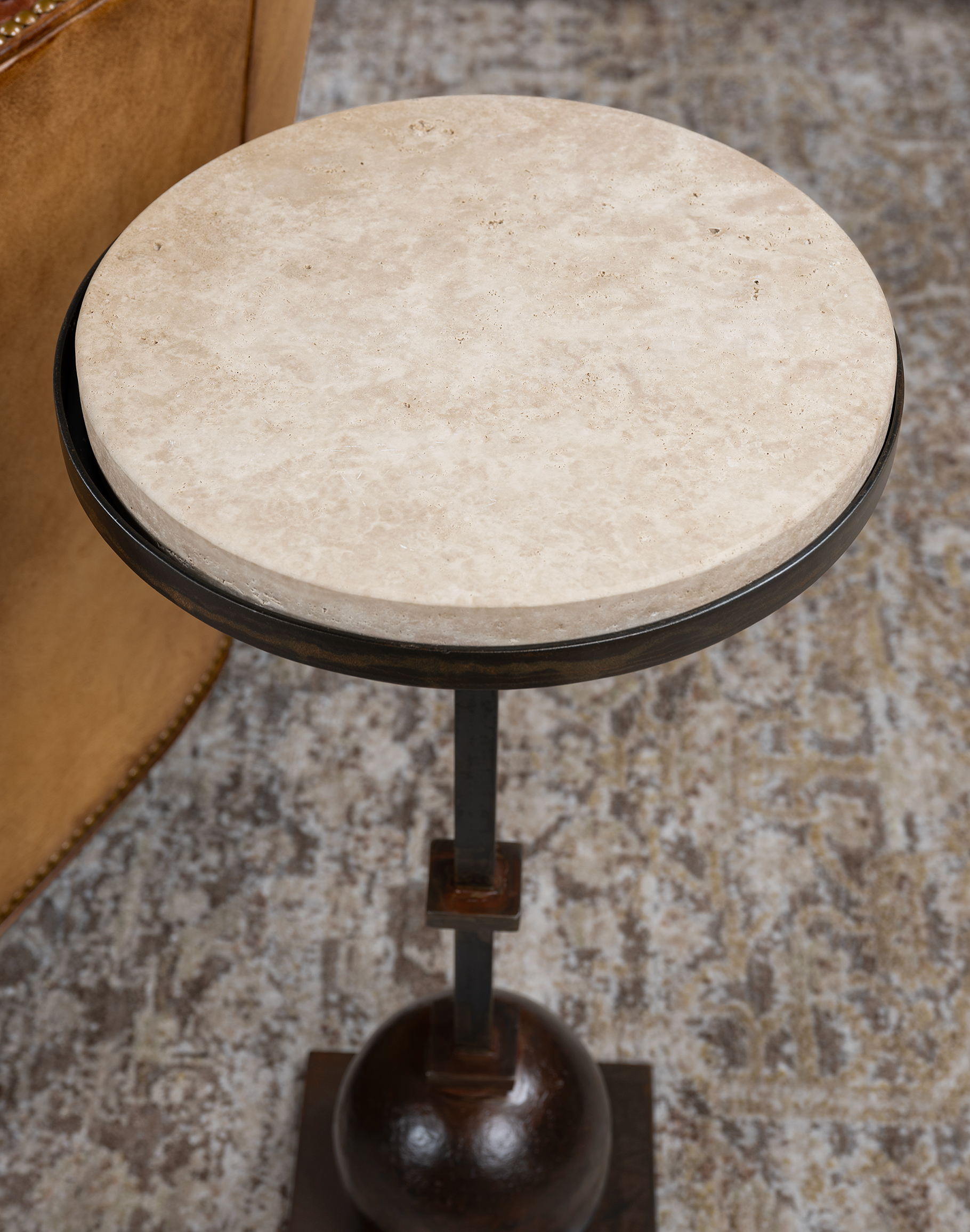 The Torreon Stone Circle Accent Table is a sculptural accent piece that delivers timeless elegance through natural materials and hand-forged craftsmanship—perfectly scaled for placement beside a sofa or lounge chair. At the surface, a substantial round Torreon stone top showcases a soft, organic palette of warm ivory, sand, and light beige tones, reminiscent of natural travertine. The honed finish reveals subtle pitting and mineral movement, giving the stone a rich, authentic character while maintaining a smooth, refined touch. Its thick profile adds visual weight and presence, creating a grounded, sophisticated silhouette.
