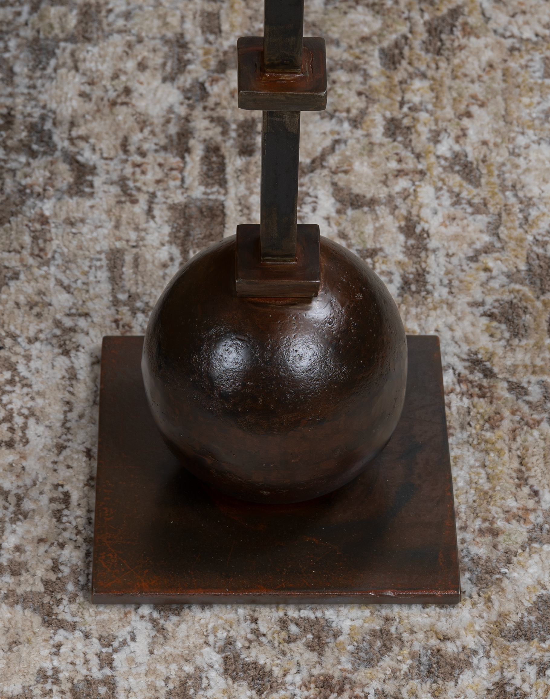 The table is supported by a striking forged iron pedestal base in a deep aged bronze finish, designed with a distinctive ball-in form that introduces a bold, architectural element. The vertical support features clean, geometric transitions with hand-forged detailing, leading down to a square base plate that provides both stability and a strong visual anchor. At Adobe Interiors, we create the furniture, and you create the memories.