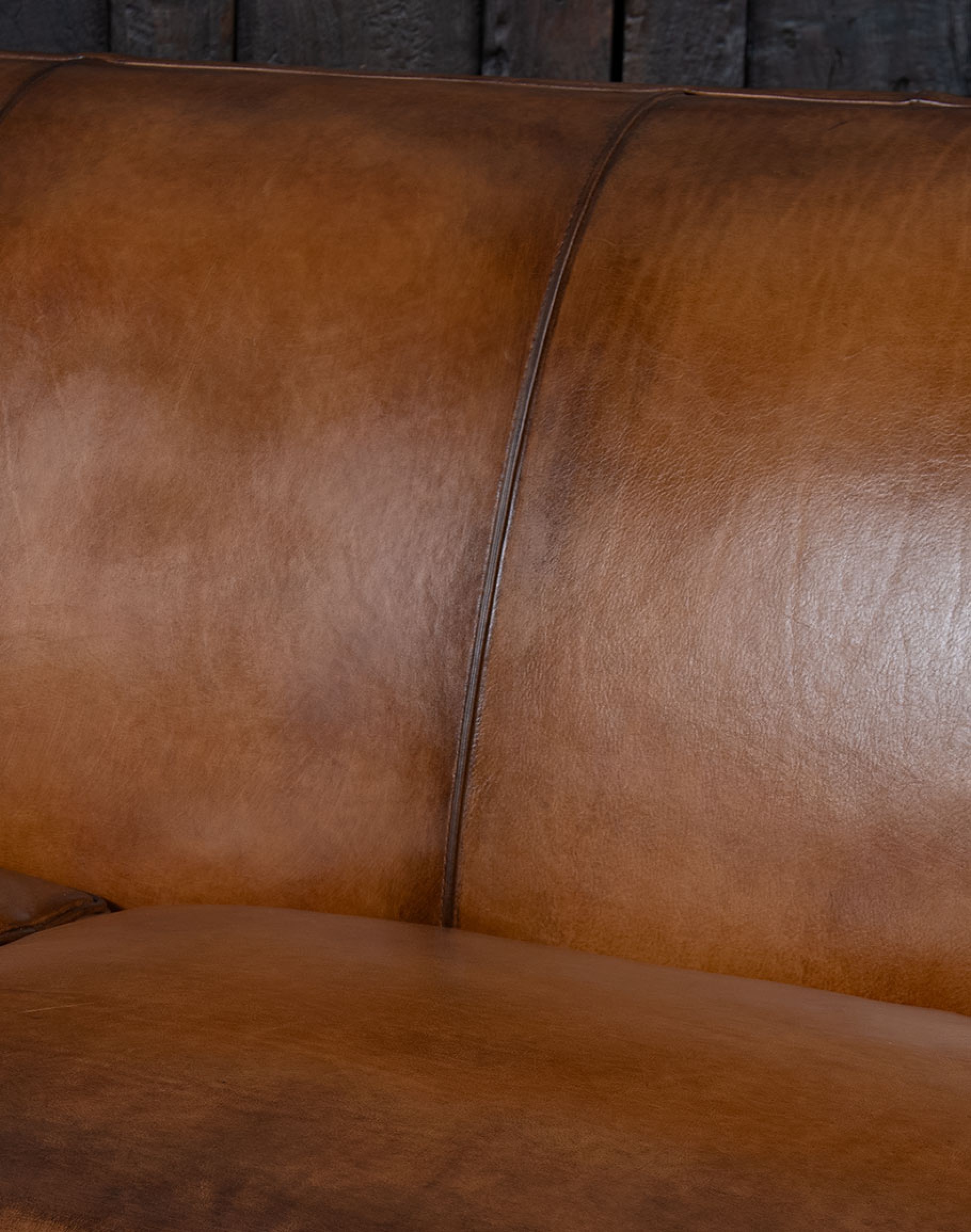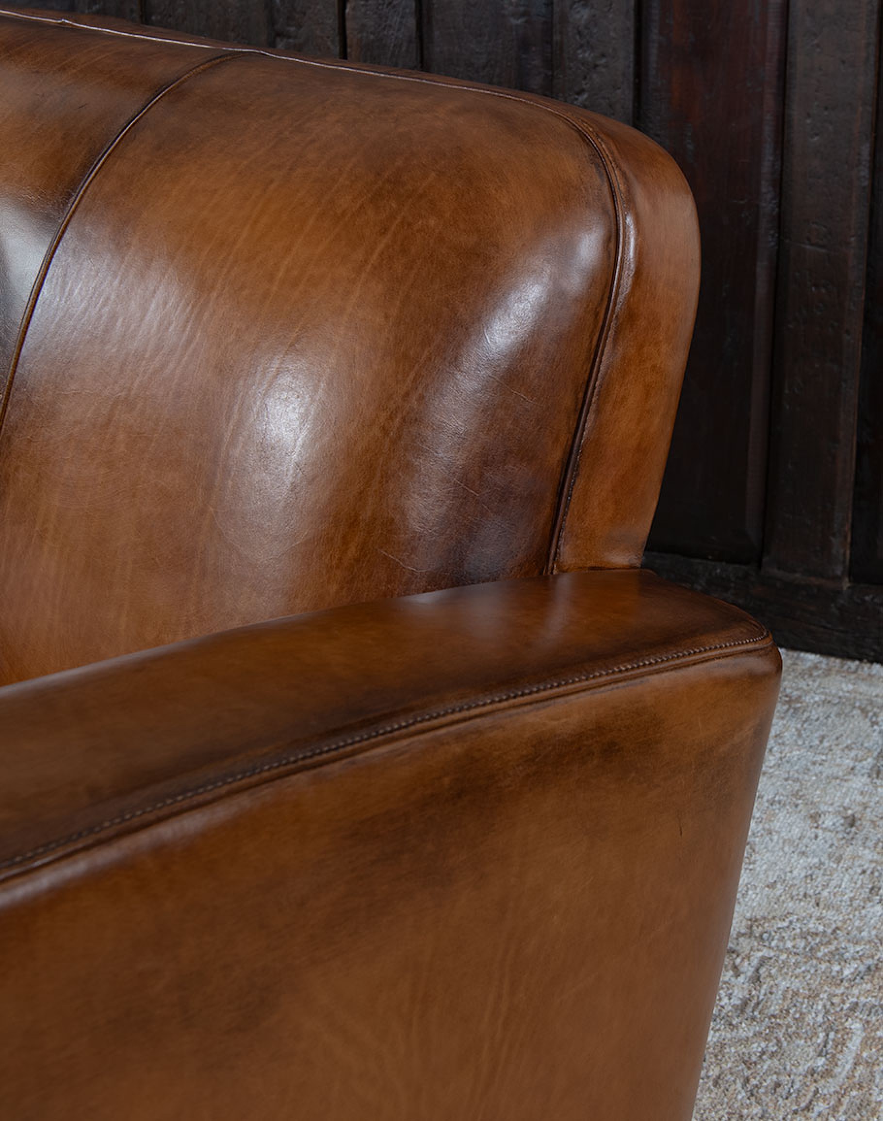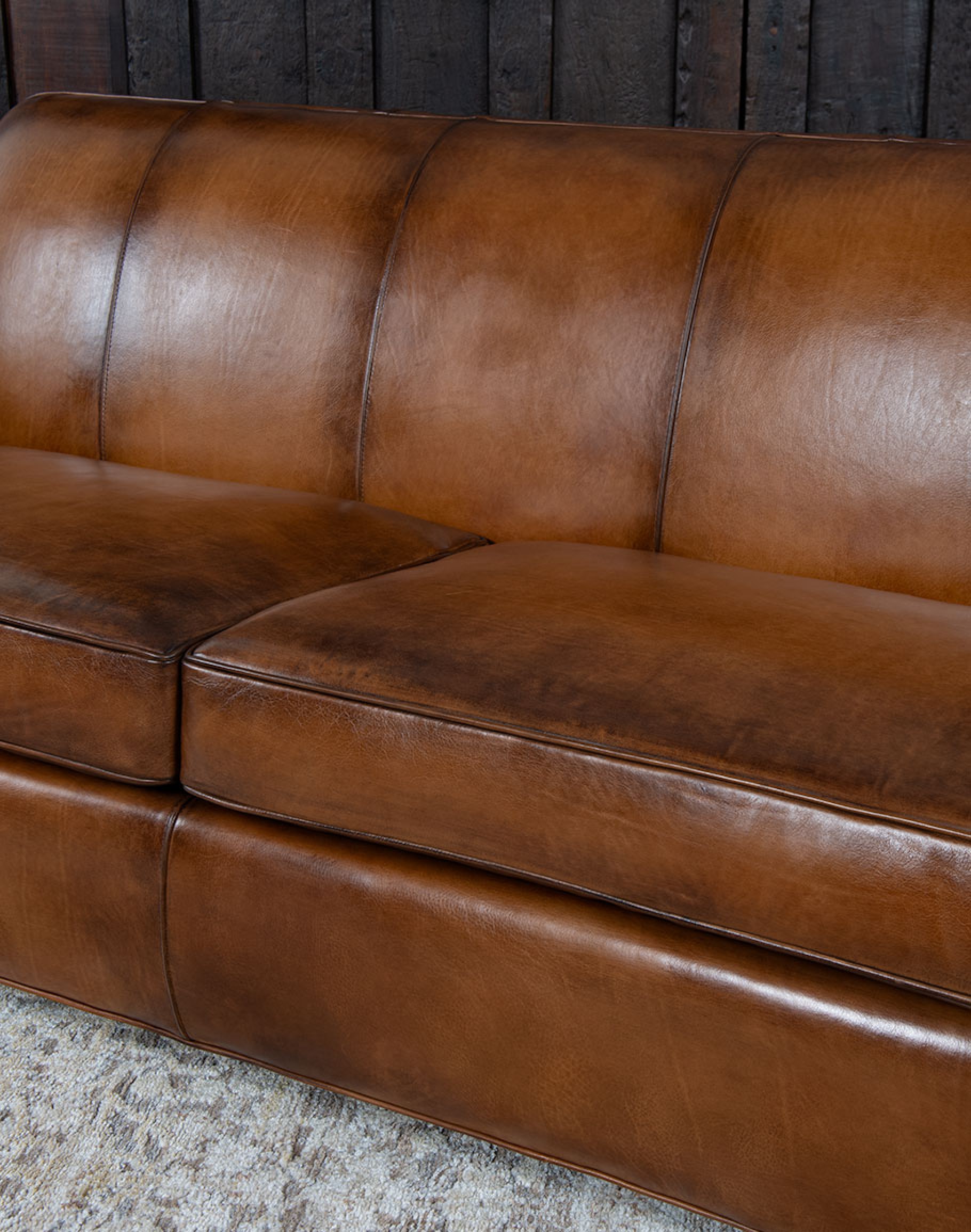 Leather Description: This is a full grain aniline leather tanned in a historic leather producing region of Italy using English hides. The century old tannery prepares this leather article by applying a hot wax, then turning the hides in old wooden tanning drums overnight to soften the natural fibers and impart it with a remarkable suppleness. The leather is then upholstered in its "crust form" on the furniture in North Carolina, After the furniture is made our leather artisans apply a multi step hand rubbed Patina using the same waxes and pigments used in Italy. Performing this process on the actual finished piece allows our artisans to develop a unique Patina, composition, and overall essence that creates a piece of furniture that has uniqueness, character and style that matches the individual who's selecting it. This leather imparts the feeling of a softer, well broken in leather one might find on a decades old chair discovered in a French country estate or the Parisian flea market. The leather is brand new from our Artisans hands... without the aging issues that sometimes come from the hands of time. Truly a unique, hand-made article in an era when only companies committed to the highest standards lavish this sort of attention and time to unique American made furniture.