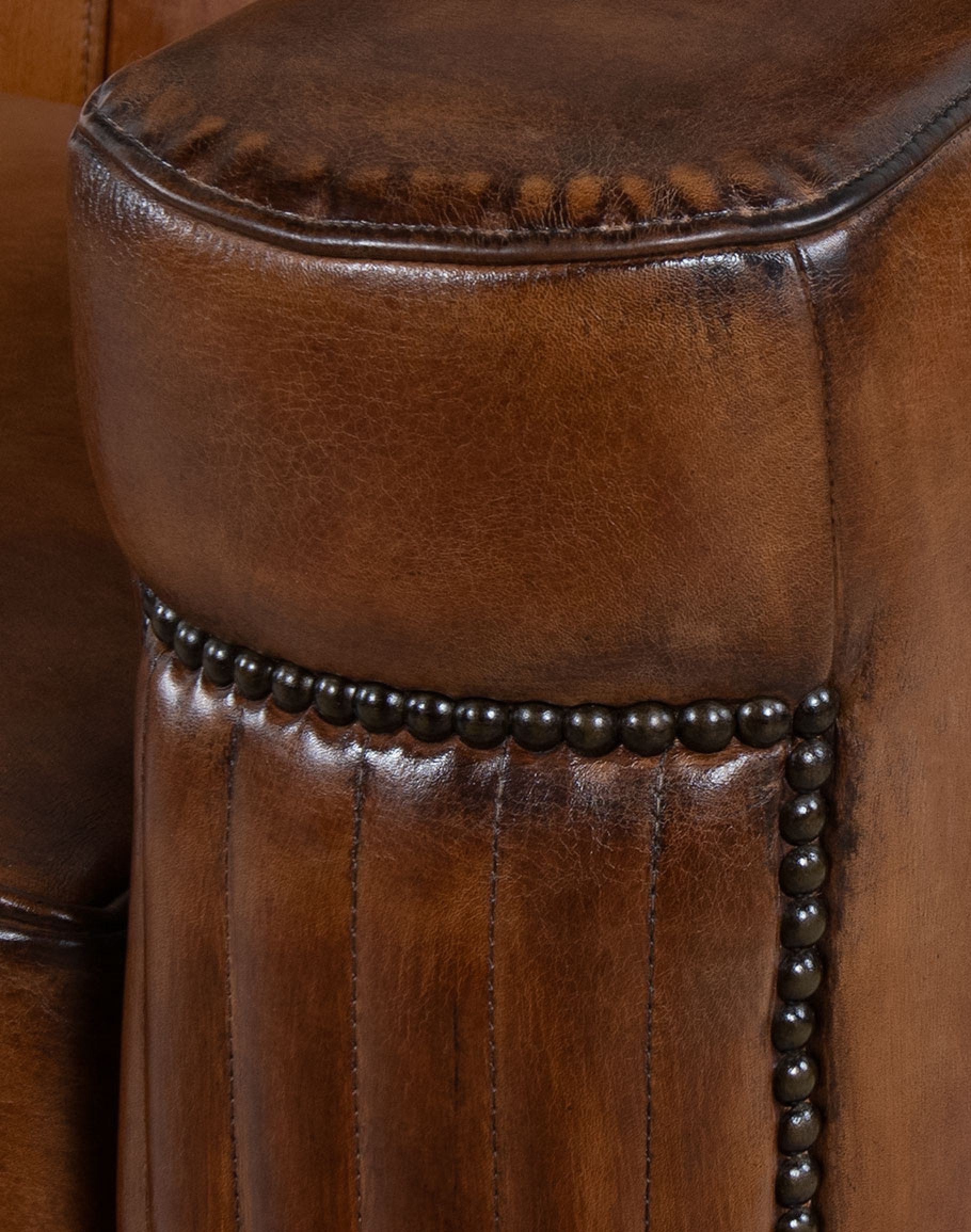 The Traeger Sofa is not only visually stunning but also incredibly comfortable. It features pleated stitched channels down the arm panels, beautifully accented with brass nail tacks that provide a touch of classic elegance. The large, flat armrests are designed for ultimate comfort, making this sofa a perfect spot for relaxation.