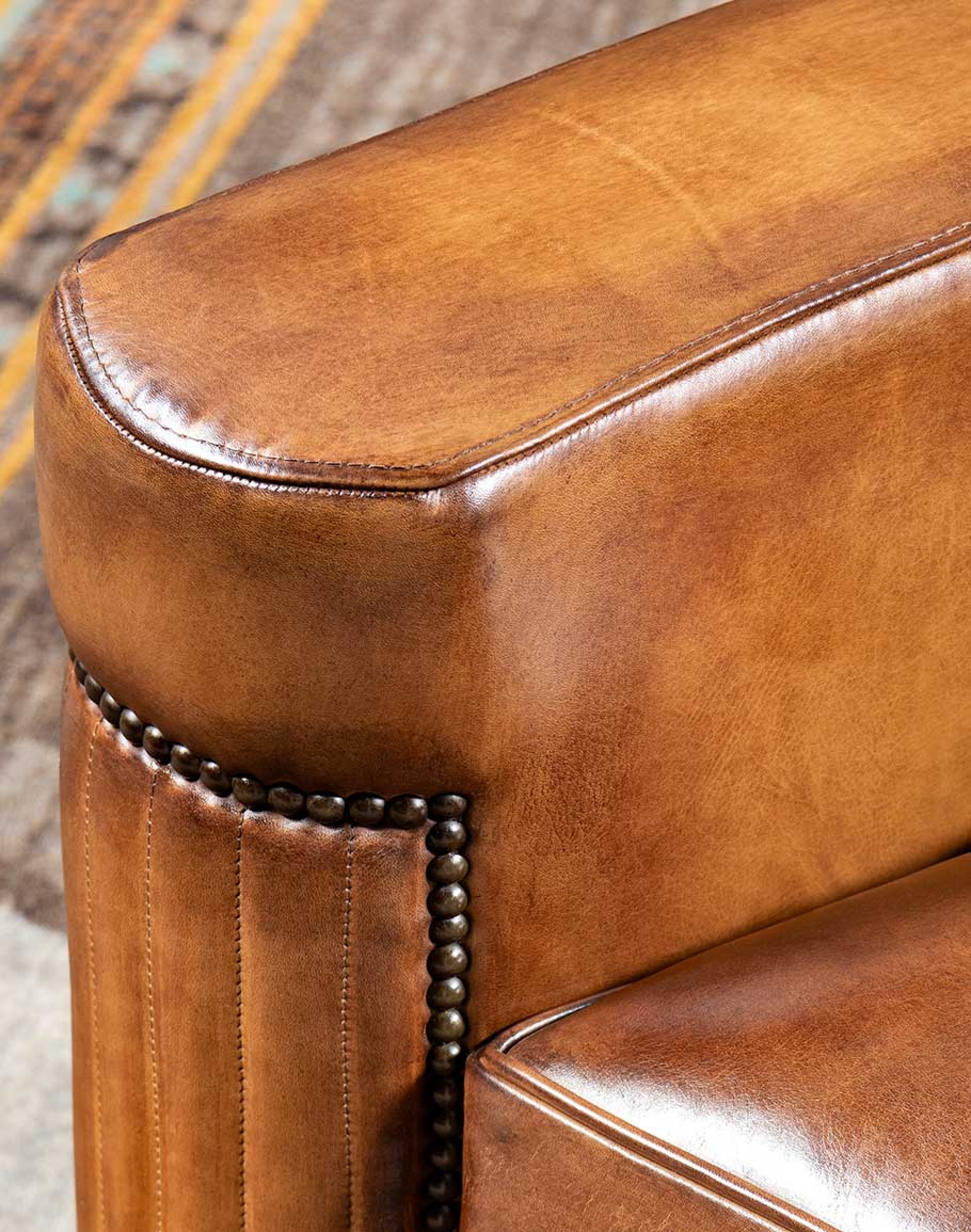 The Traeger Chair is not only visually stunning but also incredibly comfortable. It features pleated stitched channels down the arm panels, beautifully accented with brass nail tacks that provide a touch of classic elegance. The large, flat armrests are designed for ultimate comfort, making this chair a perfect spot for relaxation.