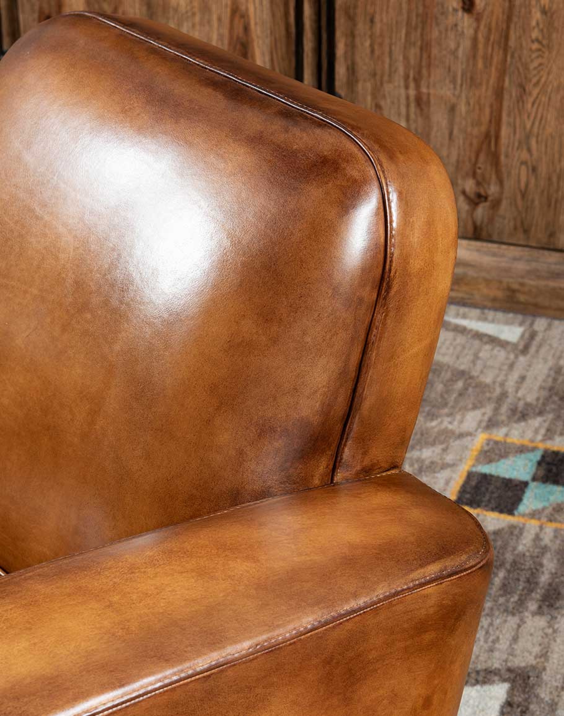 Leather Description: This is a full grain aniline leather tanned in a historic leather producing region of Italy using English hides. The century old tannery prepares this leather article by applying a hot wax, then turning the hides in old wooden tanning drums overnight to soften the natural fibers and impart it with a remarkable suppleness. The leather is then upholstered in its "crust form" on the furniture in North Carolina, After the furniture is made our leather artisans apply a multi step hand rubbed Patina using the same waxes and pigments used in Italy. Performing this process on the actual finished piece allows our artisans to develop a unique Patina, composition, and overall essence that creates a piece of furniture that has uniqueness, character and style that matches the individual who's selecting it. This leather imparts the feeling of a softer, well broken in leather one might find on a decades old chair discovered in a French country estate or the Parisian flea market. The leather is brand new from our Artisans hands... without the aging issues that sometimes come from the hands of time. Truly a unique, hand-made article in an era when only companies committed to the highest standards lavish this sort of attention and time to unique American made furniture.
