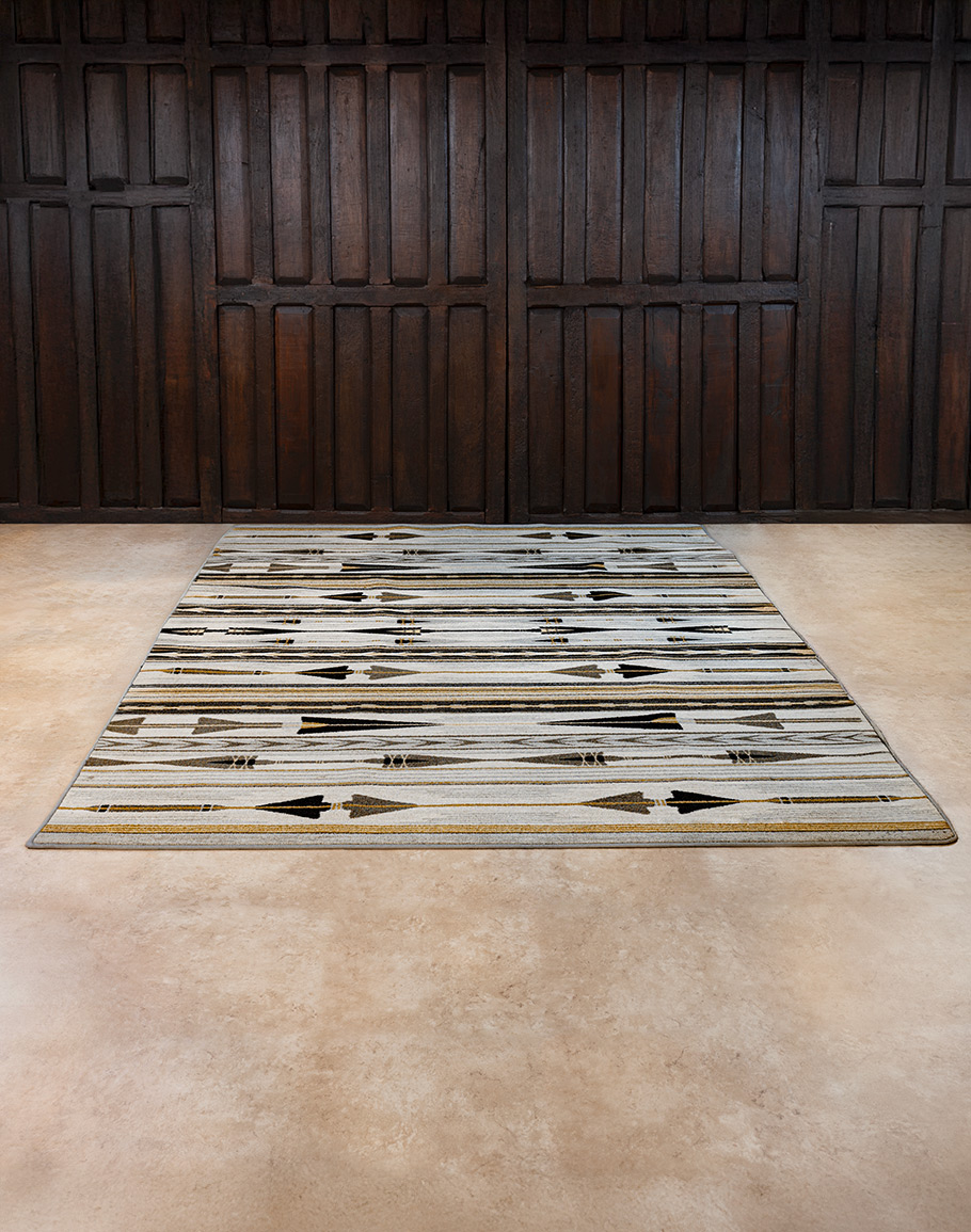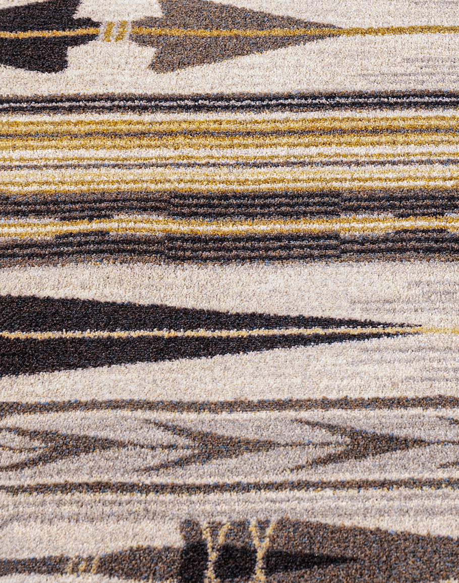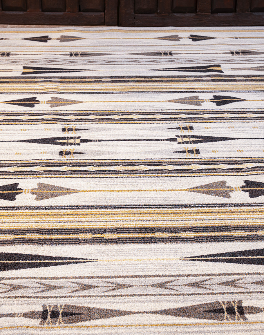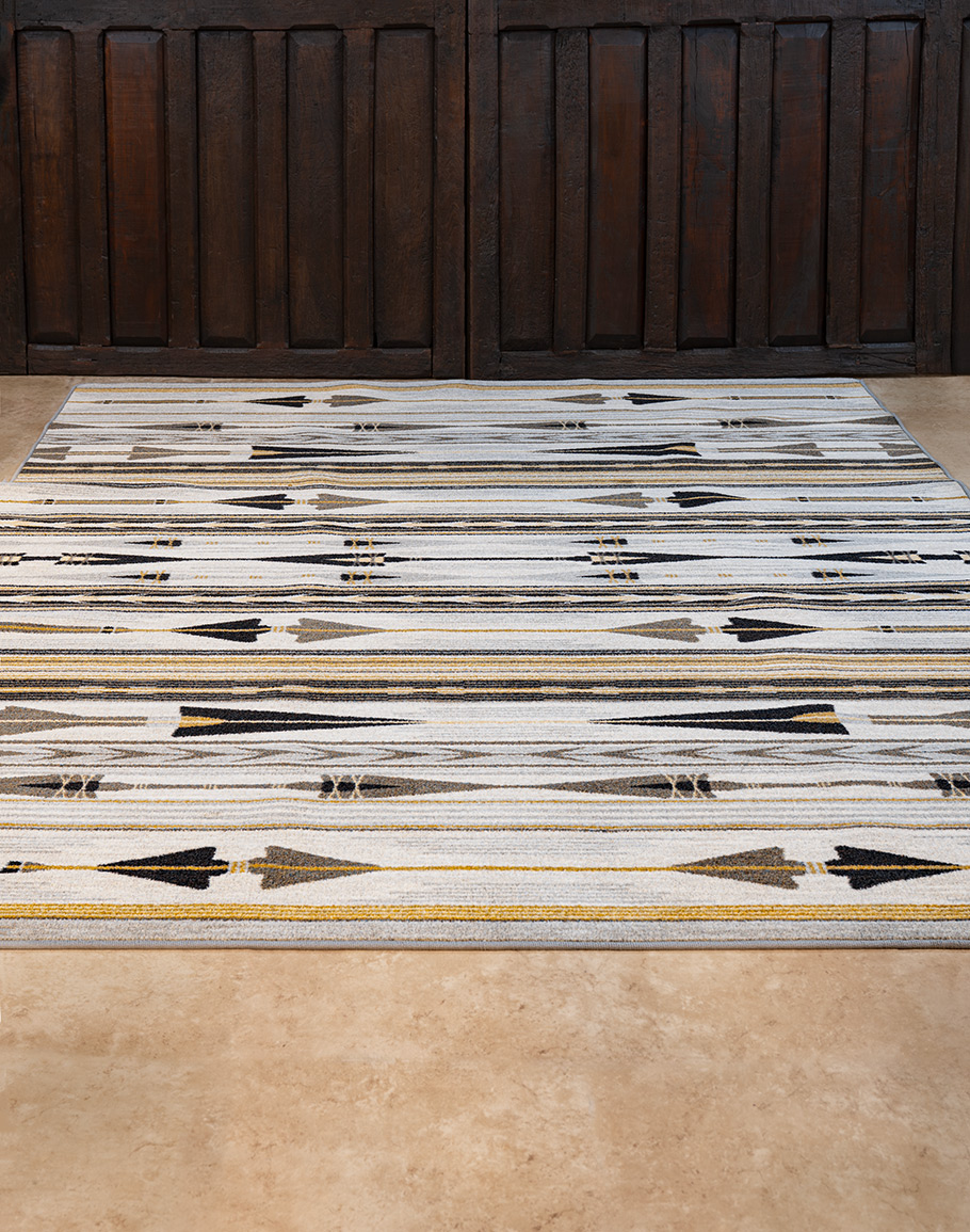 The Tucson Pass Southwestern Rug captures the spirit of the American West with its refined arrow pattern and earthy desert-inspired palette. Shades of warm sand, ivory, charcoal, and muted gold flow together in a linear Southwestern design that evokes the tones of sunlit mesas and desert trails. The subtle layering of neutral hues gives the rug versatility — sophisticated enough for a modern ranch home yet authentic in its Western roots. Crafted for durability and comfort, this rug anchors any space with understated texture and depth. Perfect for Adobe Interiors’ Desert Ranch and Refined Ranch Collections, the Tucson Pass Rug complements leather furnishings, natural woods, and warm metal accents, bringing timeless Southwestern character to any room.