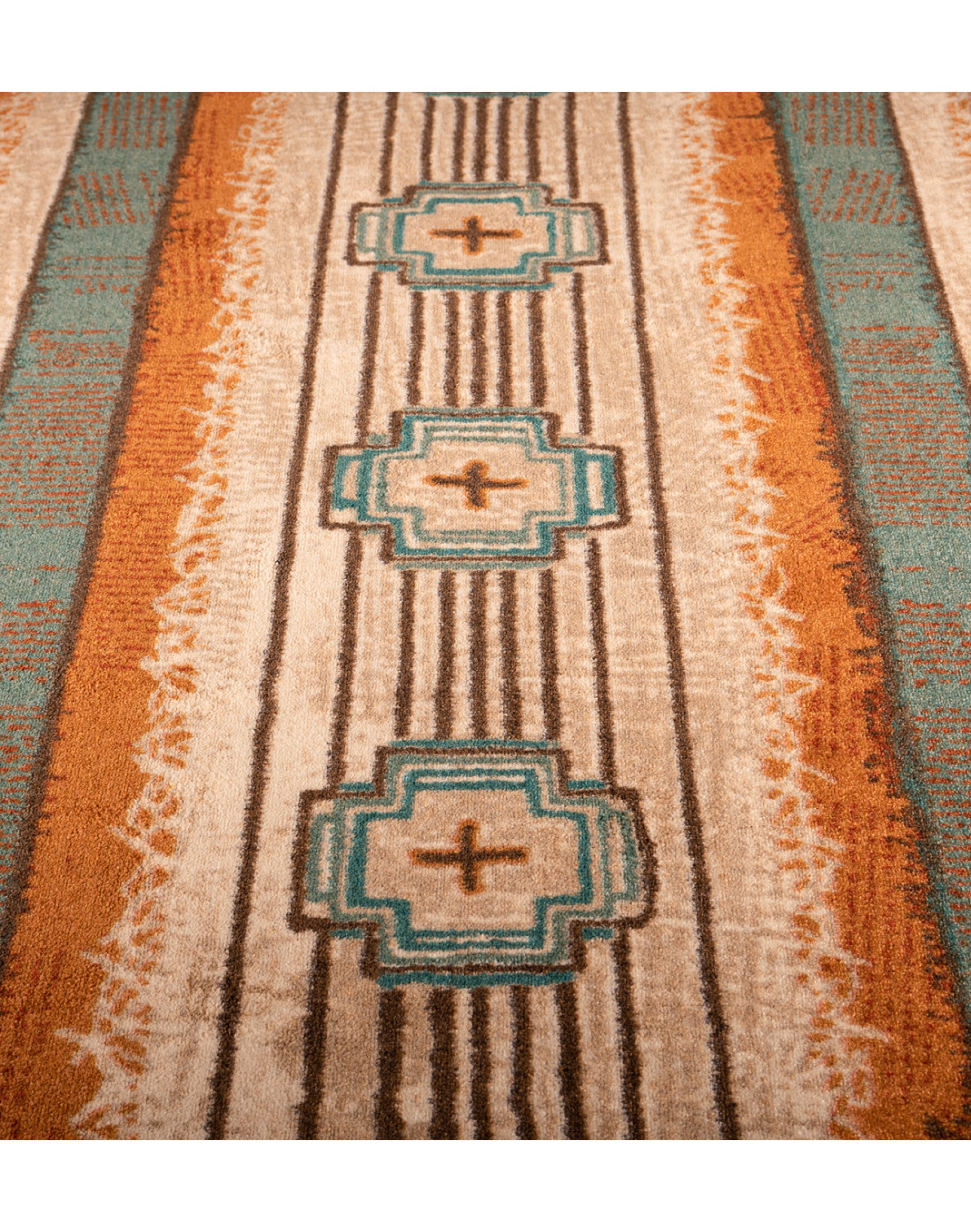 The Tucson Teal Rug is Available in 6 different sizes and made to order. Made in the U.S.A from premium EnduraStran Nylon. Commercial grade rated and easy clean with water.