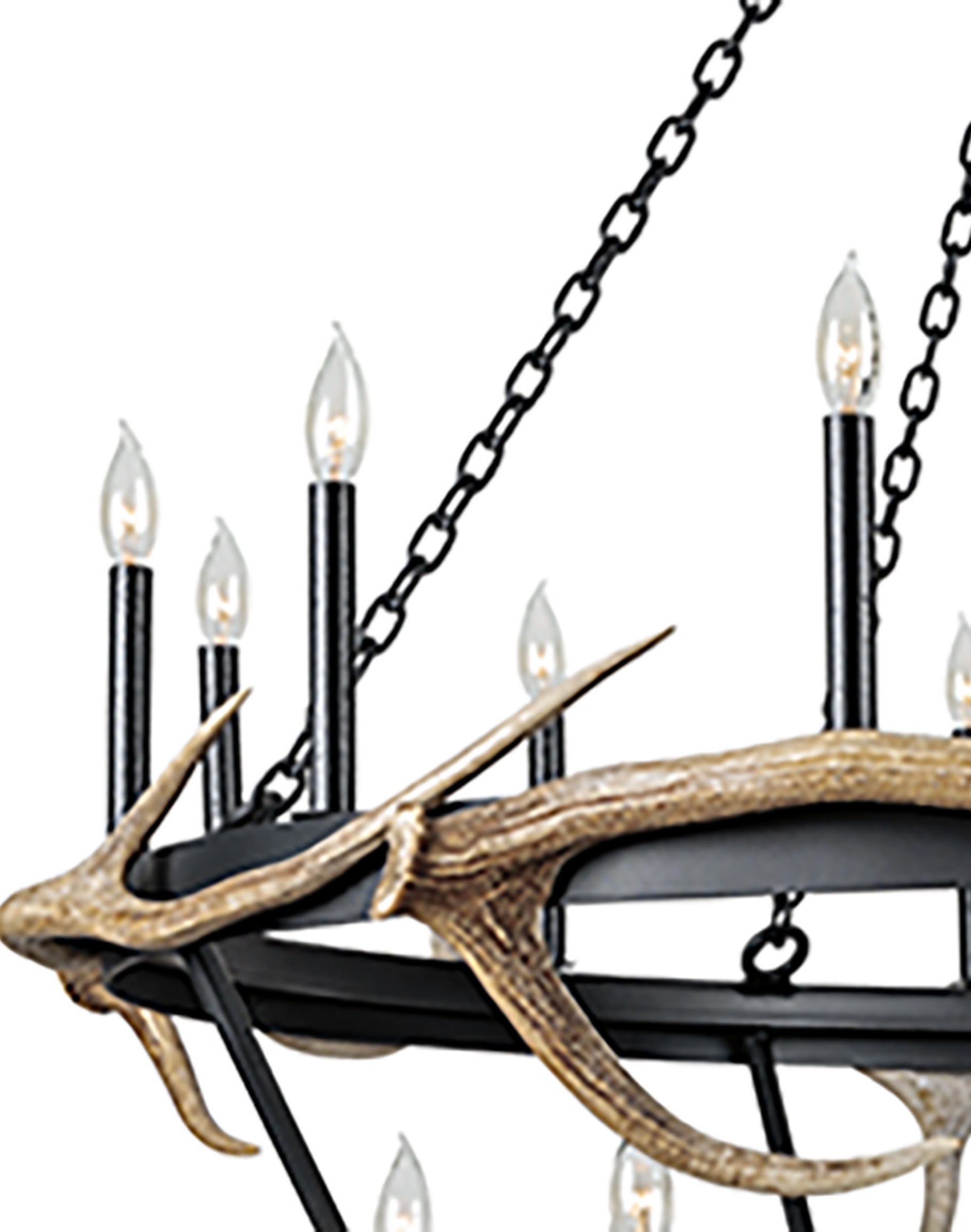 The Two Tier Marla With Antler Chandelier with two circular metal tiers in a textured matte black finish are suspended by sturdy matching chains, creating a strong architectural silhouette that feels open and airy even at its generous size.Each ring is wrapped with sculpted antler detailing in a natural weathered antler finish—a mix of warm sand, taupe, and soft bone tones that read authentically rustic without overpowering the design. Slender candle-style uprights rise from both tiers, each topped with a clear flame-tip candelabra bulb that mimics the look of classic candlelight and provides beautiful 360° ambient illumination.