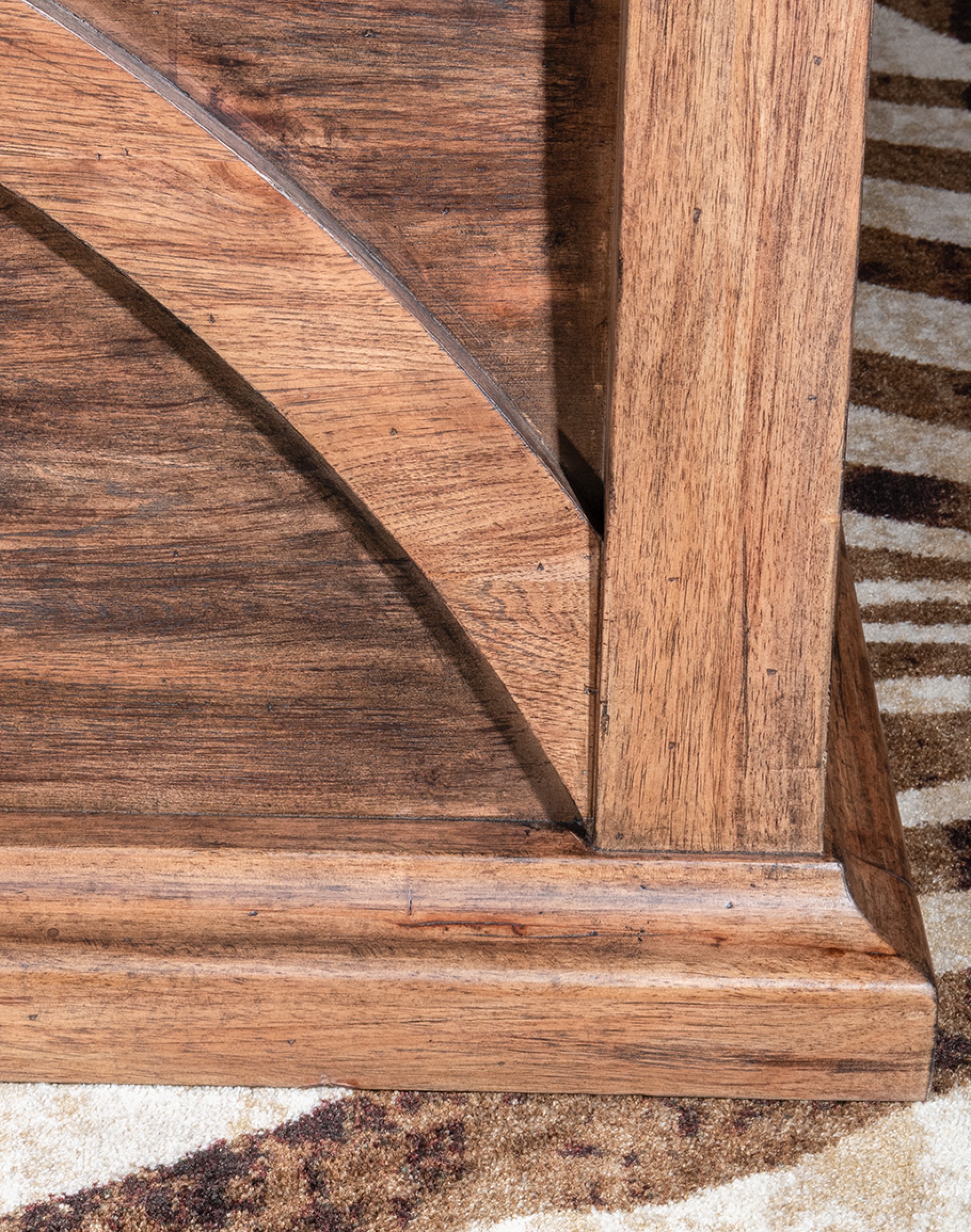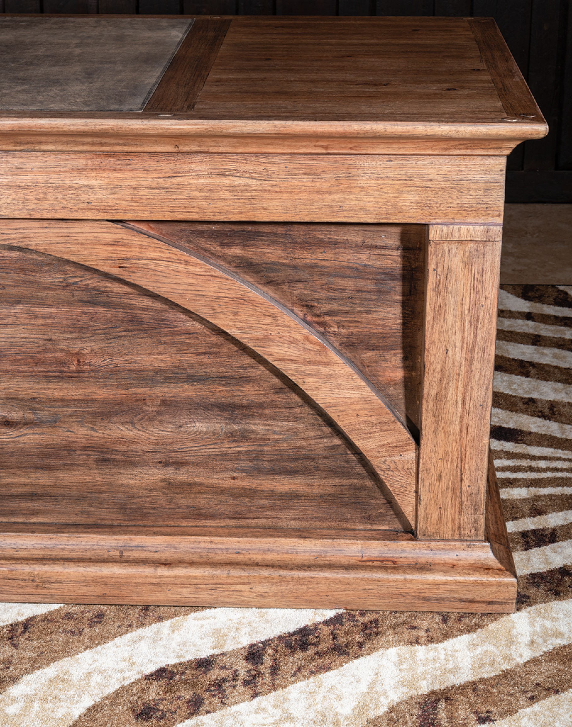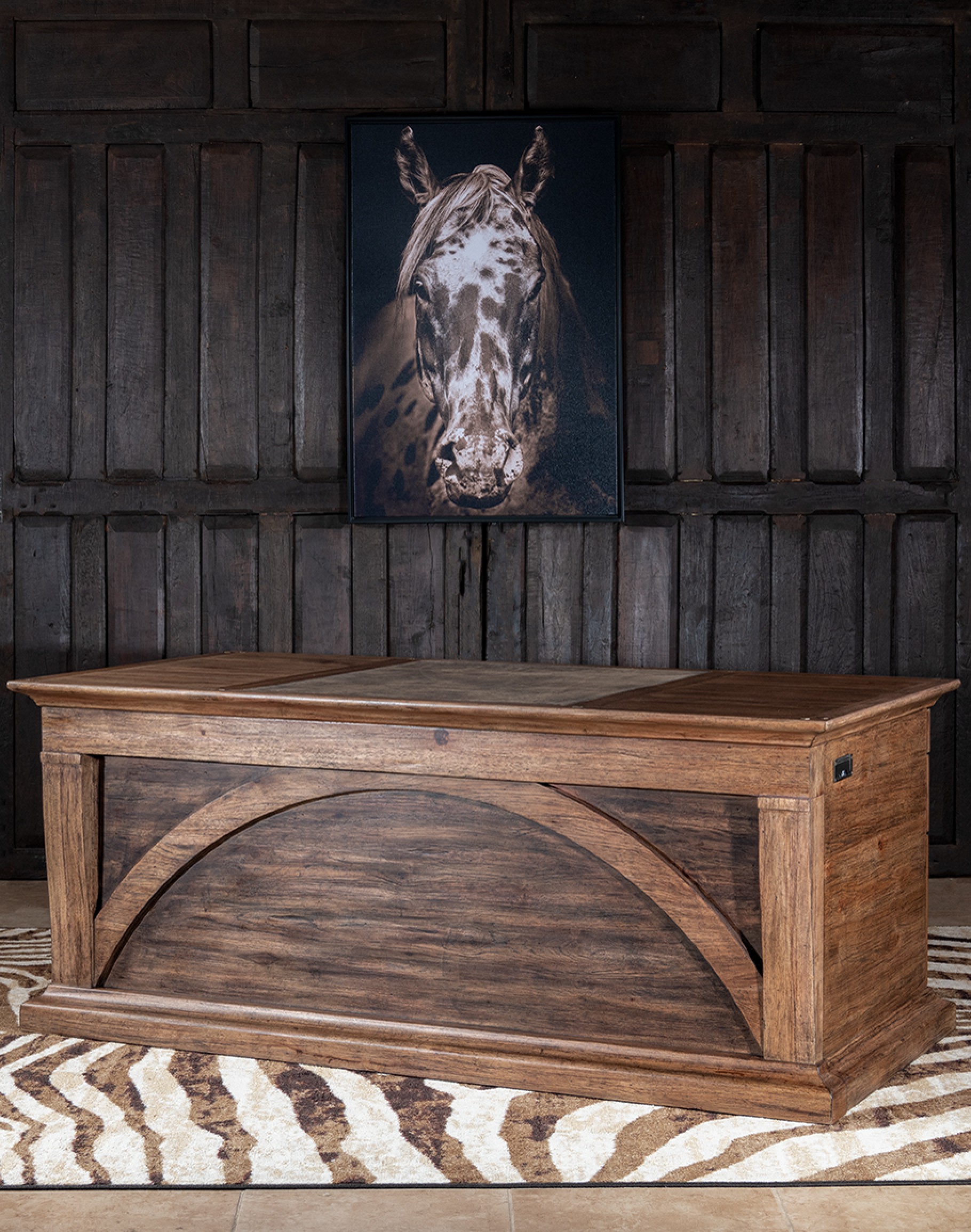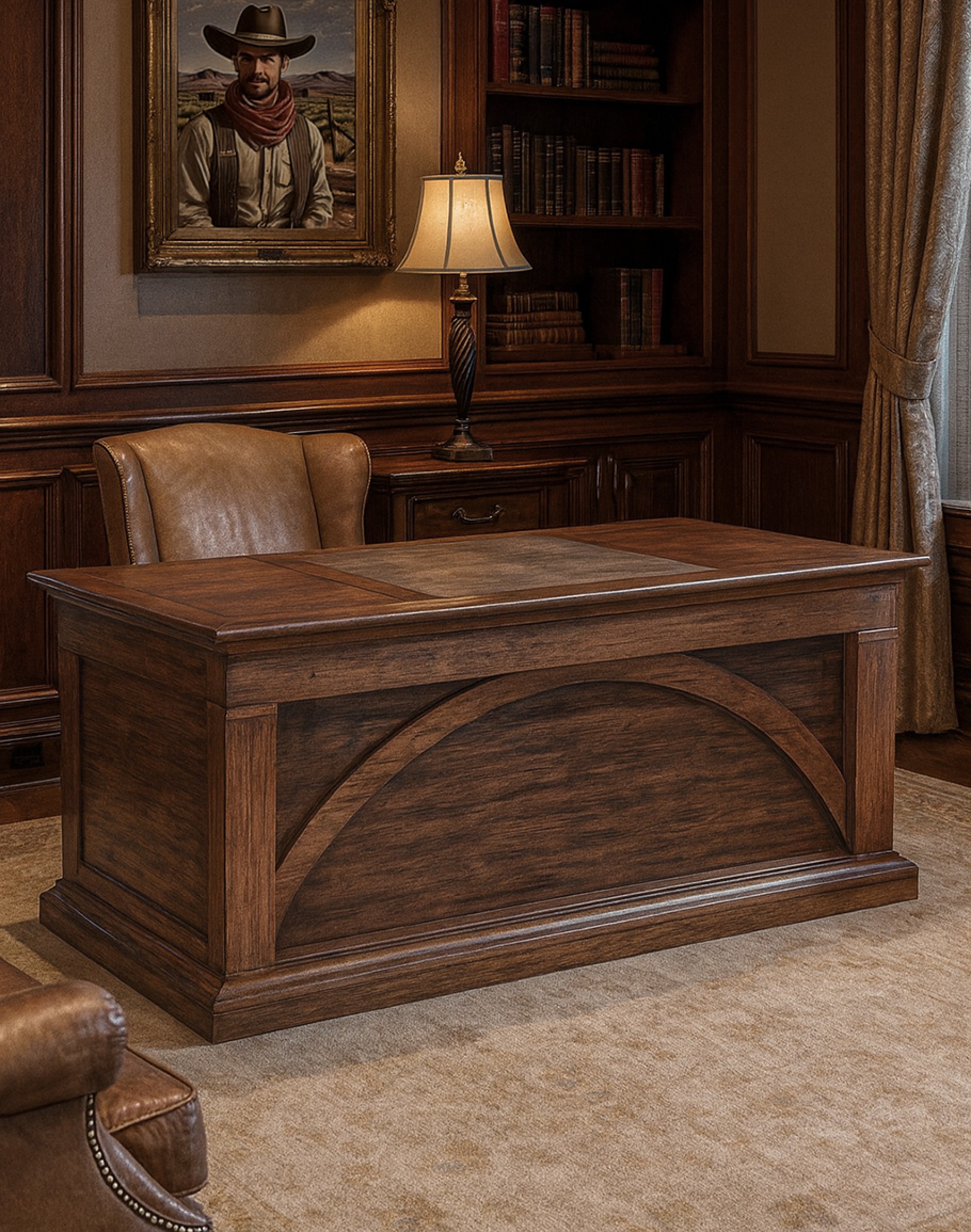On the visitor's side, the desk showcases a distinctive arch design, symbolic of the grandeur of American landscapes. Drawing inspiration from post and beam construction, Adobe Interiors captures the essence of craftsmanship in its TX Collection, with furnishings embodying the rustic charm of hickory wood and rich finishes like charred timber, dusk, and avalanche.