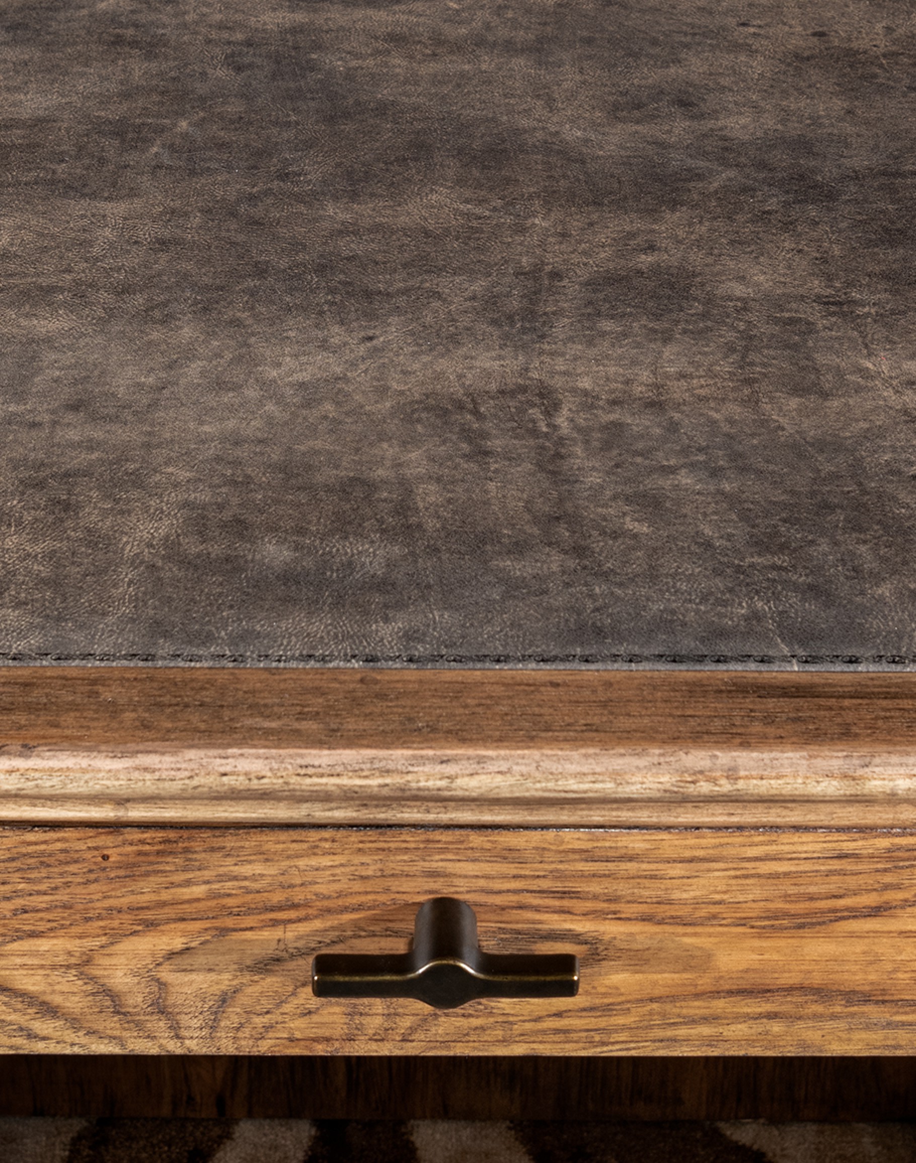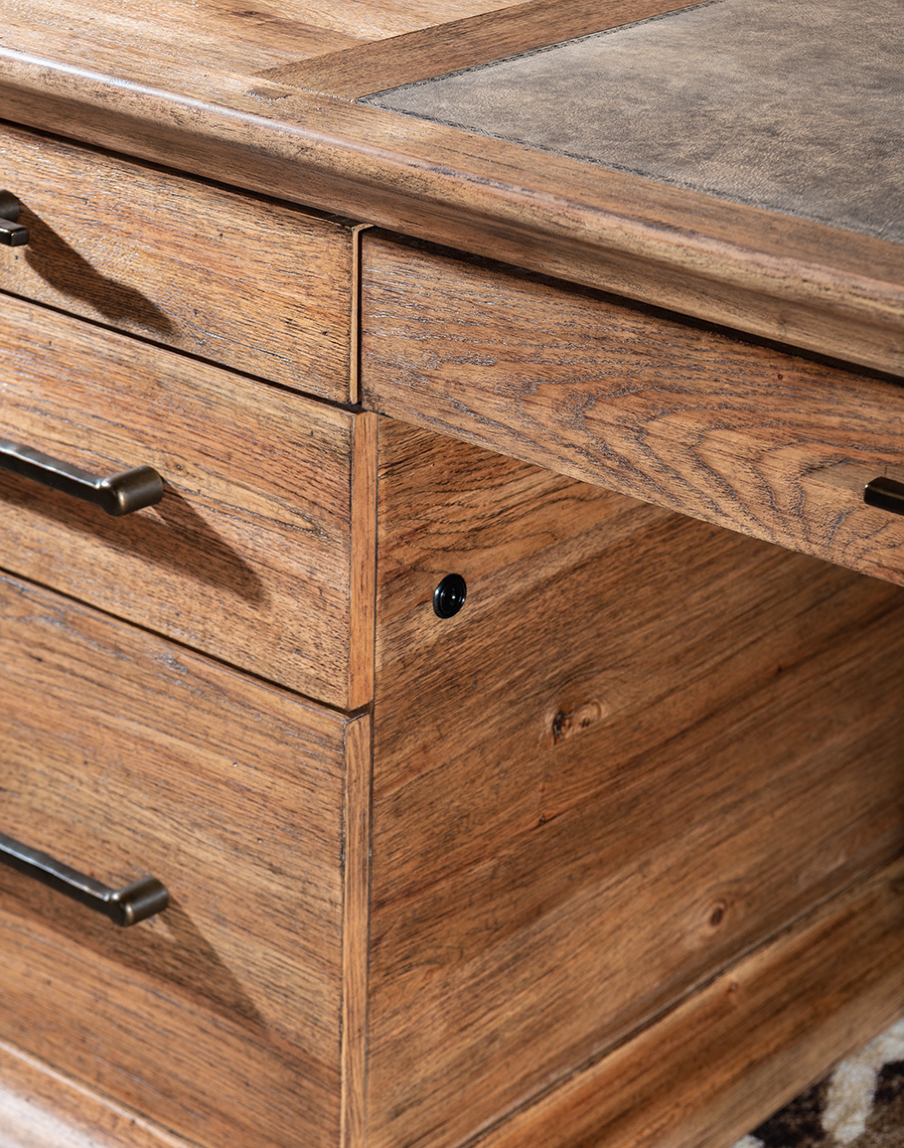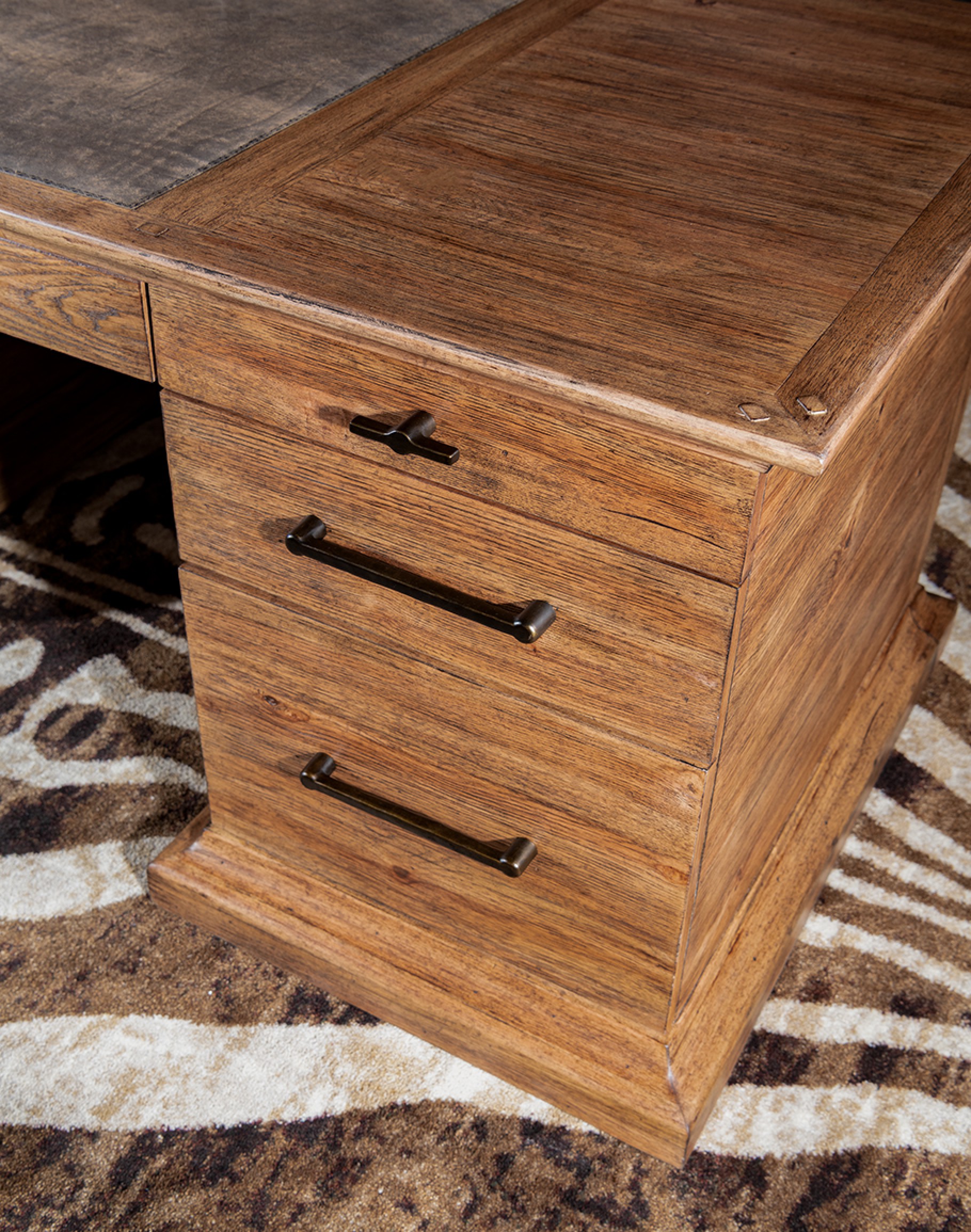 Immerse yourself in the spirit of the American wilderness with our magnificent TX Executive Desk. This rustic executive desk, made from Pecky Hickory Wood with a Vintage Natural finish, captures the allure of natural landscapes and wide-open spaces. Its solid wood edged top and top-grain-leather writing surface contribute to a work environment that is both inspiring and functional.