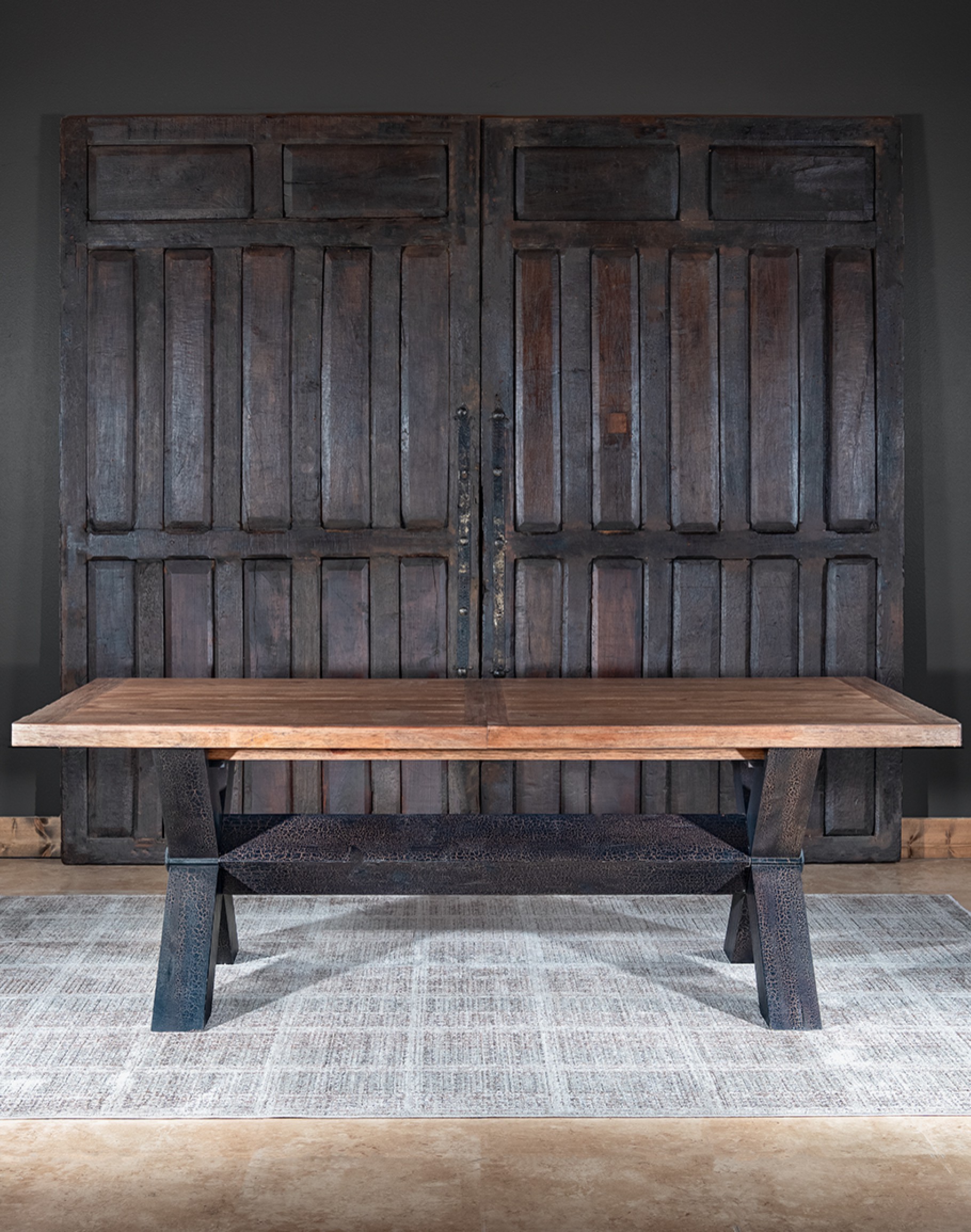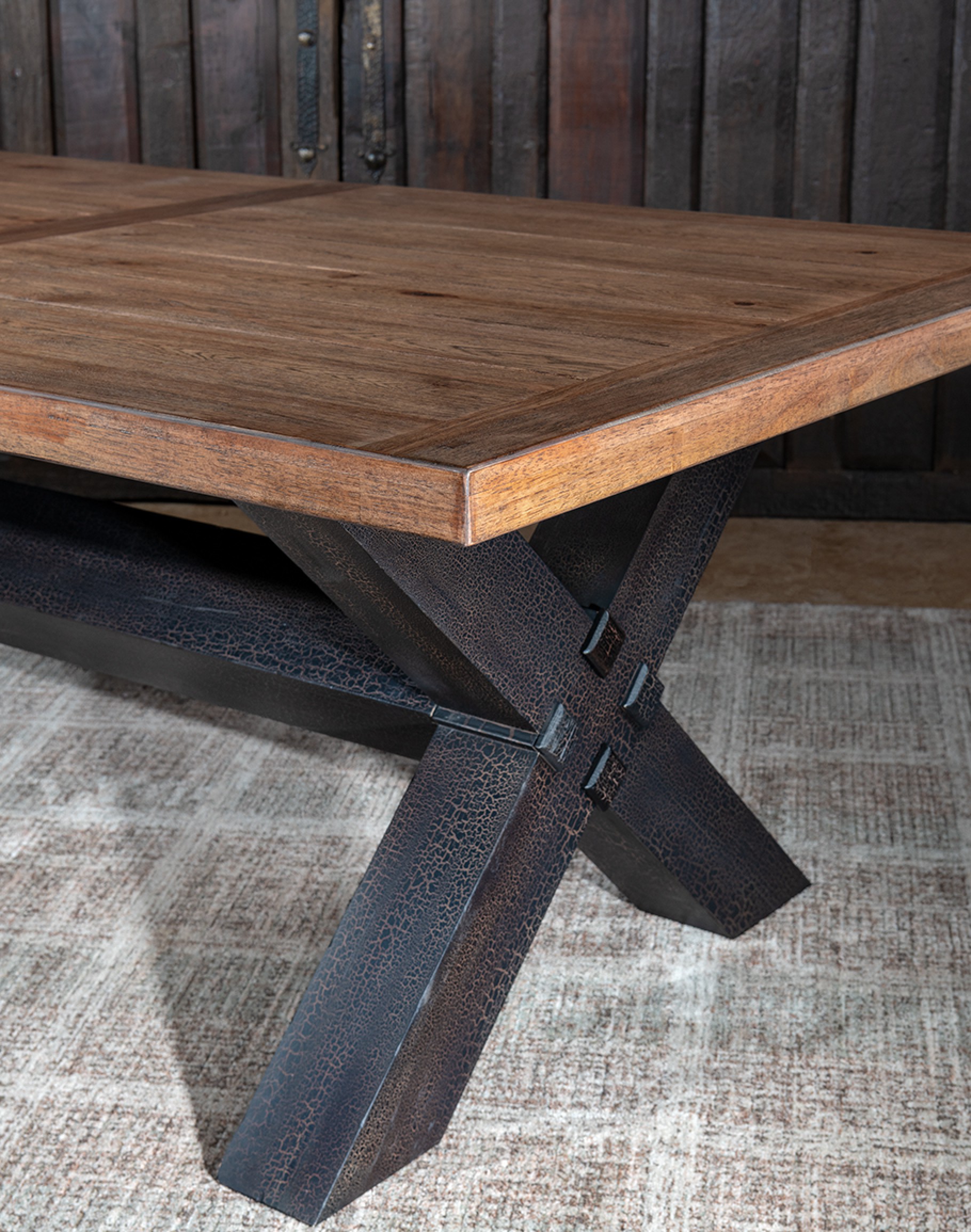 Create a dining experience as expansive as America's wilderness with the TX Trestle Dining Table. Crafted from solid Hickory wood, this table features an authentic solid-wood edged top finished in warm Vintage Natural. The striking X-style base in Charred Timber finish provides a dramatic contrast, adding a rustic yet refined touch to your dining space. With two 20-inch leaves, this table extends to 132 inches, accommodating up to 10 chairs. Without the leaf, it seats 6; with one leaf, it seats 8. Embrace the natural beauty and mystical essence of the American wilderness with this exquisite piece.