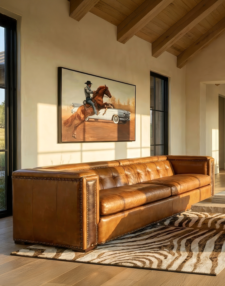 Our Urban Architect Sofa is a modern rustic style with timeless comfort and quality. Starring in our refined and eclectic ranch styles, it is the perfect addition to your urban or western-styled space. Upholstered in hand-burnished leather to achieve an aged patina in just the right places to reflect the aged qualities that only time, wear, and frequent care could have accomplished naturally. The large boxy arms and studded genuine brass nail heads add that rustic feel while maintaining a modern design. The stylish looks and comfort of the Urban Architect Leather Sofa are top-of-the-line inside and out! Constructed with a hardwood frame and high-density foam cushion, it ensures lasting comfort and durability. 100% American-made to the highest quality of standards and craftsmanship! At Adobe Interiors, we create the furniture, and you create the memories.