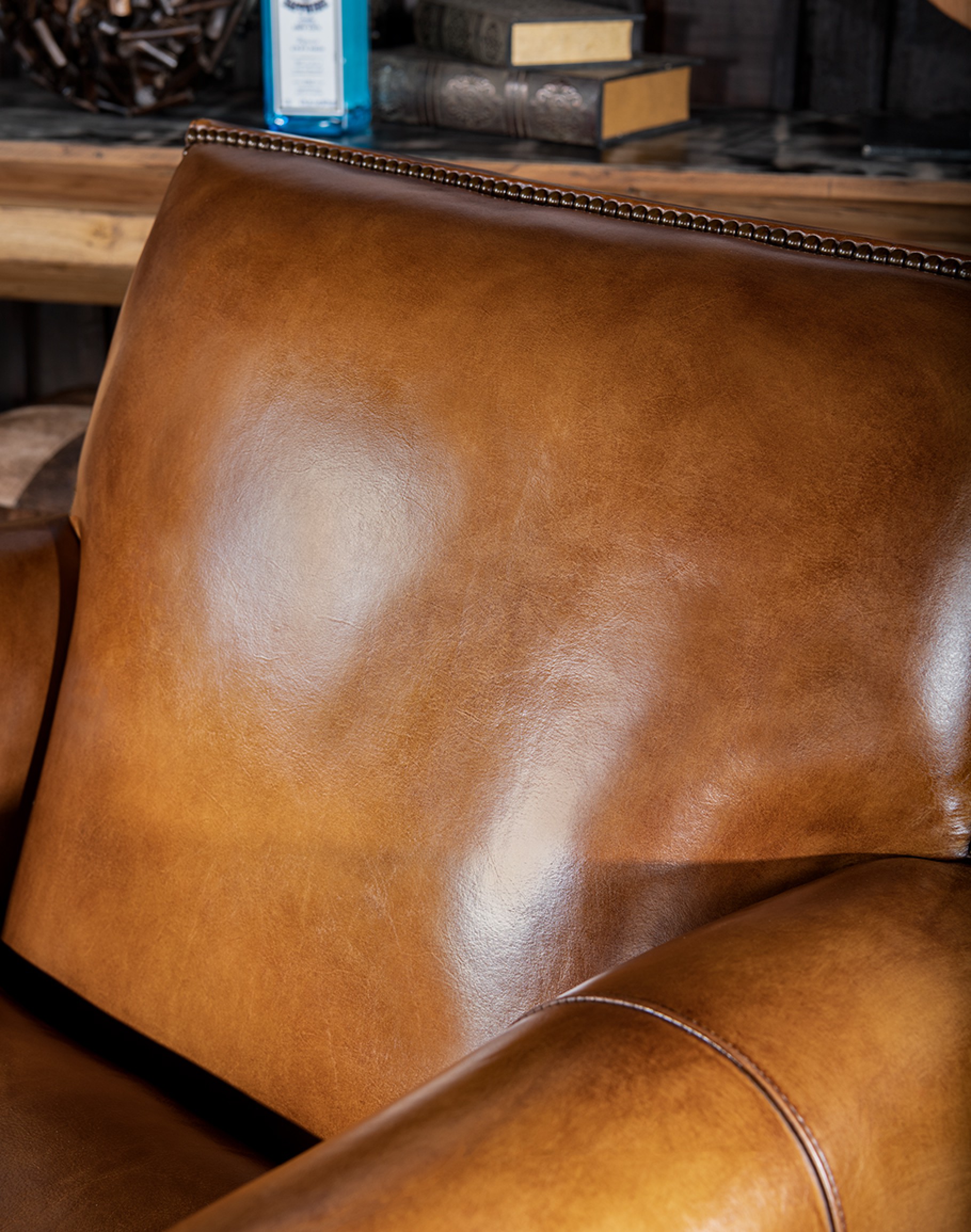 Leather Description: Artisan Leathers beautifully evoke this time worn quality, unique to every individual piece, like the originals. To pure aniline leather crusts, already fully and carefully upholstered to the piece, a base color is created with multiple applications of waxes and oils, hand-worked by the leather Artisan. After drying, this craftsman then carefully builds-up the finish with an expert’s eye, and touch, to achieve an aged patina in just the right places to reflect the aged qualities only time, wear, and frequent care could have accomplished naturally. Every individual piece upholstered with Artisan Leather finishing methods is first beautifully built to the highest standards of quality. The leather is then hand-colored and aged to bespeak the loving touch of time, providing a quality antique appearance to a beautiful new piece of quality leather furniture. Every chair, sofa, or bench has its very own unique identity only these hand-crafted methods can provide, reflecting the presence of a time honored past.