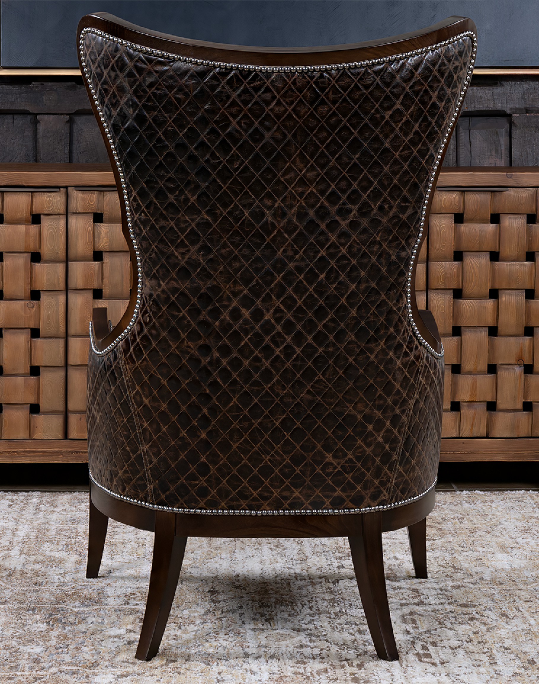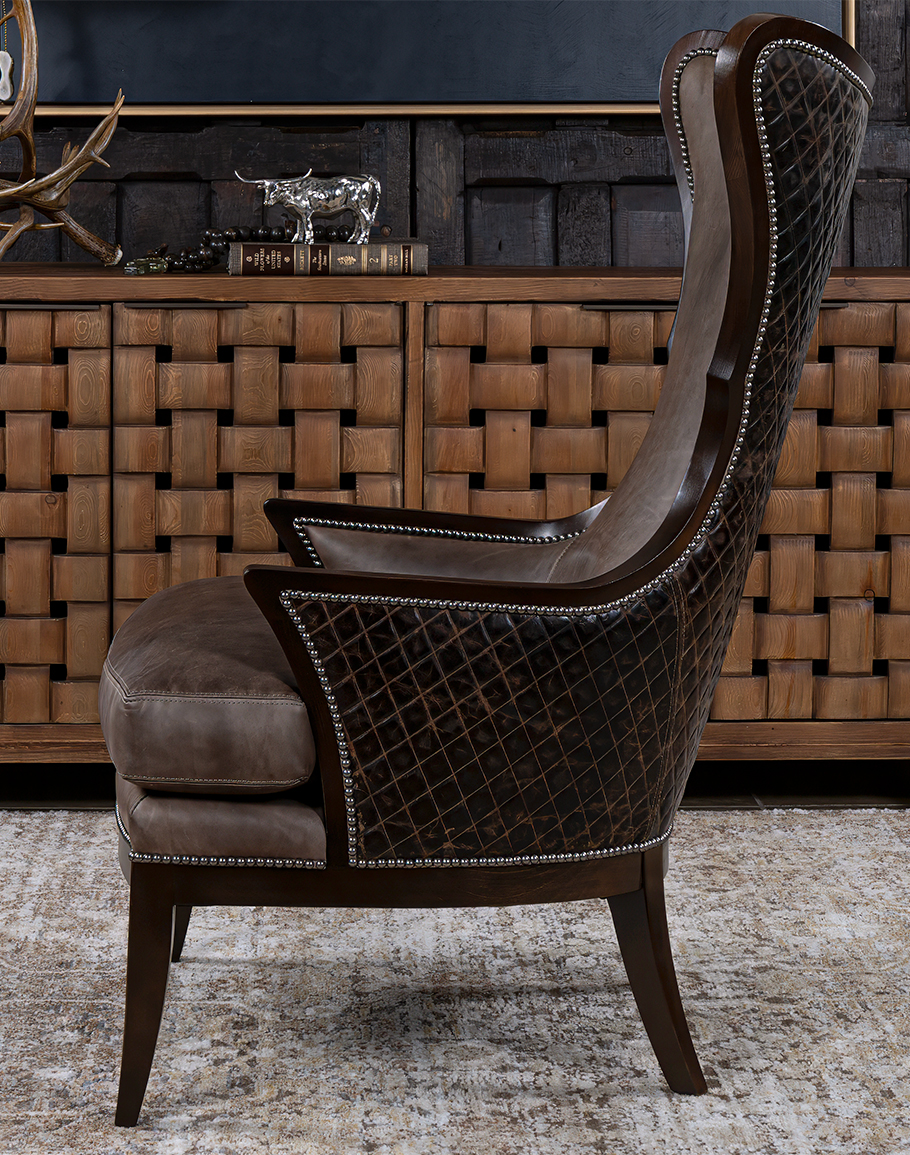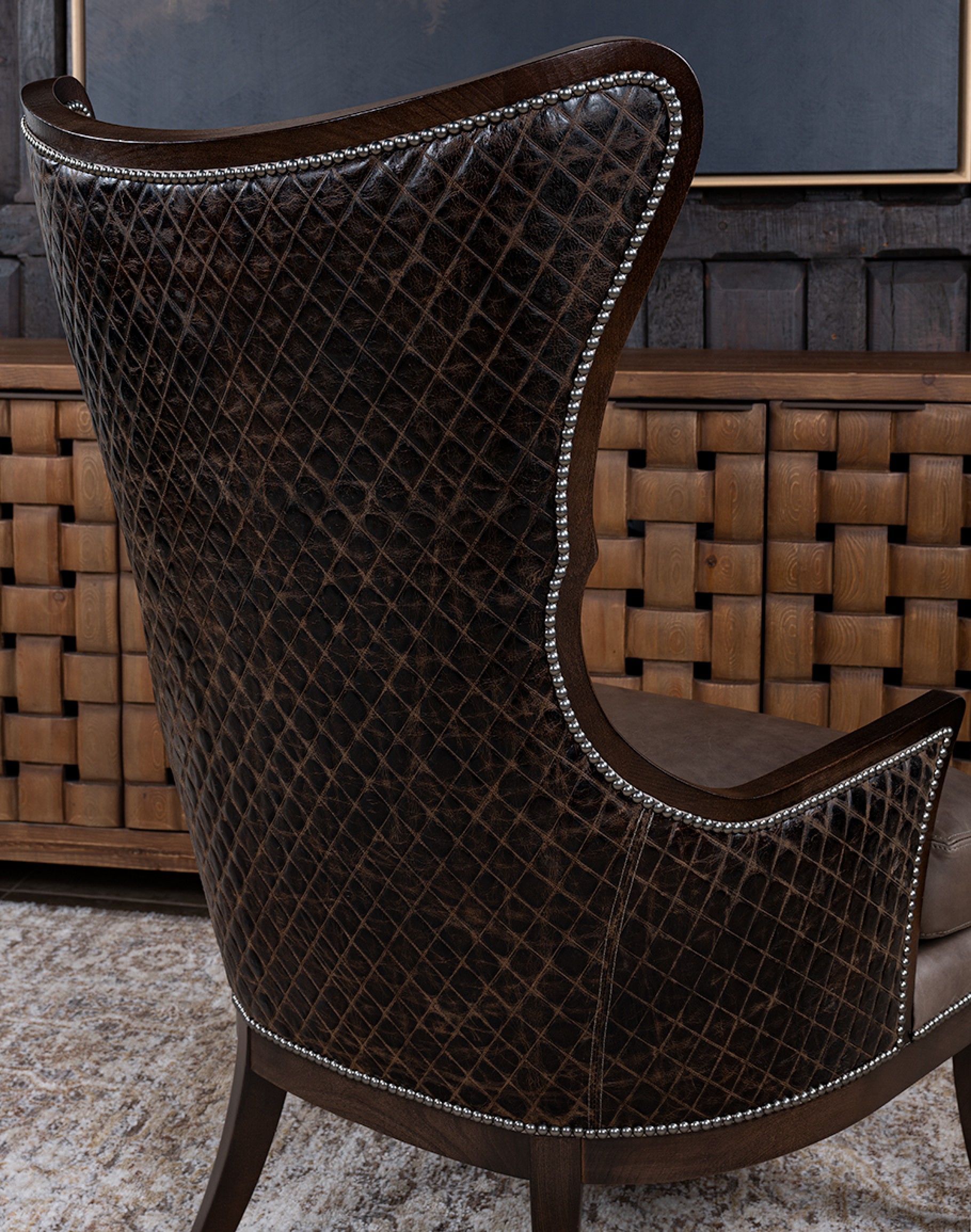 The Veranda Dove Leather Wingback Chair marries refined tailoring with rugged sophistication. Its inside body is upholstered in a smooth dove, stone‑gray leather with subtle taupe undertones—while the outside back and arms showcase a contrasting Espresso leather with diamond quilting for texture and depth. A continuous line of hand‑applied pewter nailhead trim traces the sculpted silhouette, emphasizing the dramatic wing profile and flowing S‑curve arms. The exposed solid‑wood frame—hand finished in a deep Espresso tone—rests on tapered, slightly splayed legs for a poised, architectural stance.Built to the highest standards of quality and craftsmanship, this 100% American‑made wingback features a lounge‑scaled, loose boxed seat cushion with refined top‑stitching for sink‑in comfort and lasting support. The tall, shield‑shaped back cradles the shoulders while the wings provide a sense of enclosure ideal for reading nooks, fireside seating, or a distinguished pair in the living room.