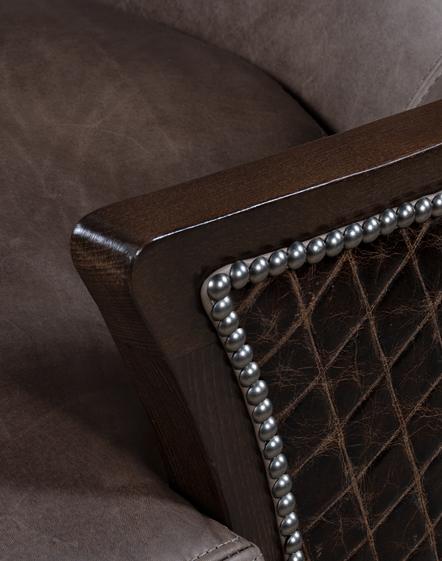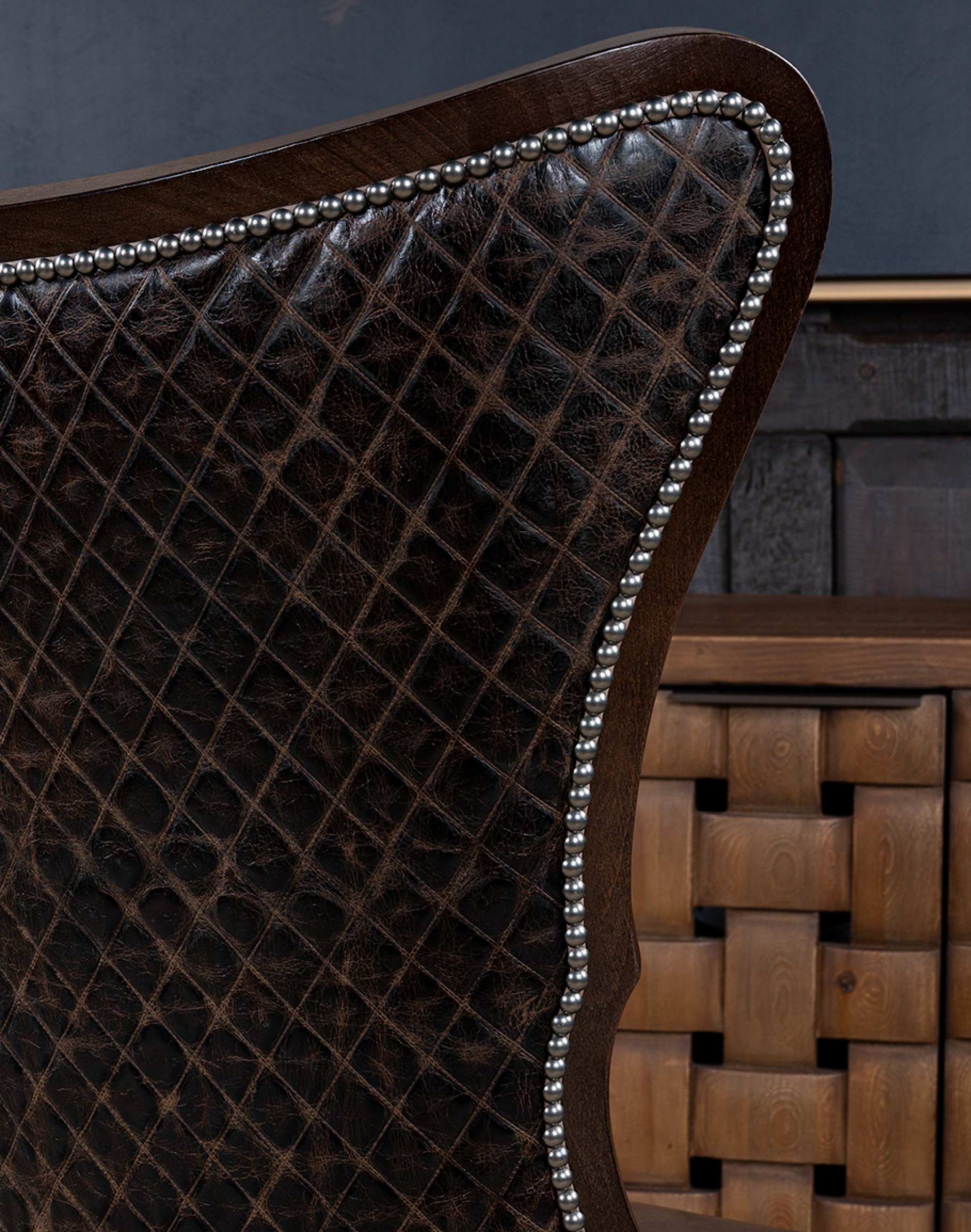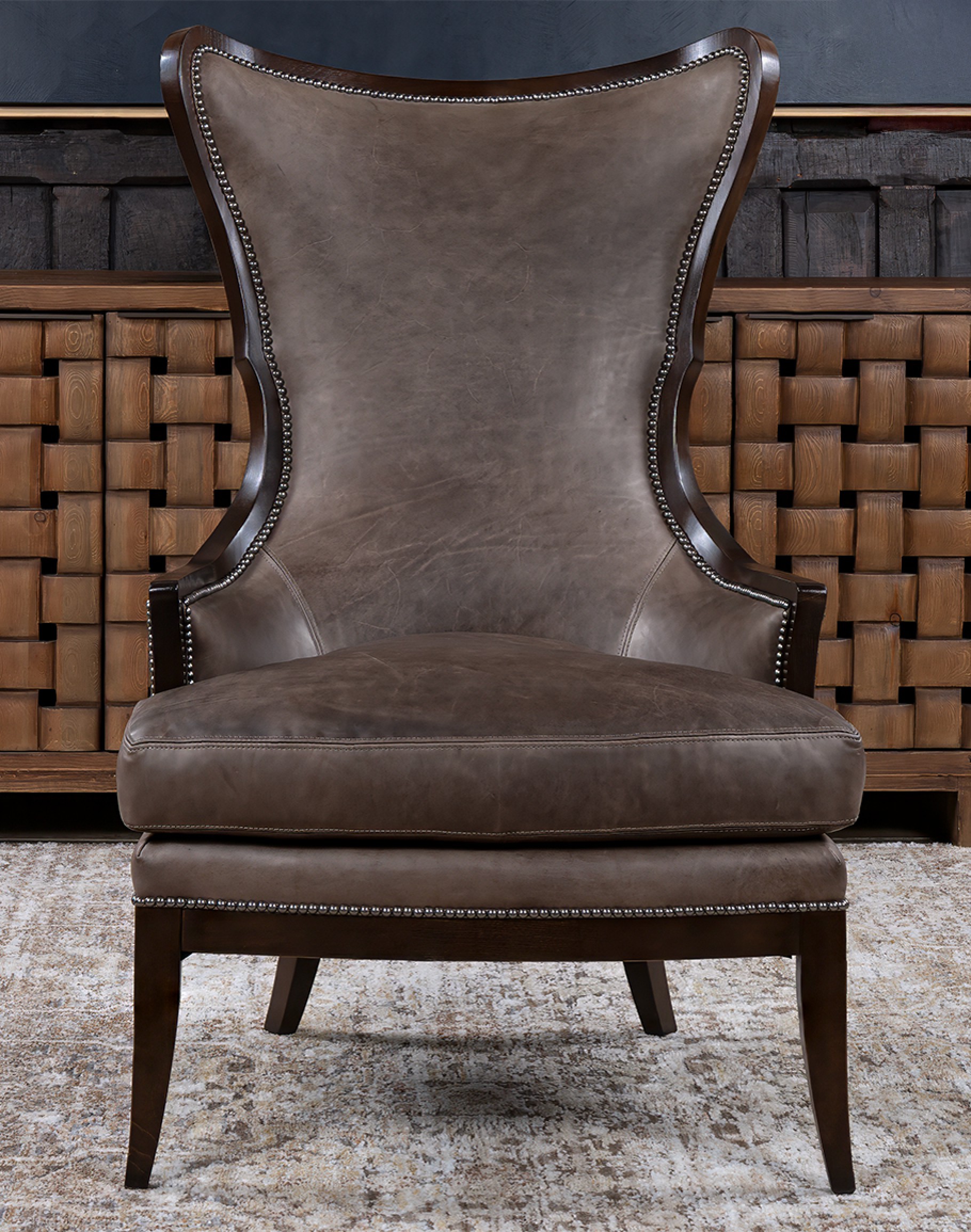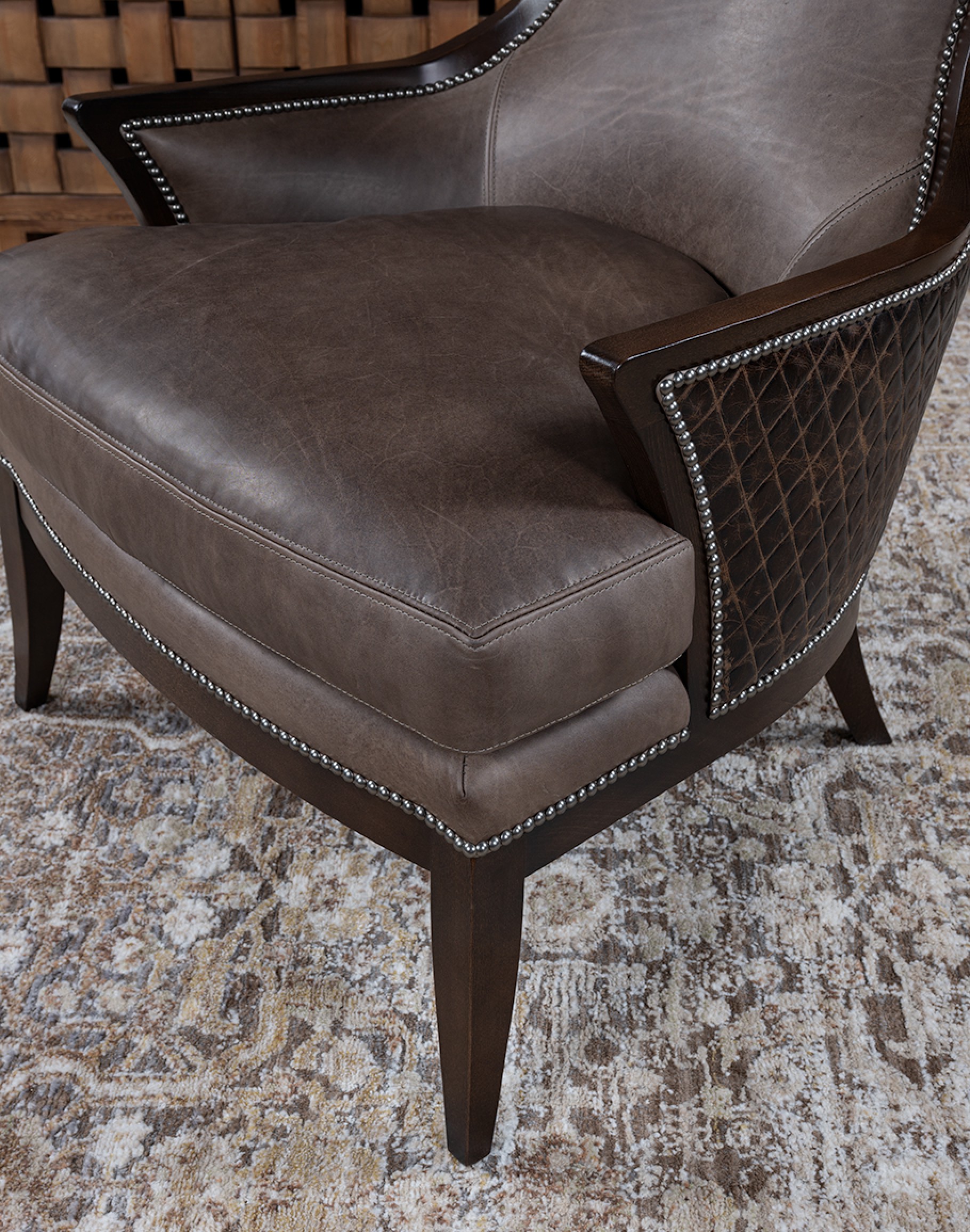 The Veranda Dove Leather Wingback Chair marries refined tailoring with rugged sophistication. Its inside body is upholstered in a smooth dove, stone‑gray leather with subtle taupe undertones—while the outside back and arms showcase a contrasting Espresso leather with diamond quilting for texture and depth. A continuous line of hand‑applied pewter nailhead trim traces the sculpted silhouette, emphasizing the dramatic wing profile and flowing S‑curve arms. The exposed solid‑wood frame—hand finished in a deep Espresso tone—rests on tapered, slightly splayed legs for a poised, architectural stance.Built to the highest standards of quality and craftsmanship, this 100% American‑made wingback features a lounge‑scaled, loose boxed seat cushion with refined top‑stitching for sink‑in comfort and lasting support. The tall, shield‑shaped back cradles the shoulders while the wings provide a sense of enclosure ideal for reading nooks, fireside seating, or a distinguished pair in the living room.