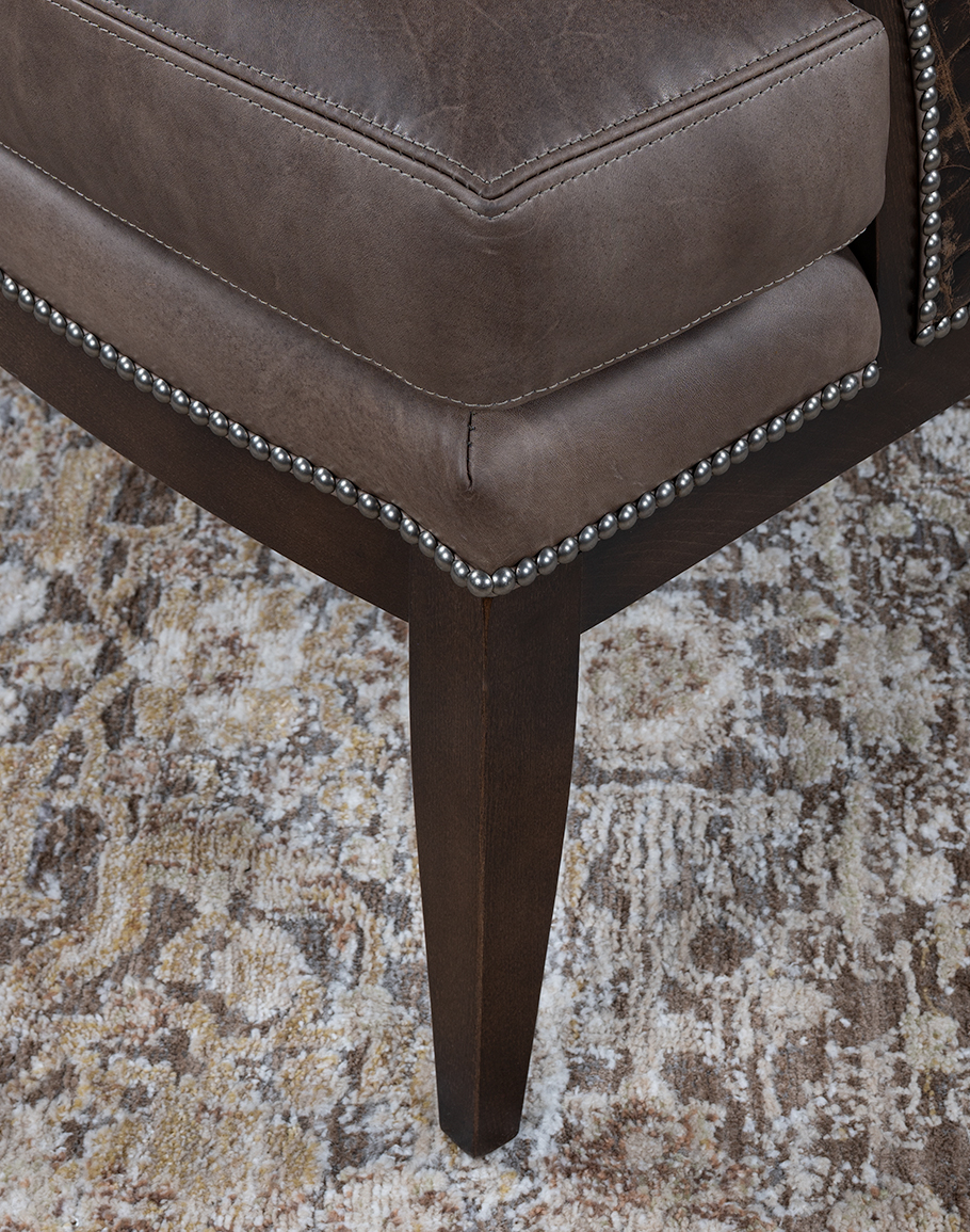 - Pewter nailhead perimeter detail highlights the silhouette Solid‑wood base and tapered legs in an Espresso finish