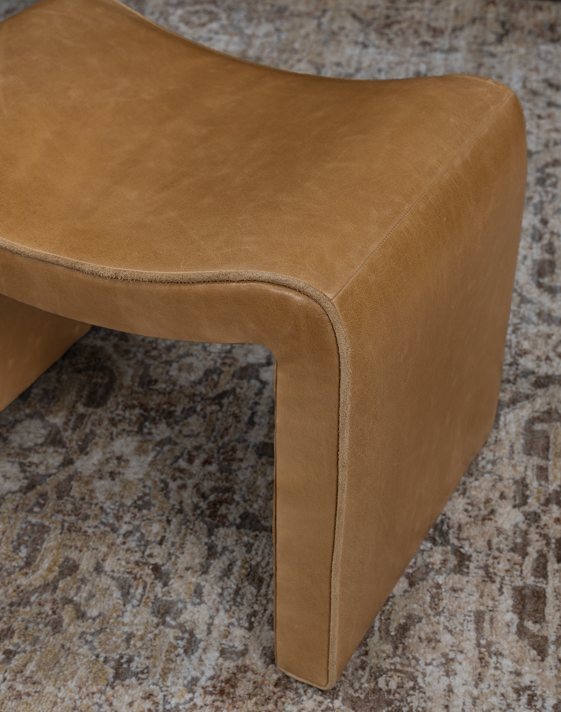 Defined by its distinctive waterfall shape, the stool features a continuous, U-shaped profile with softly rounded edges and a gently contoured seat. The form flows seamlessly from the top down into the legs, creating a smooth, monolithic appearance that feels both modern and organic. Its low, grounded stance and curved geometry give it a refined yet approachable presence, making it equally suited for layering or standing alone as a statement piece.
