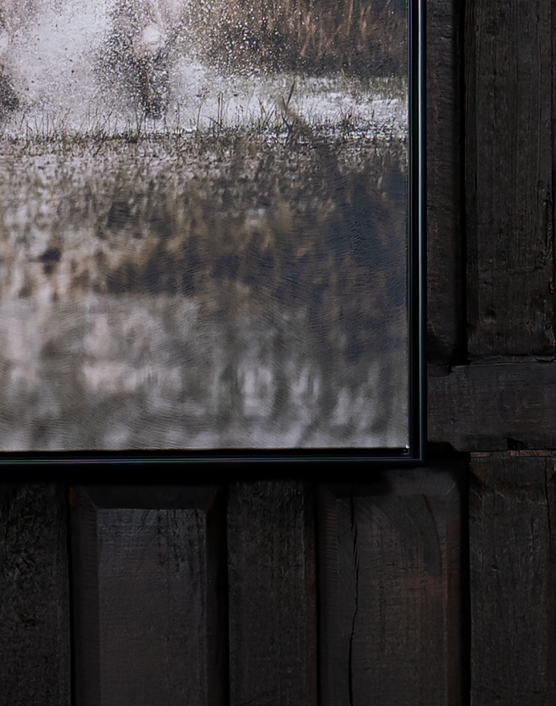 Framed in a sleek matte black gallery frame, the clean-lined profile gives the piece a modern edge while allowing the powerful imagery to remain the focal point. The wide horizontal orientation makes it ideal for placement above a fireplace, sofa, bed, or dining console, where it creates visual impact without overwhelming the space.
