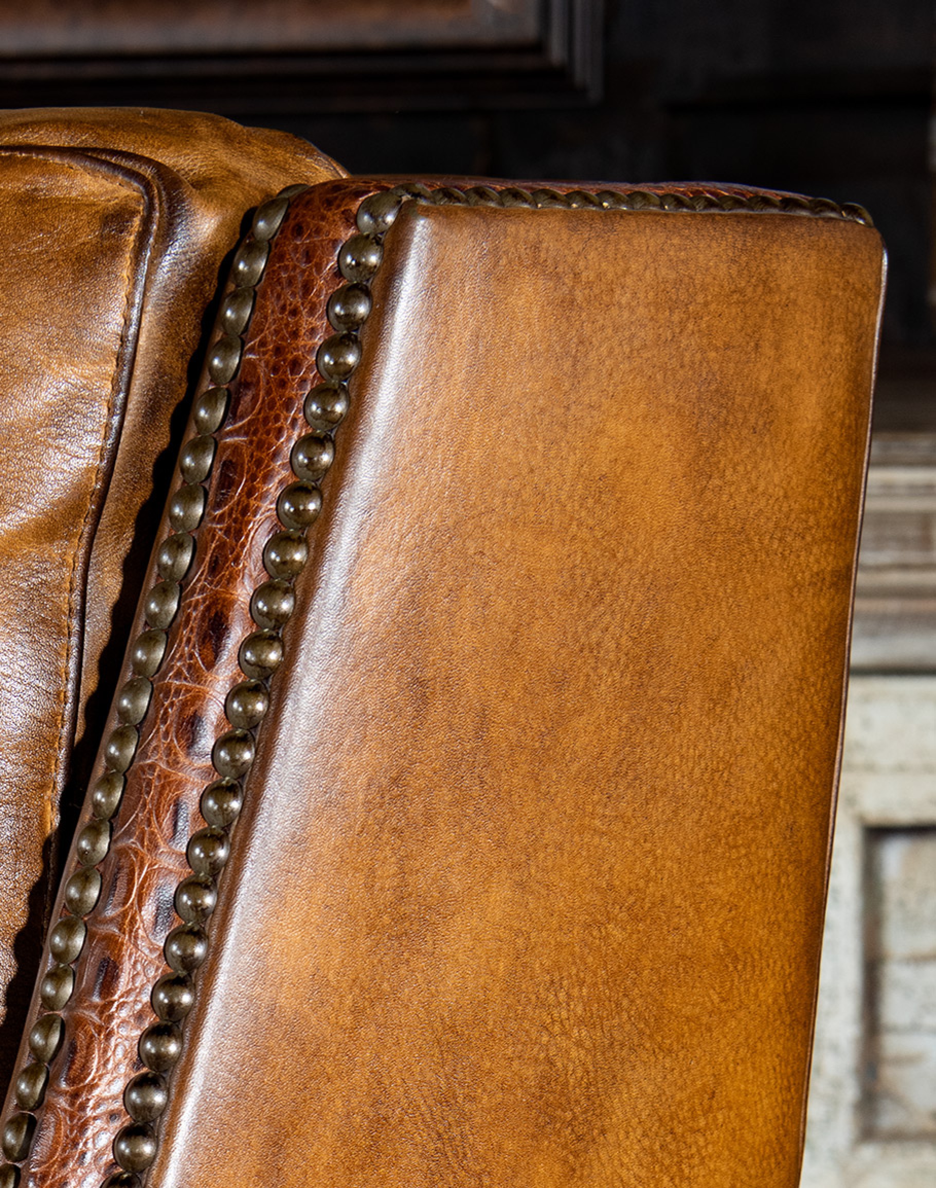 Leather Description: Artisan Leathers beautifully evoke this time worn quality, unique to every individual piece, like the originals. To pure aniline leather crusts, already fully and carefully upholstered to the piece, a base color is created with multiple applications of waxes and oils, hand-worked by the leather Artisan. After drying, this craftsman then carefully builds-up the finish with an expert's eye, and touch, to achieve an aged patina in just the right places to reflect the aged qualities only time, wear, and frequent care could have accomplished naturally.