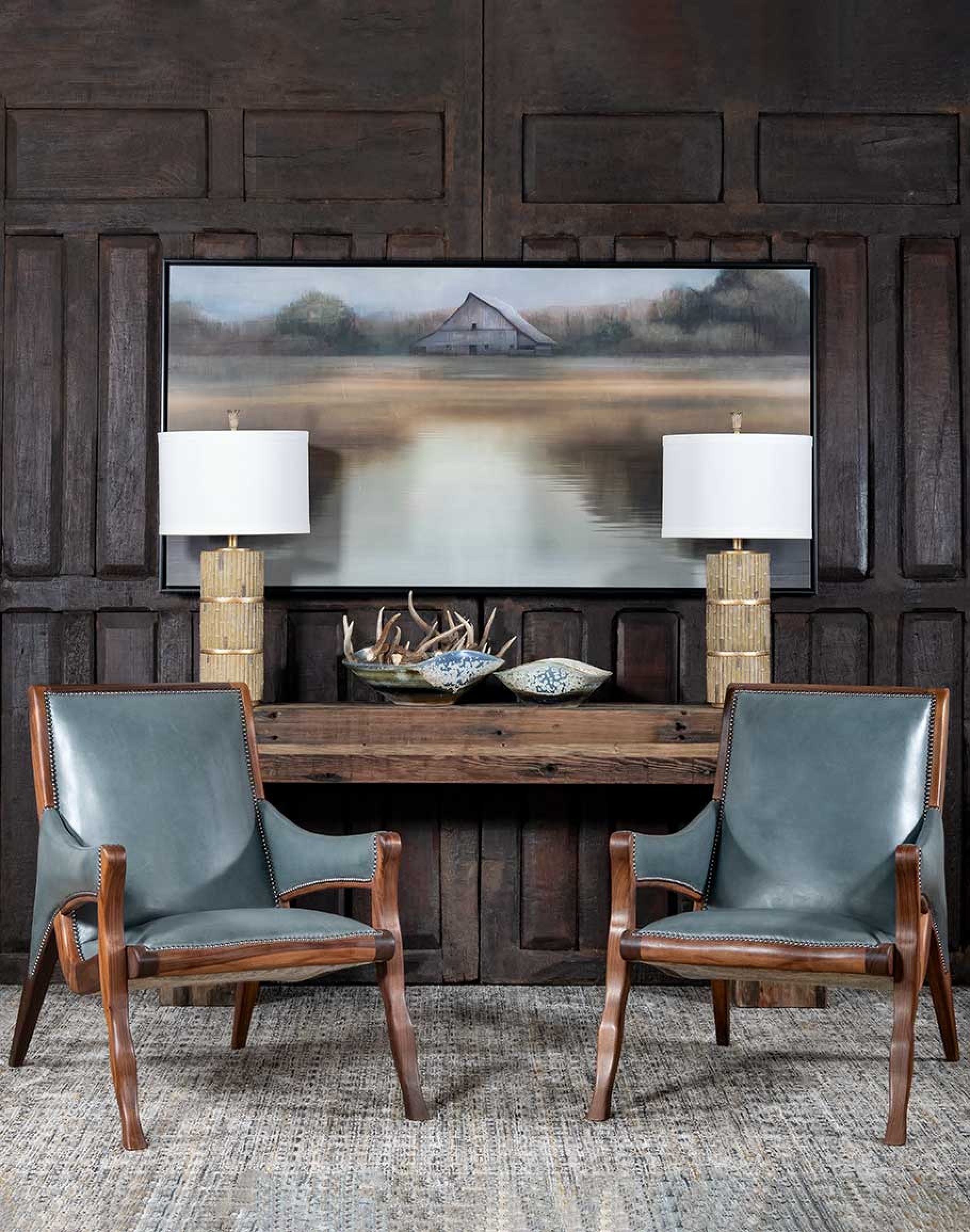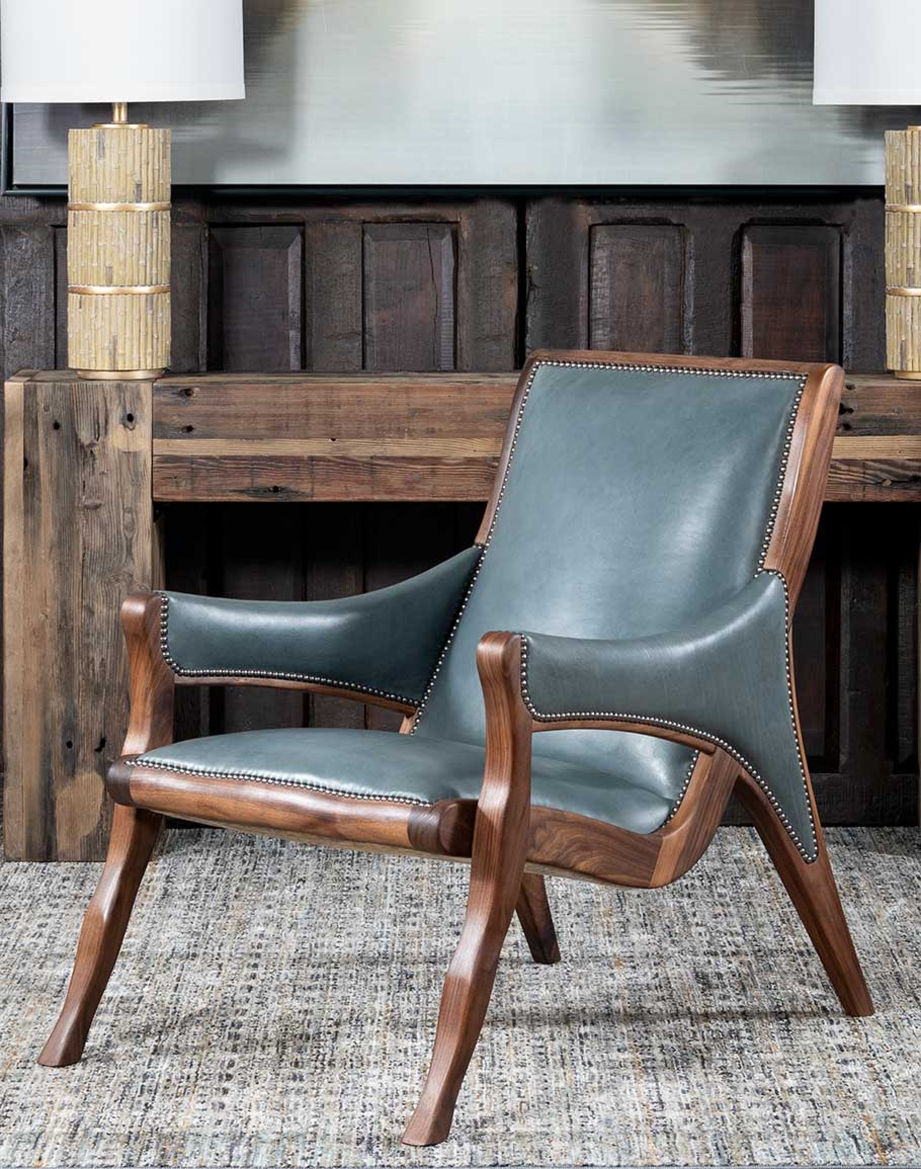 Accentuating the chair’s silhouette are finely placed nickel nail heads, providing a subtle yet sophisticated edge. These details, coupled with the chair’s refined proportions and ergonomic design, make it a perfect addition to any luxury interior, whether it be a coastal ranch retreat or an ecletic ranch vibe.