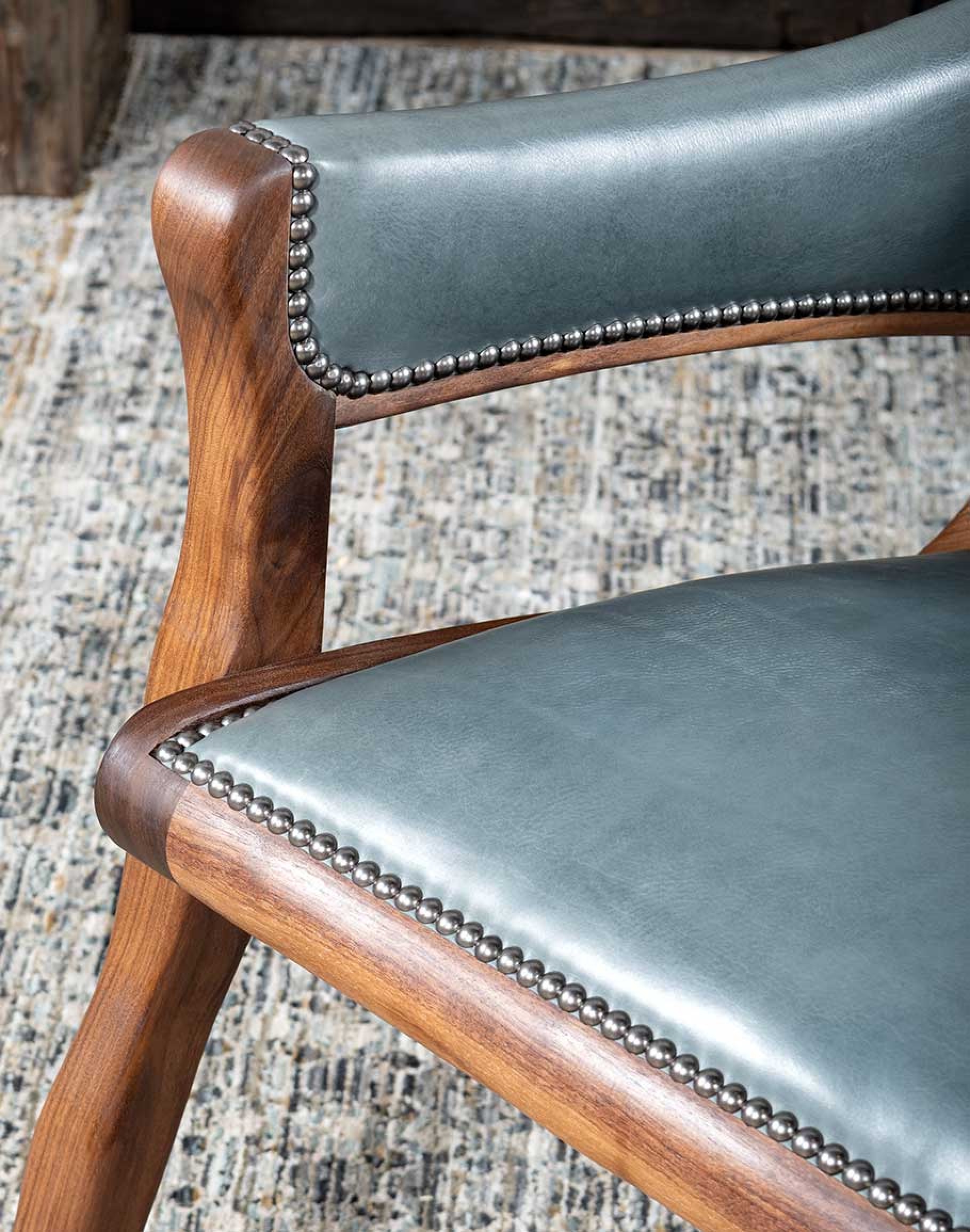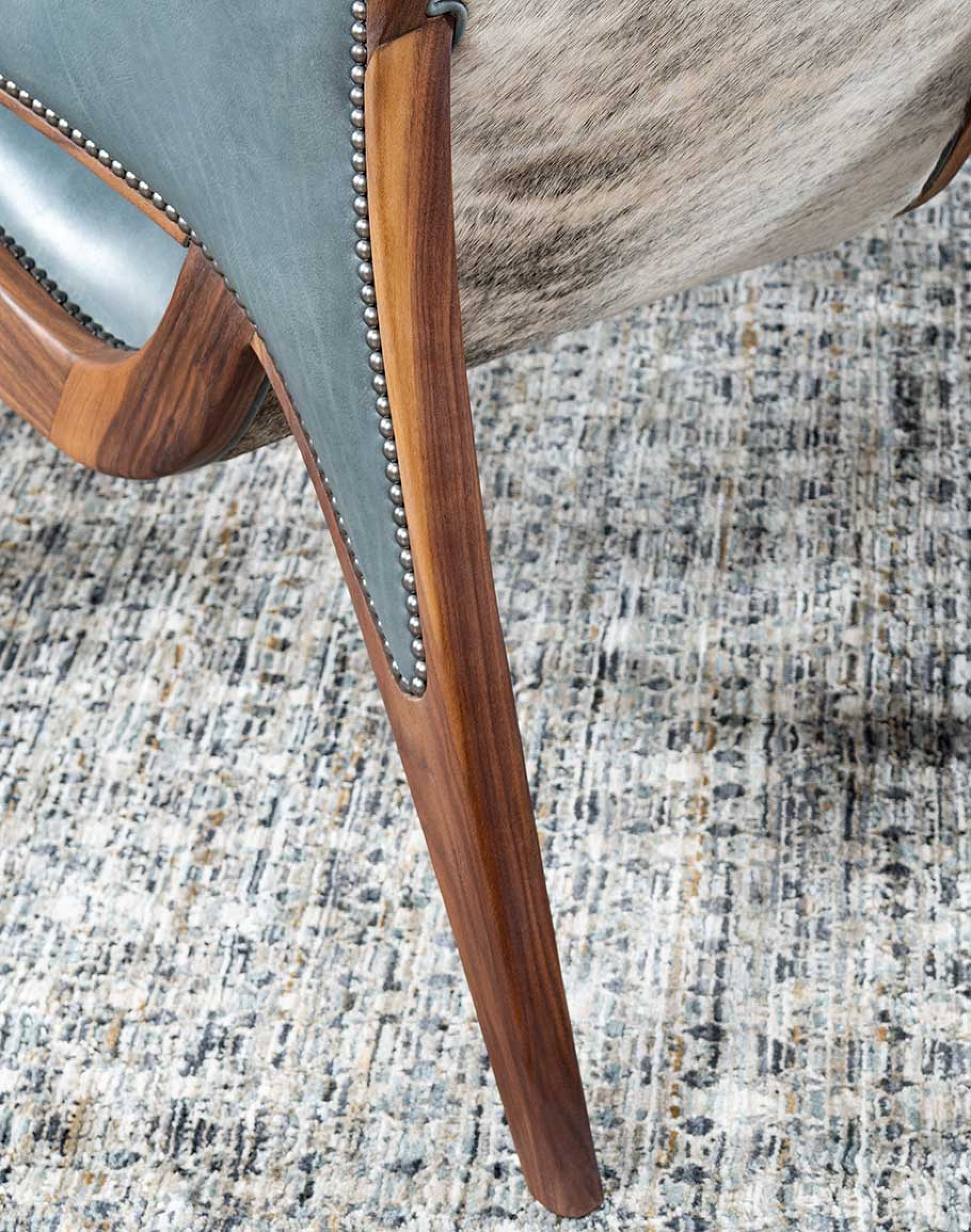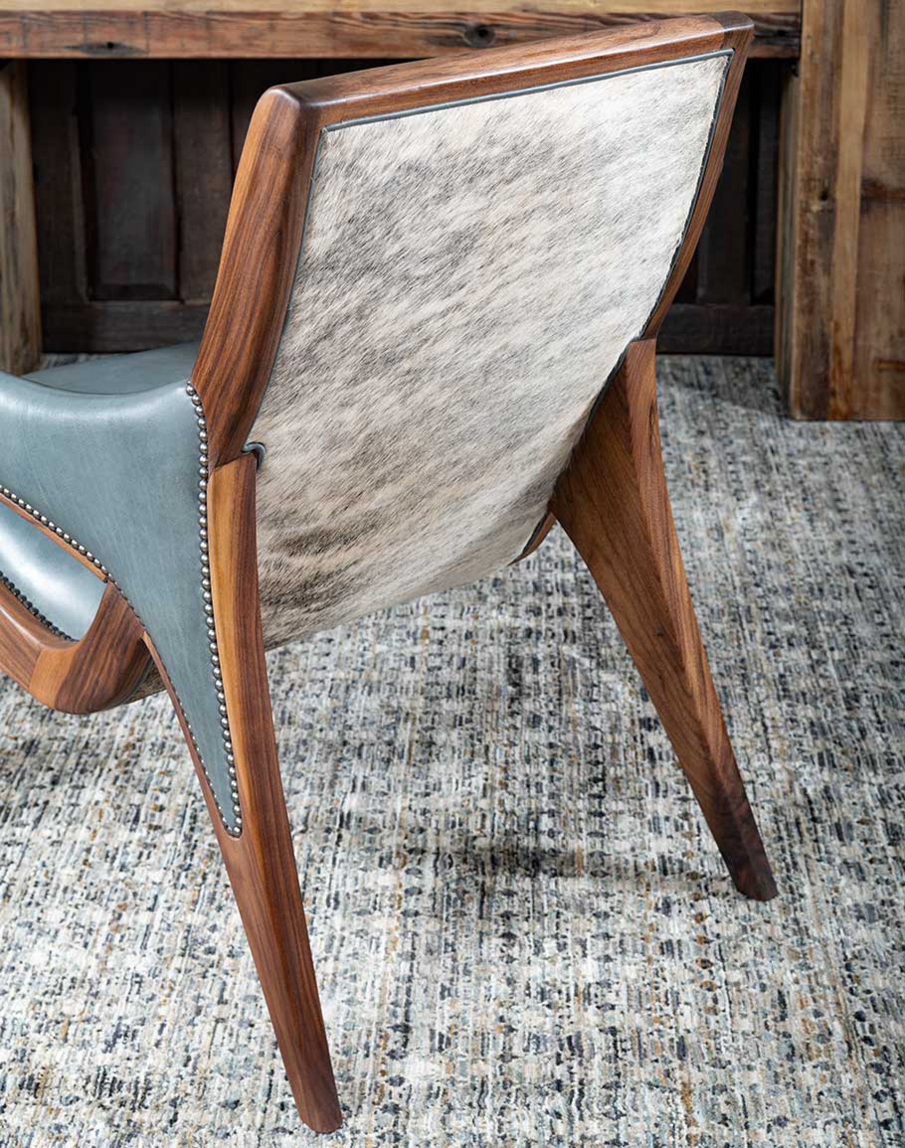 The chair’s solid black walnut frame is beautifully exposed, showcasing the rich, natural grain and adding a touch of warmth to the overall design. The frame’s elegant curves and robust construction reflect a seamless blend of modern aesthetics with classic craftsmanship. The outside back of the chair is adorned with upholstery-grade grey brindle cowhide, adding a striking textural contrast that complements the smooth leather interior. This cowhide accent not only adds to the visual appeal but also speaks to the chair’s superior quality.